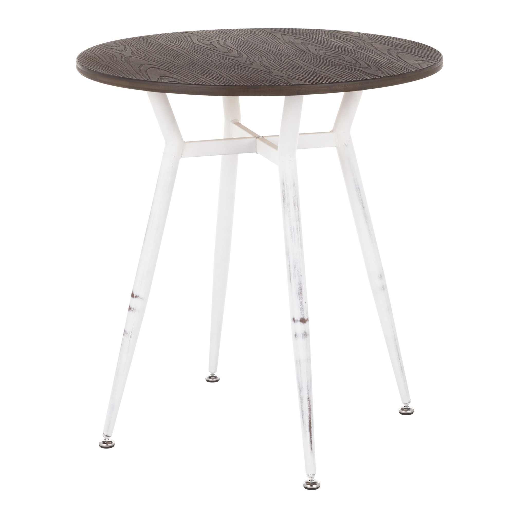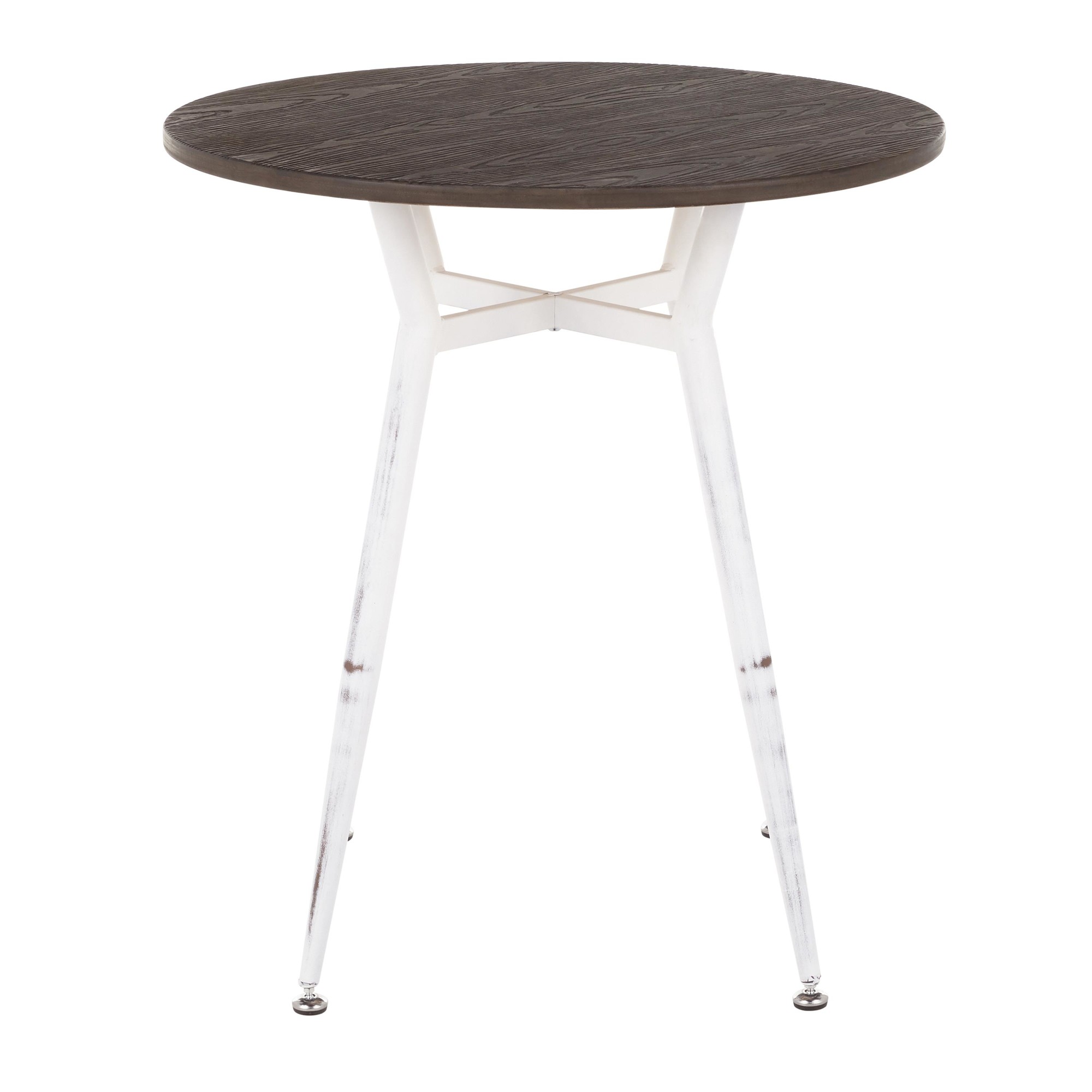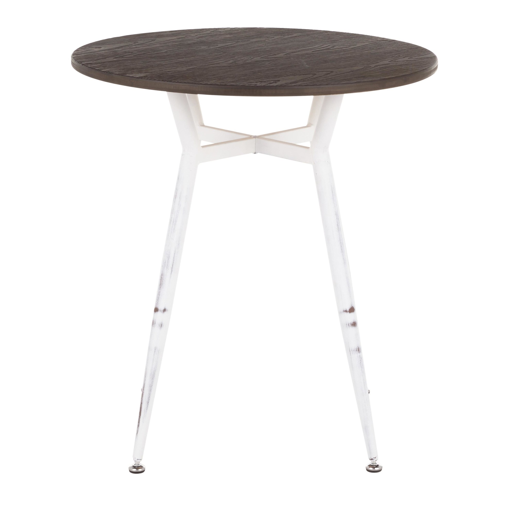 - Features a round wood top.
