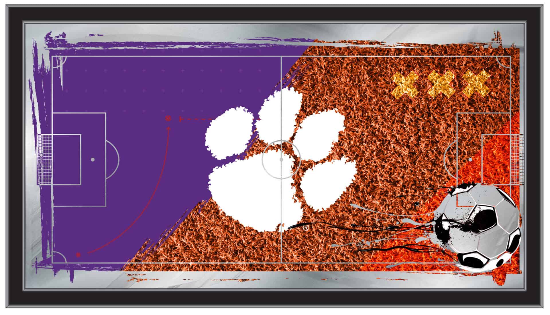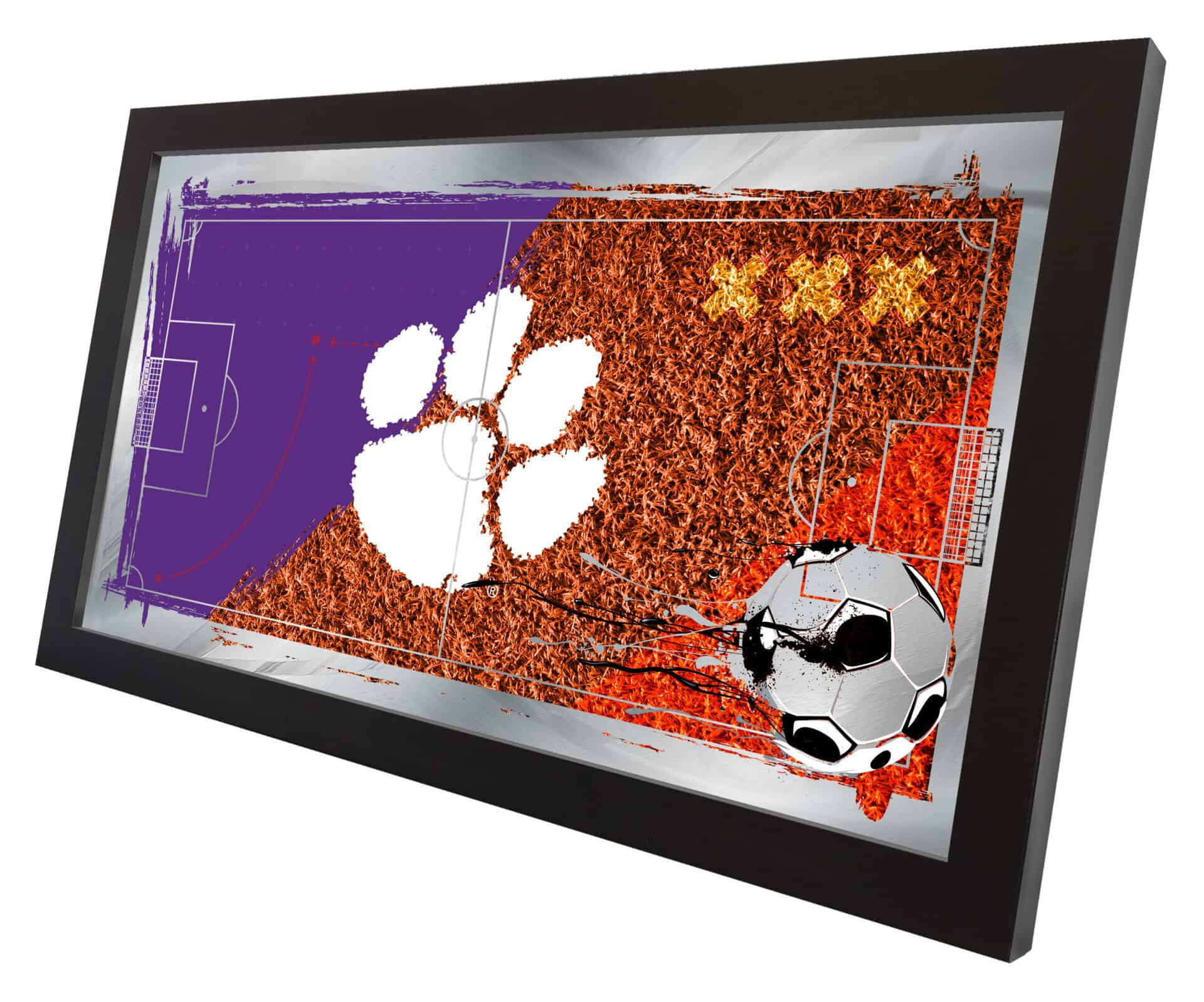 Show your support for your favorite team with the Clemson 26×15 Soccer Wall Mirror. With its simple yet elegant design, vibrant colors burst through the 1/8″ thick glass, beautifully highlighted by mirrored accents. The mirror features a sleek black frame, measuring 1 1/4″ wide, and comes equipped with saw-tooth hangers for easy installation. This versatile 26″(W) x 15″(H) mirror is perfect for your office, garage, or any room in the house. Whether you’re treating yourself or buying a gift for a football fan, you can take pride in owning a quality mirror proudly made in the USA.