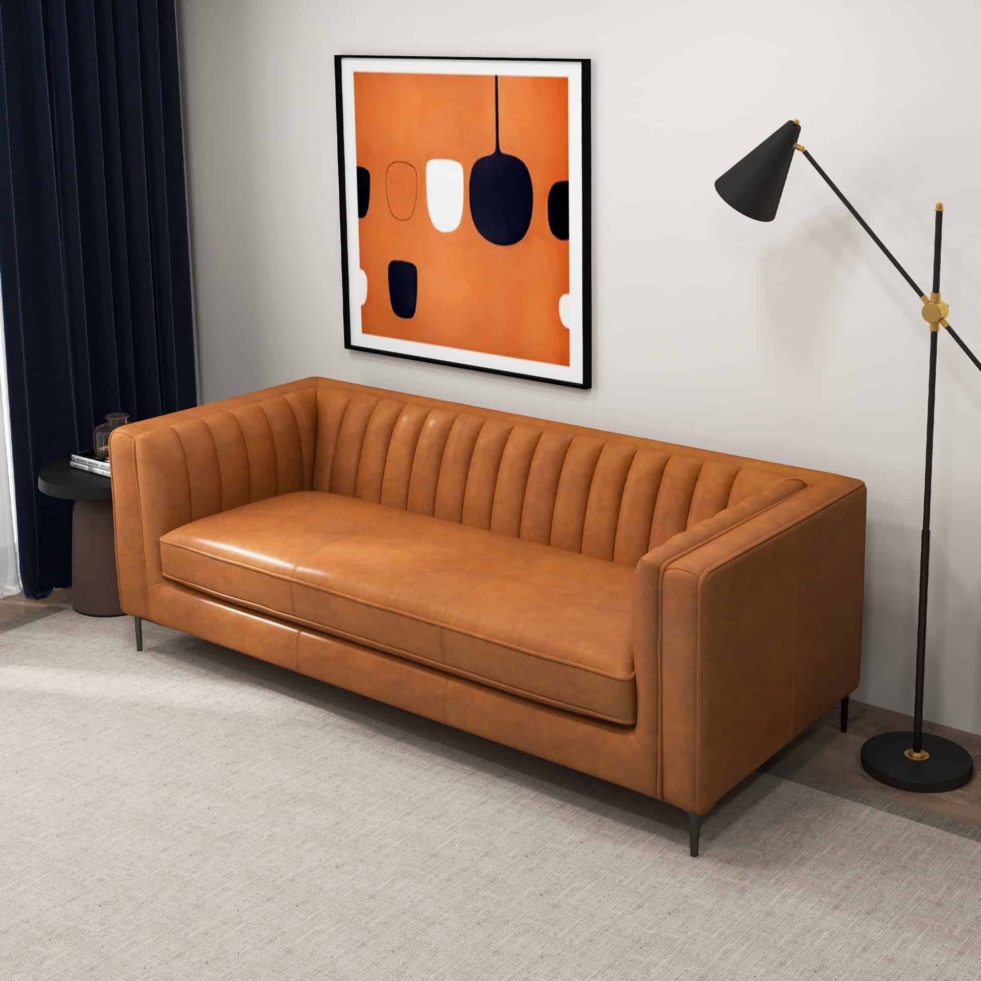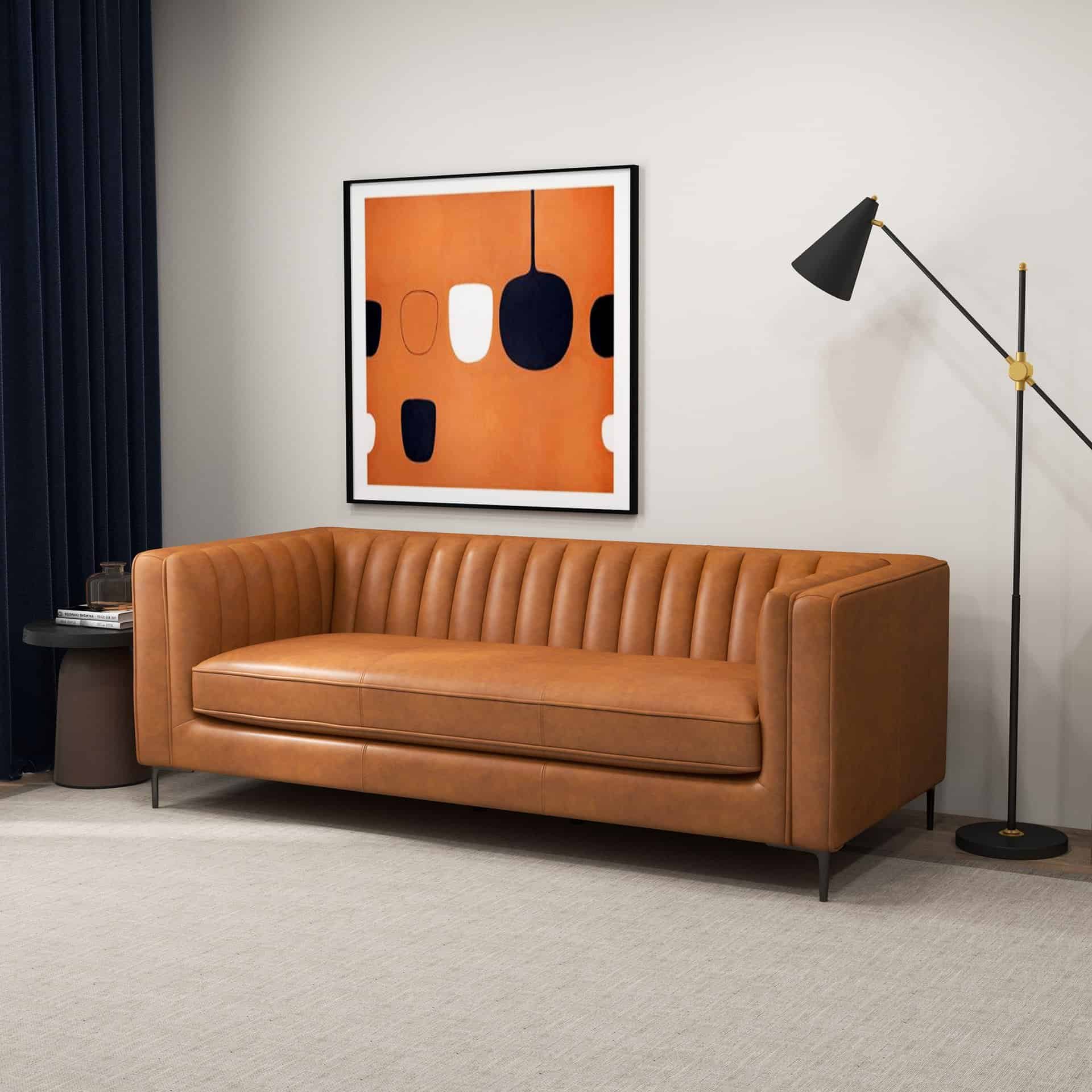 Anchor your space in mid-century modern style with the Cognac Faux Leather Sofa with Mid-Century Modern Design. Combining durable, top-quality craftsmanship and high-density foam, this sofa delivers exceptional comfort and functionality. Its sleek design makes it an ideal centerpiece for your living room, den, urban loft, condo, or home office. Crafted with easy-to-clean vegan leather, it is both stylish and practical. The removable legs allow for easy delivery through tight spaces. Available in a variety of timeless colors, this sofa is designed to complement any decor.