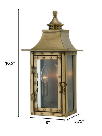 The Colonial Style Aged Brass Wall Light with Clear Glass is a stunning addition to any space, embodying the timeless elegance of Colonial America. Expertly hand-crafted from solid brass, this wall light is reminiscent of classic gas lanterns, featuring authentic construction details such as hammered rivets and soldered joints. The clear glass panes ensure optimal light diffusion, making it both a functional and stylish lighting solution. Pre-assembled for easy installation, this wall light is perfect for enhancing the ambiance of your man cave, entryway, or outdoor space.