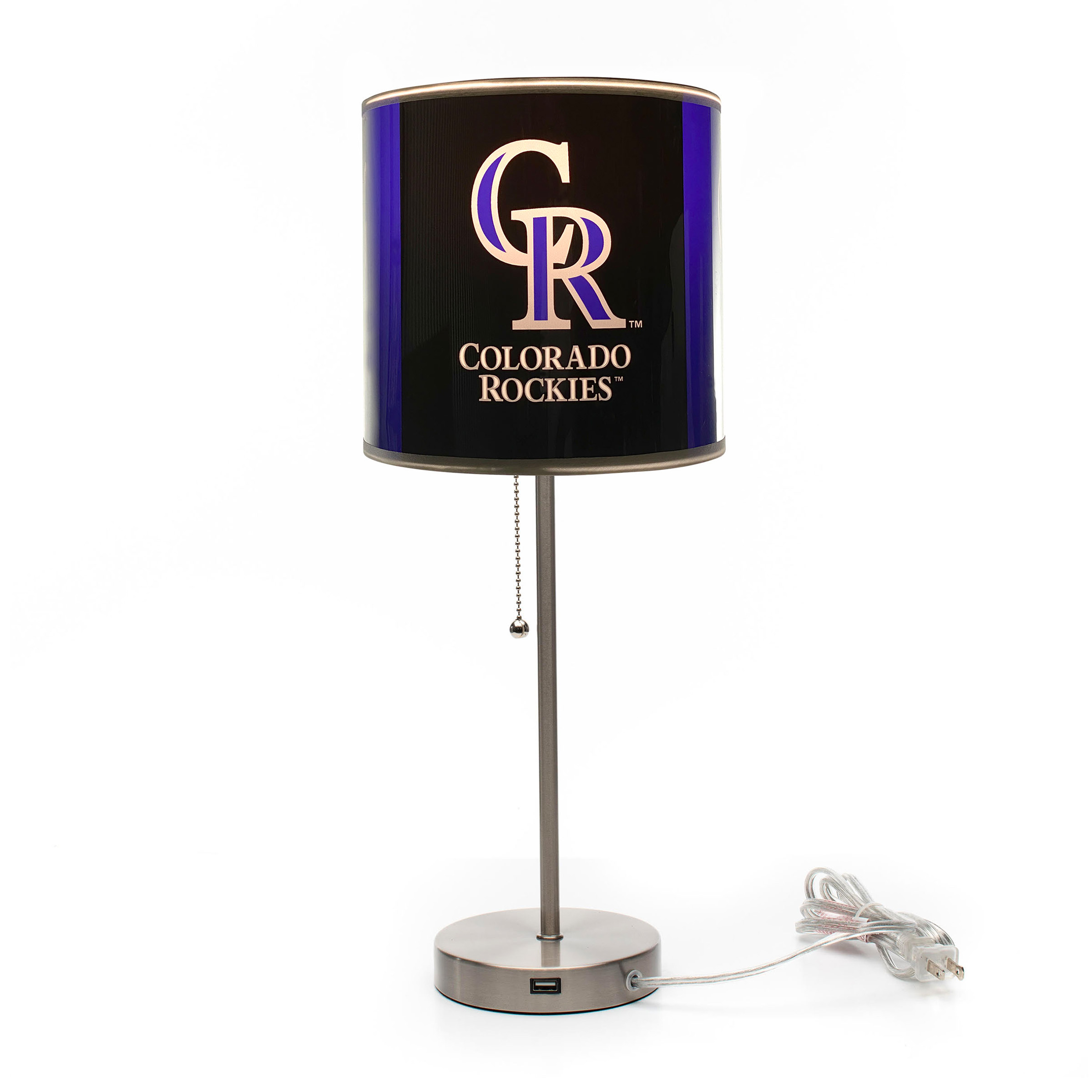 This sleek chrome lamp, featuring a USB charging station, adds both functionality and team spirit to any room. The lamp includes a clear vinyl shade with a vibrant team-themed insert. Its patented lampshade program also allows for easy and affordable décor changes with a variety of stand-alone insert designs.