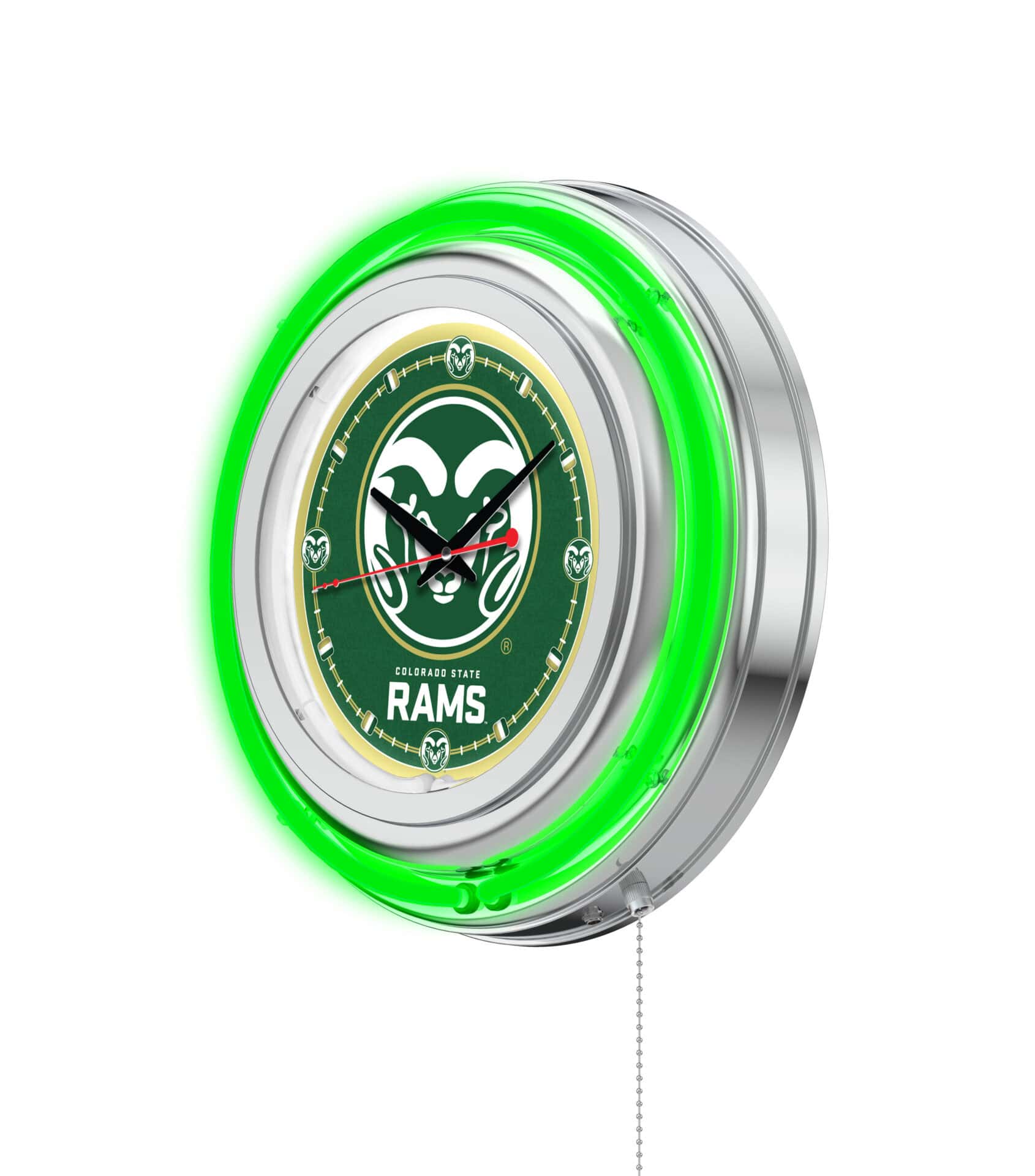Show off your school spirit with the Colorado State University 15-Inch Neon Logo Clock in Chrome. This eye-catching clock features a sleek chrome casing and a vibrant neon outer ring in team colors, complemented by a custom-printed clock face illuminated by a brilliant white inner neon ring. Perfect for man caves, dorm rooms, or any space that needs a touch of team pride, this clock combines functionality with style. The neon rings are easily controlled with a pull chain, and the clock is powered by a UL-listed transformer for safety. With accurate quartz movement and a durable design, this clock is a must-have for fans and alumni alike.