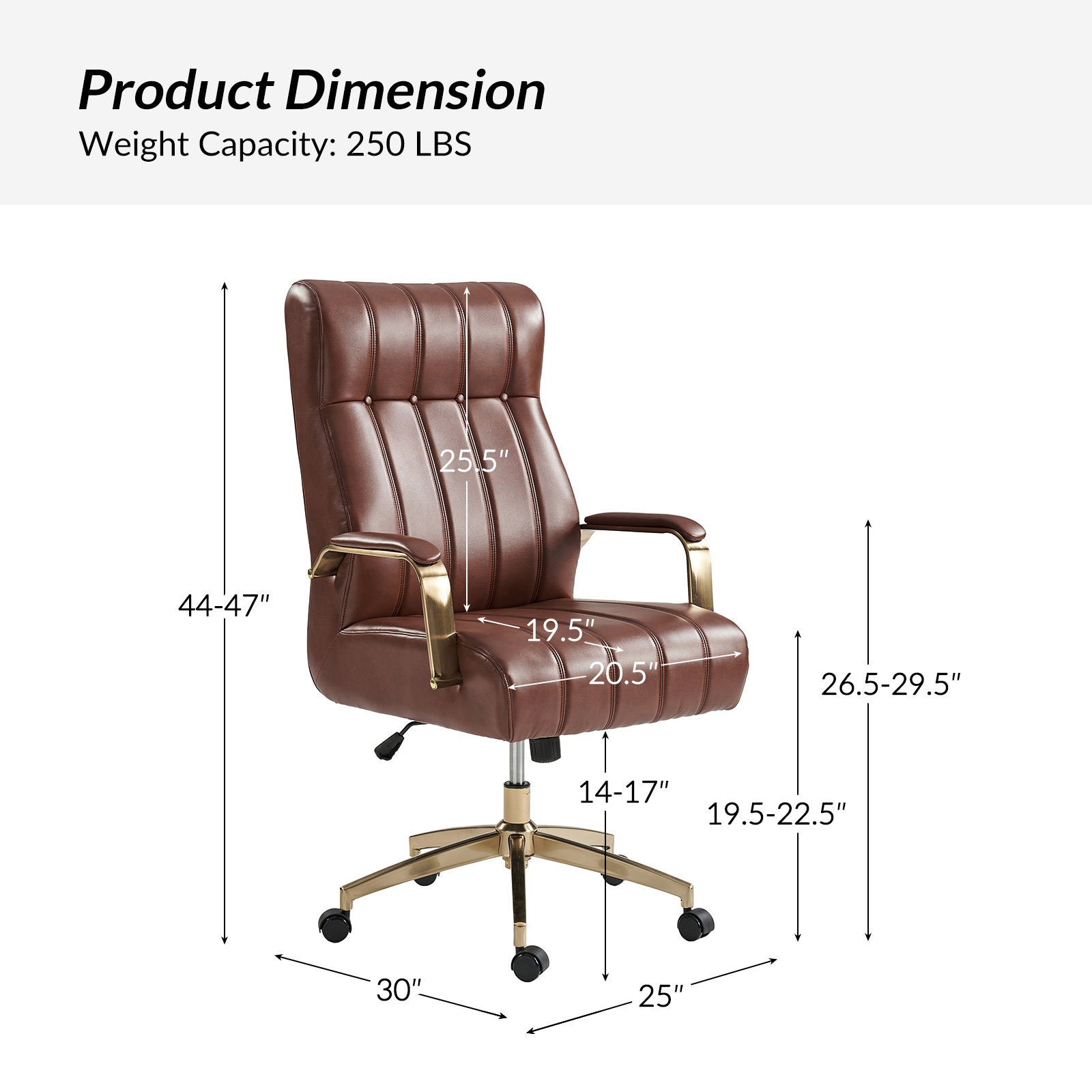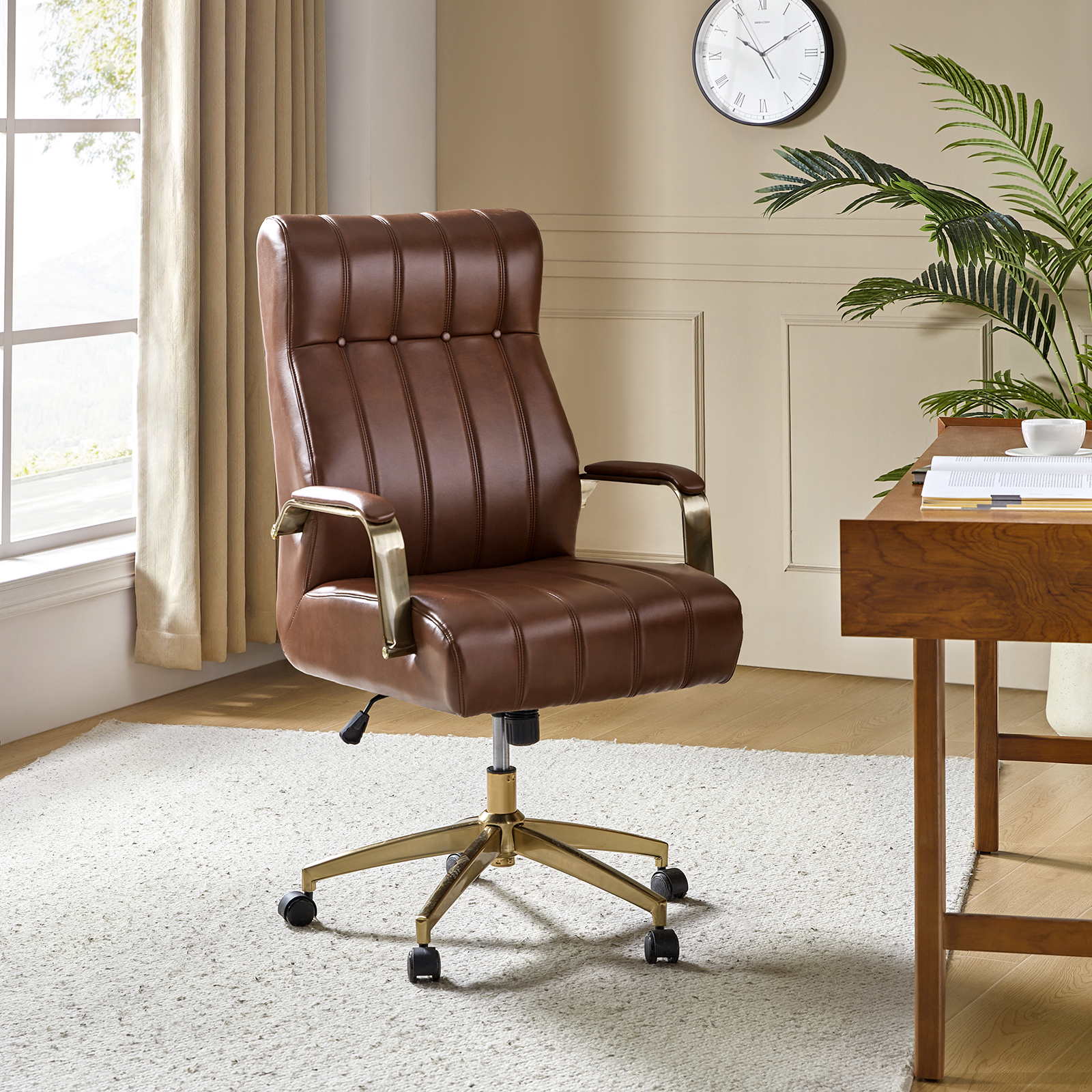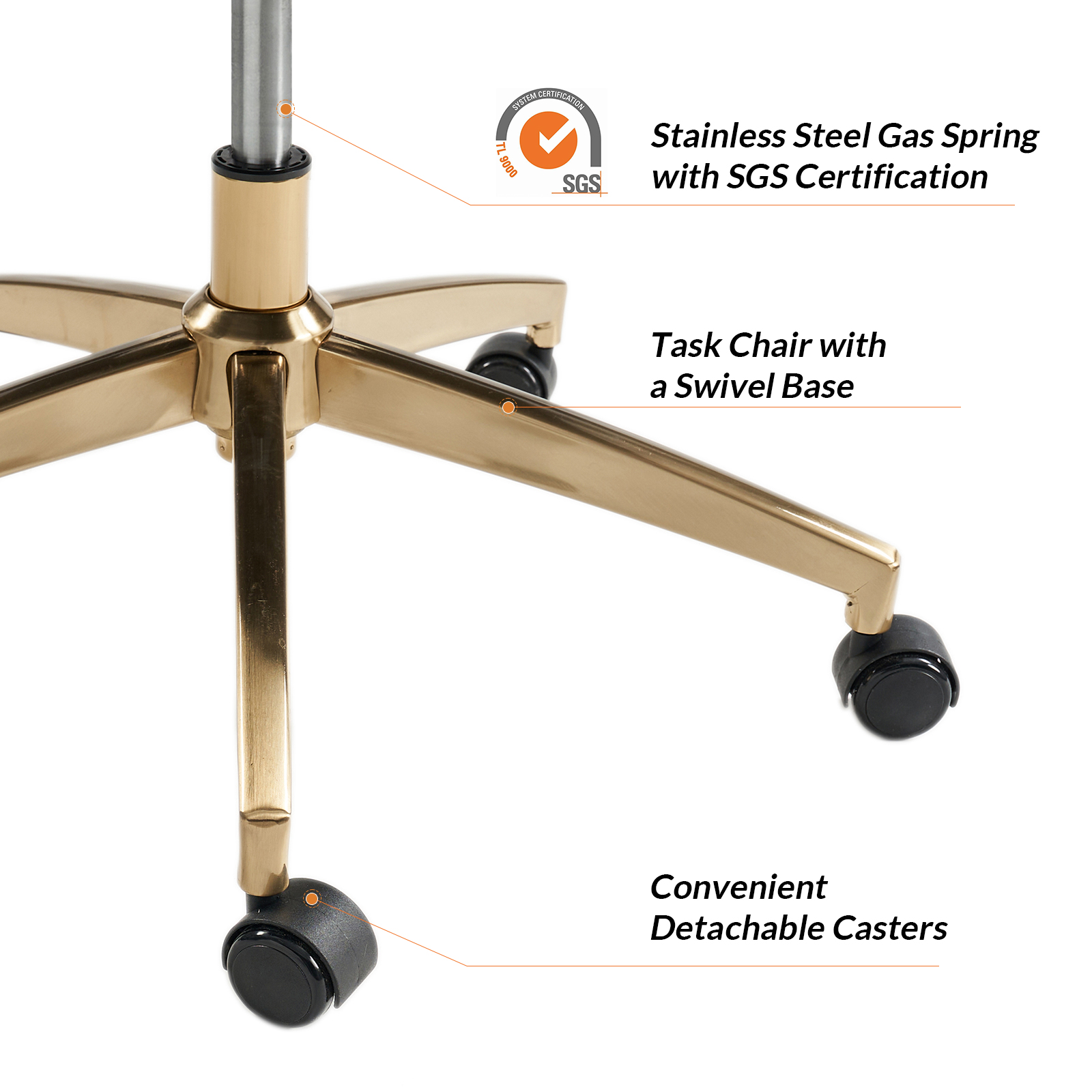 Experience superior comfort with the chair’s channel-tufted seat and button-tufted backrest, designed for both style and ergonomic support. Take advantage of the tilting function for a subtle rocking motion that alleviates stress. Move freely around your workspace thanks to the sturdy metal base with casters and the convenient swivel seat. The adjustable gas spring, ensures smooth height adjustments to meet your individual needs. The chair’s blend of modern and mid-century aesthetics, complete with sophisticated champagne gold hardware, adds a touch of vintage charm to any office.