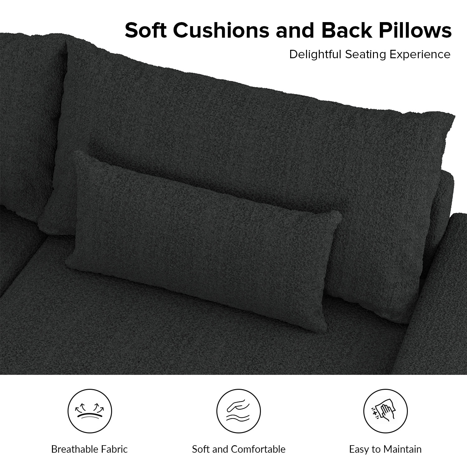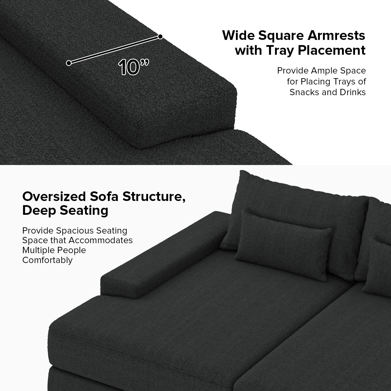 This sofa features wide square armrests, providing convenient space for snacks and drinks. The oversized design ensures ample seating for everyone, while the plush cushions and back pillows offer a delightful seating experience. Its contemporary style, with clean lines and a modern aesthetic, seamlessly blends into various living spaces, enhancing your home’s overall aesthetic.