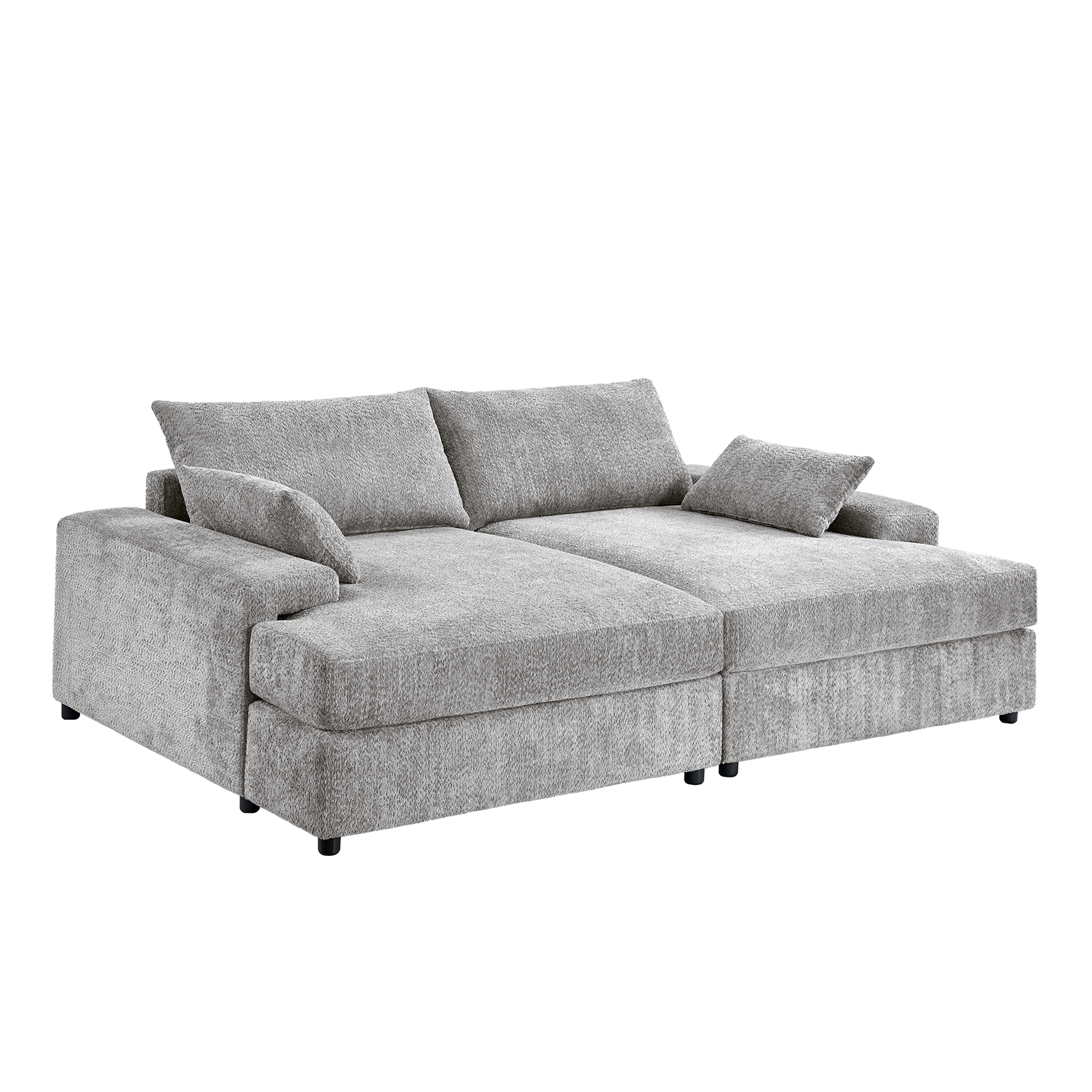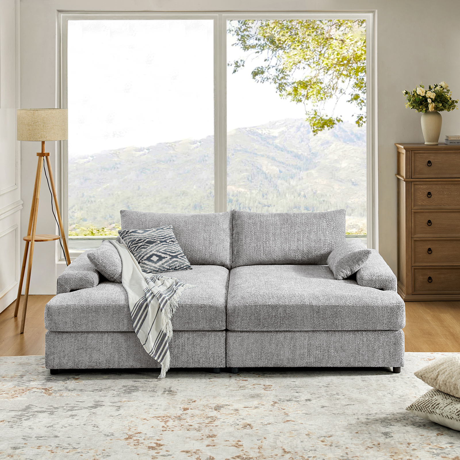 This oversized modern chenille deep seating sofa is designed for ultimate relaxation, perfect for movie nights or cozy gatherings. The wide square armrests provide space for snacks and drinks, while the soft cushions offer a delightful seating experience. Sink into the deep seat and unwind after a long day. With its sleek silhouette and clean lines, this sofa seamlessly blends into any living space, enhancing your home’s aesthetic.