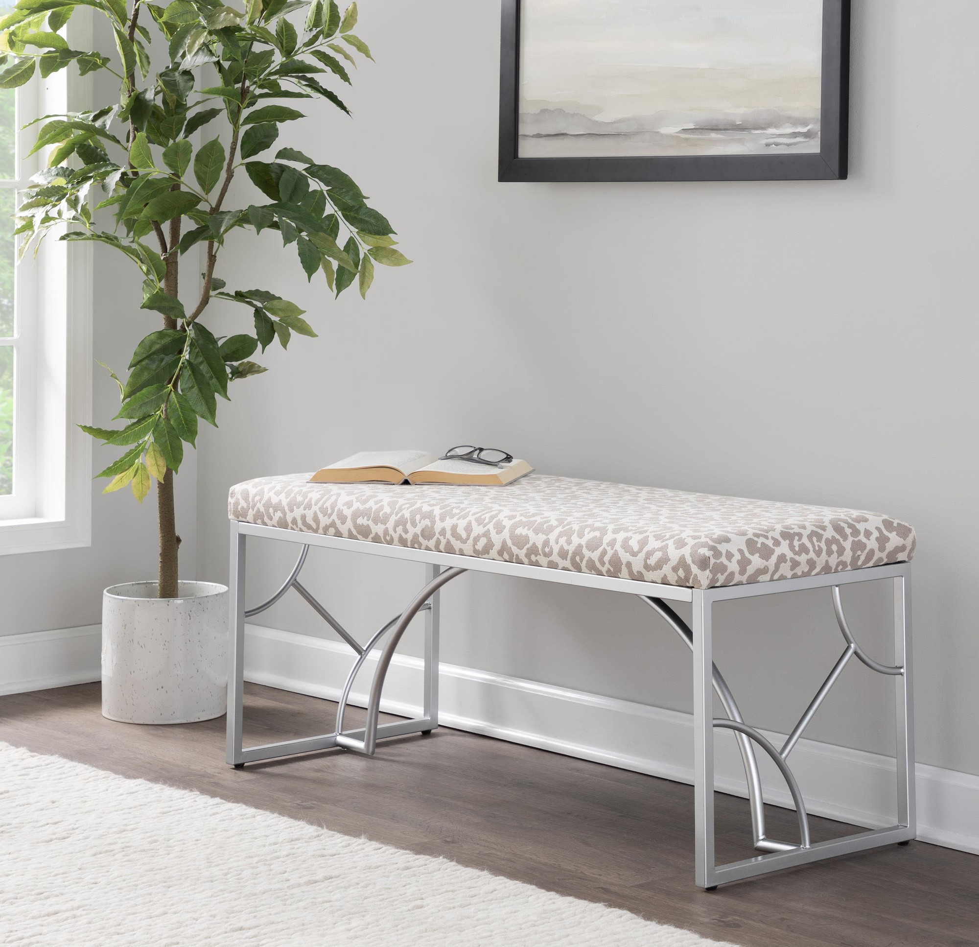 The Constellation Bench is a unique statement piece that adds modern elegance to any space. Its geometric silver metal frame and plush, padded, upholstered cushion provide both style and comfort. This bench is perfect for adding a touch of sophistication to your entryway, bedroom, or dining area.