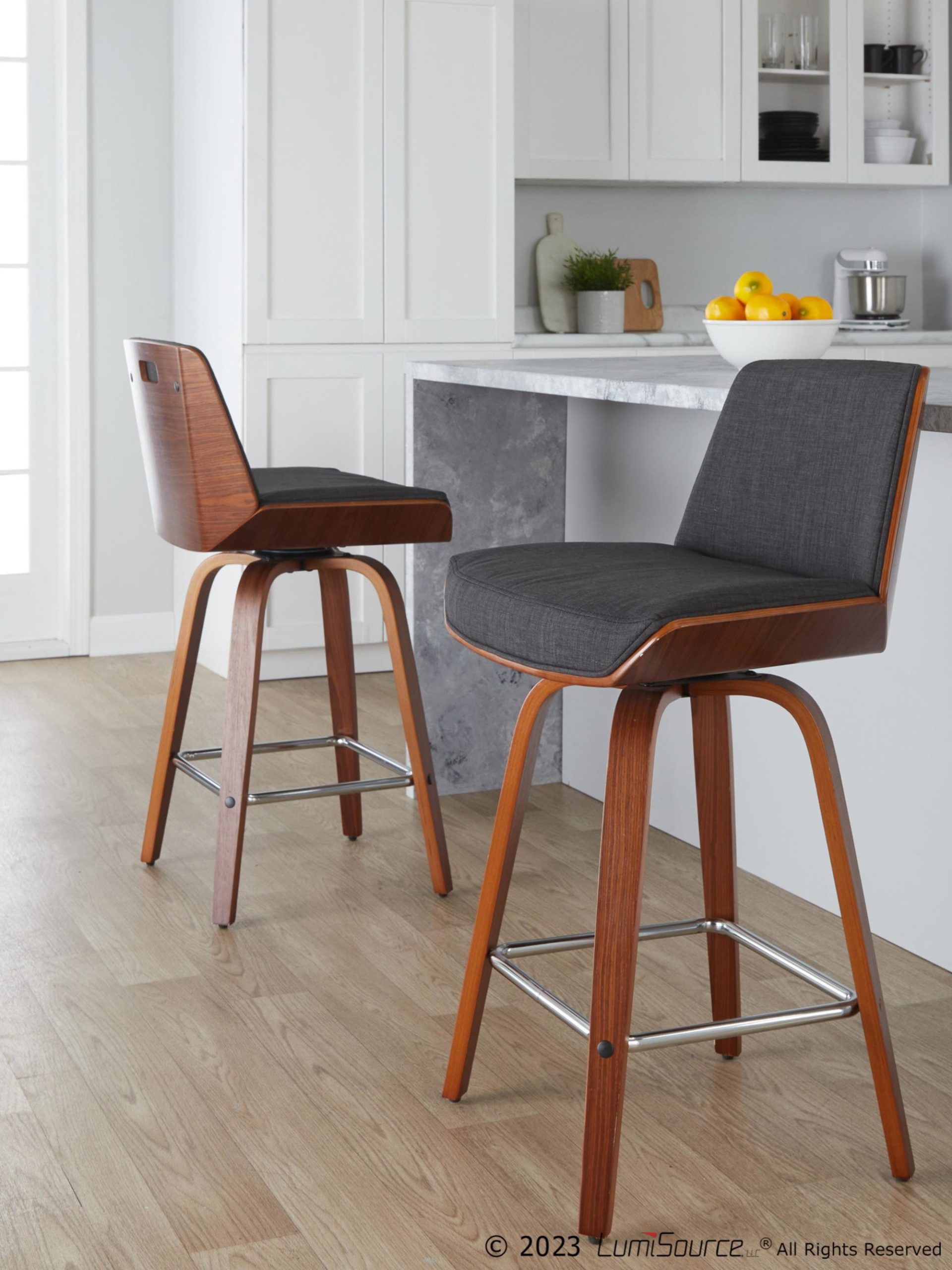 The Corazza 26-Inch Mid-Century Modern Charcoal Swivel Counter Stools invite you to sit back and relax. With their comfortable upholstered seats, swivel functionality, and convenient footrests, these stools seamlessly blend modern design with practicality. Available in various colors, these stools are the perfect addition to any space.