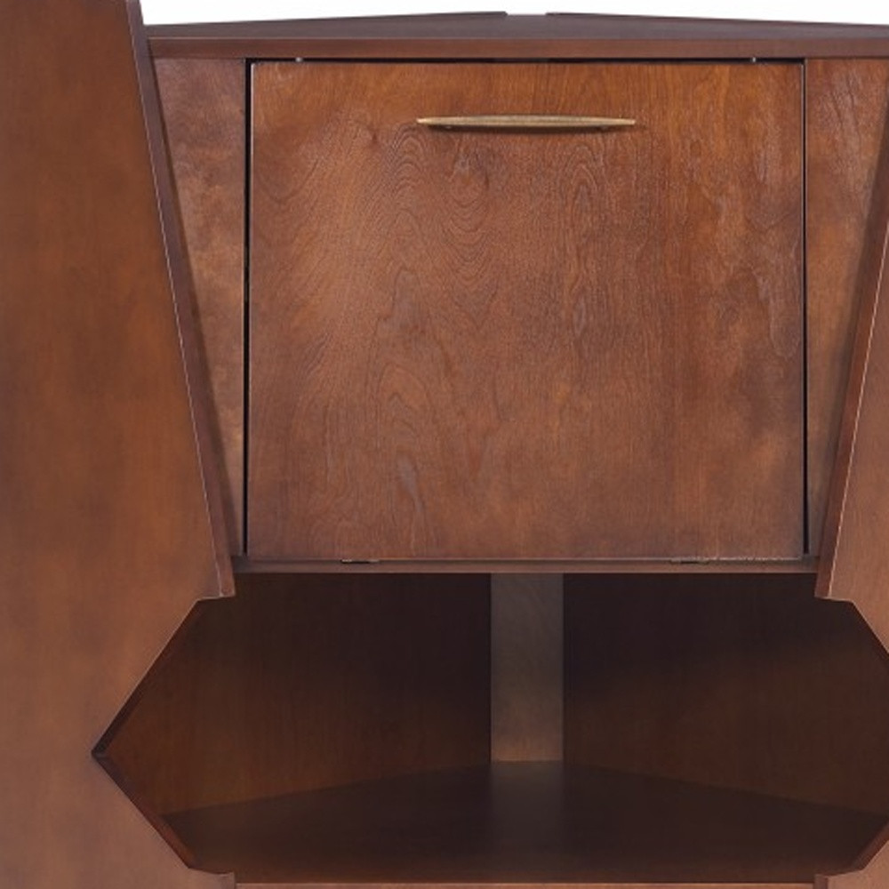 Add a touch of fun and modern flair to your space with the Cosmo Brown and Black Contemporary Corner Bar Cabinet. Designed to be both stylish and functional, this compact corner cabinet is perfect for organizing your bar essentials while enhancing your room’s aesthetic. The easy-open front door folds down to reveal storage for bottles and accessories, doubling as a serving shelf. A mirrored back wall adds a sophisticated touch, while open cubbies and three pull-out drawers provide ample space for display and organization. The geometric side panels add a contemporary vibe, making this cabinet a chic addition to any room.