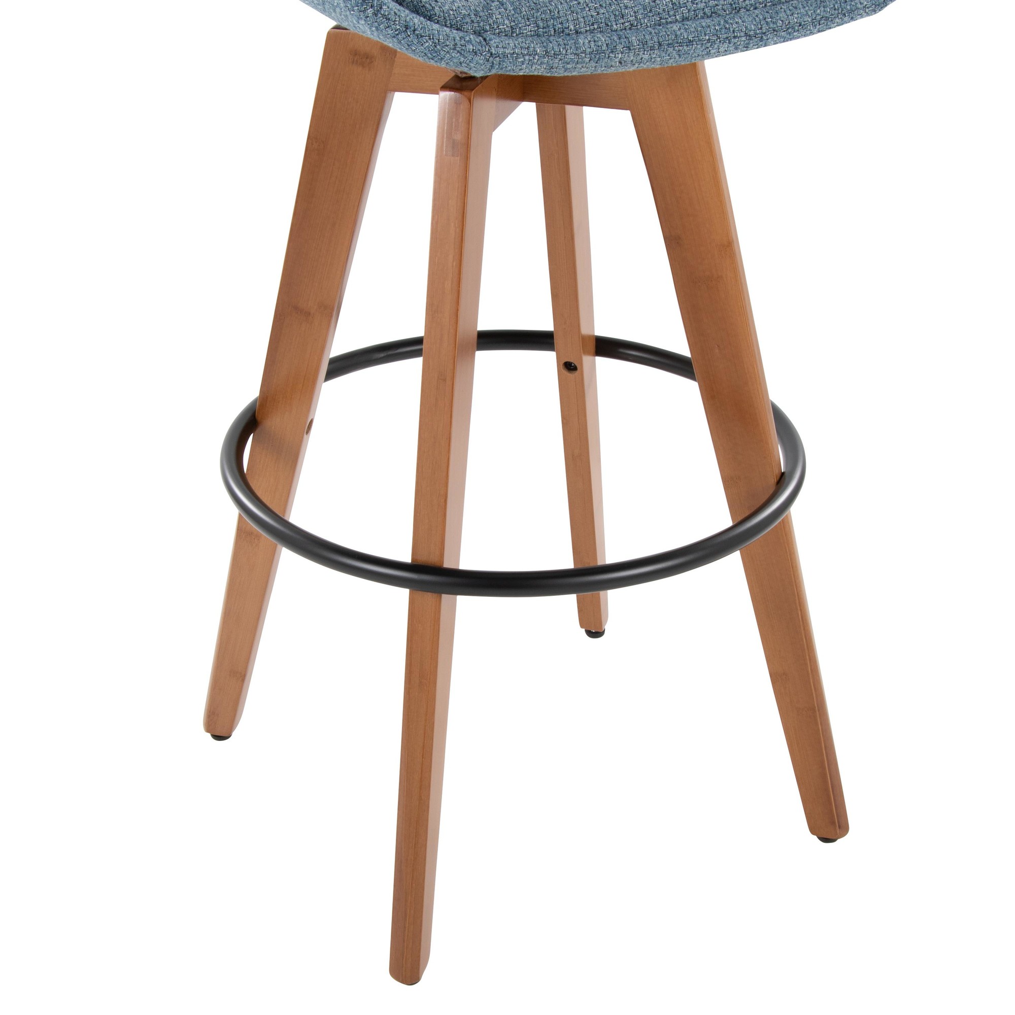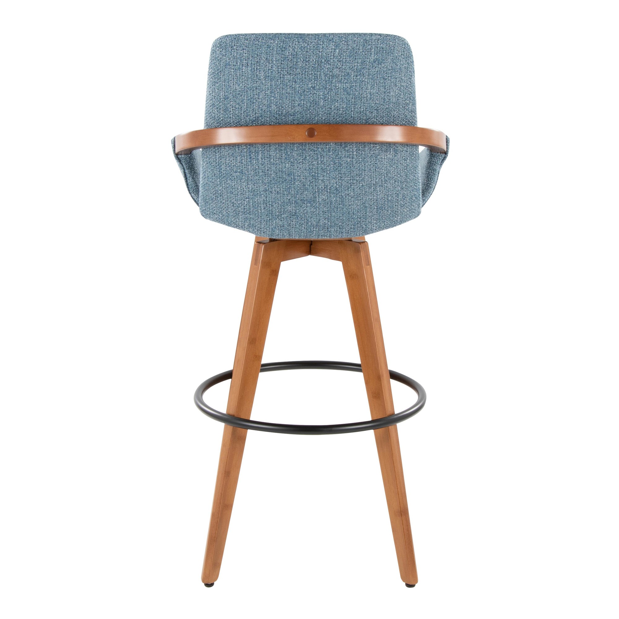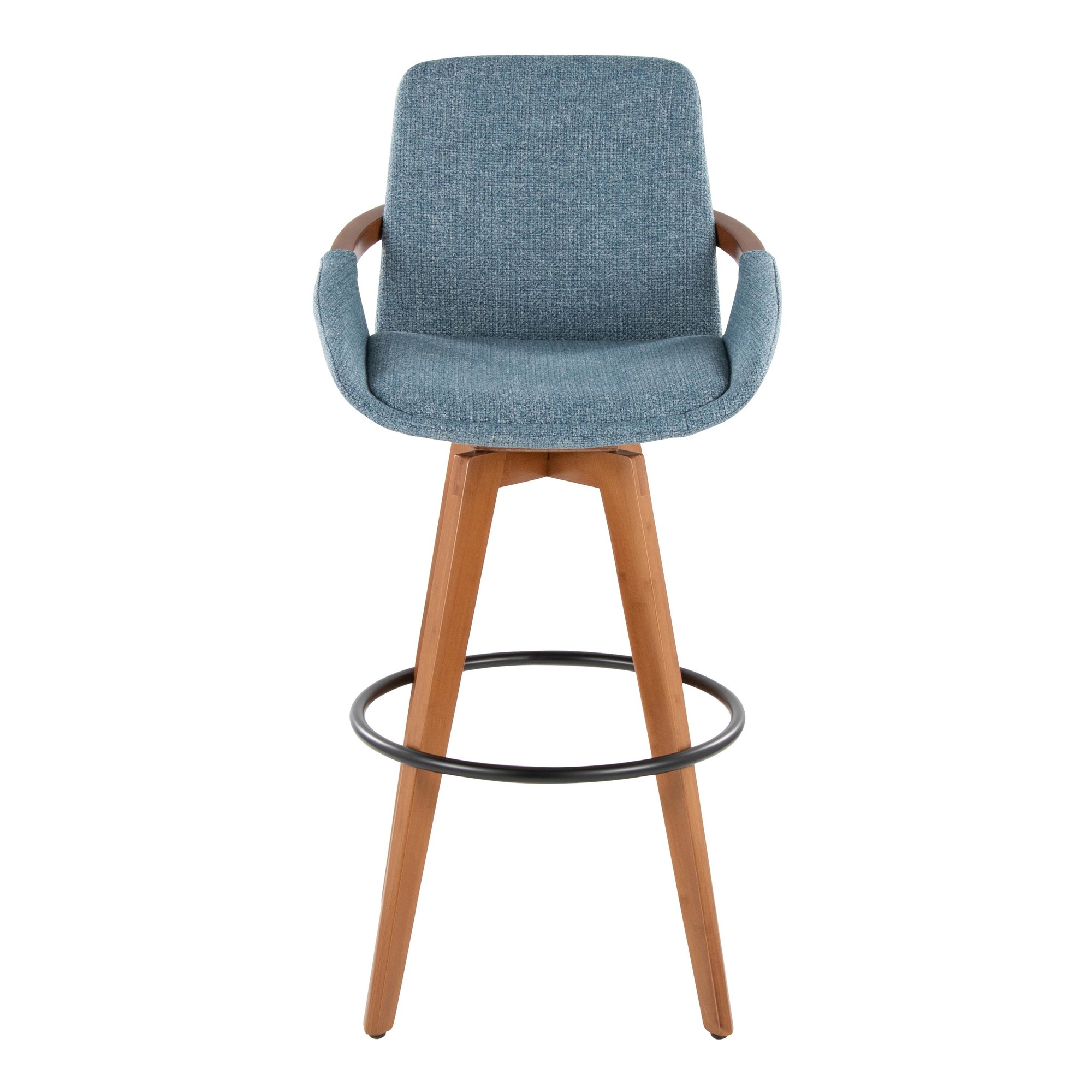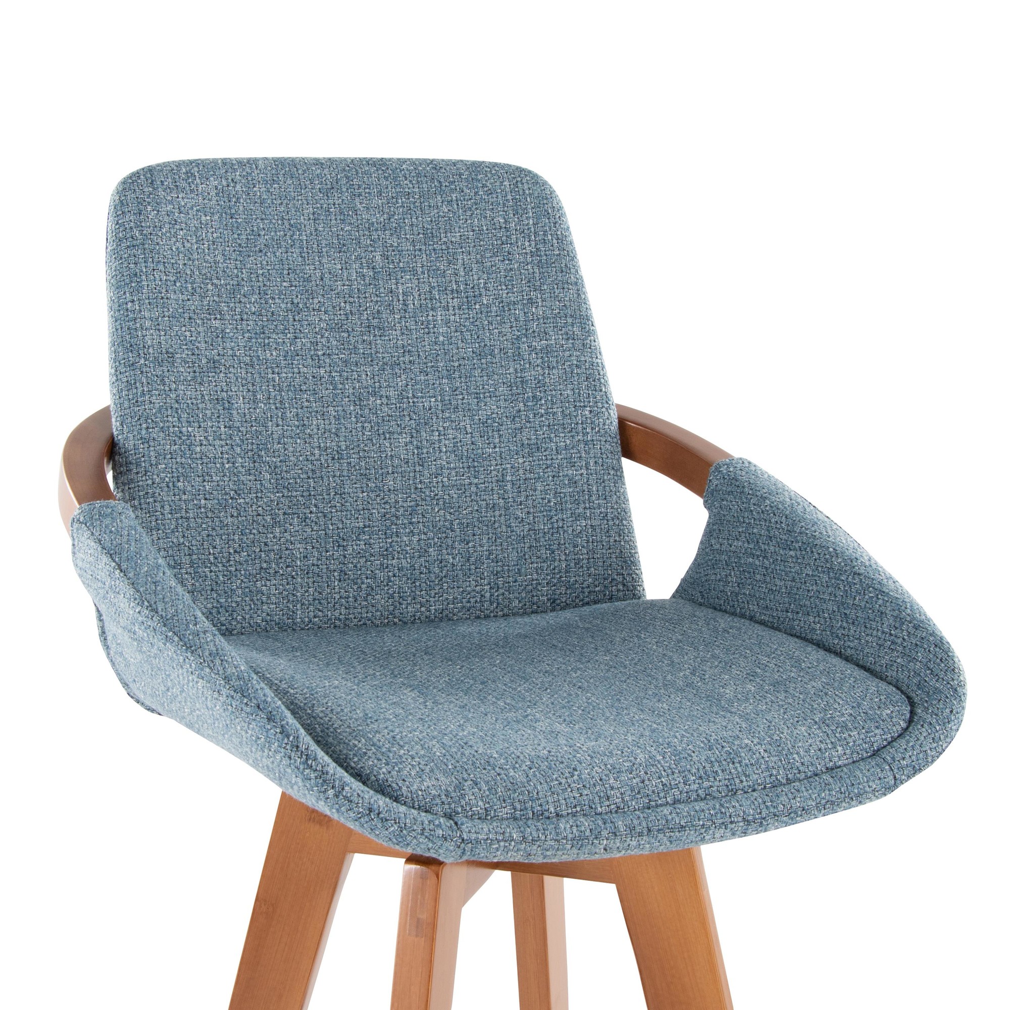 The Cosmo Mid-Century Blue Noise 29-Inch Swivel Barstool combines style and comfort with its mid-century modern design! This barstool features an upholstered seat, stylish walnut bamboo armrests and legs, and a smooth swivel. It’s the perfect addition to your man cave bar!