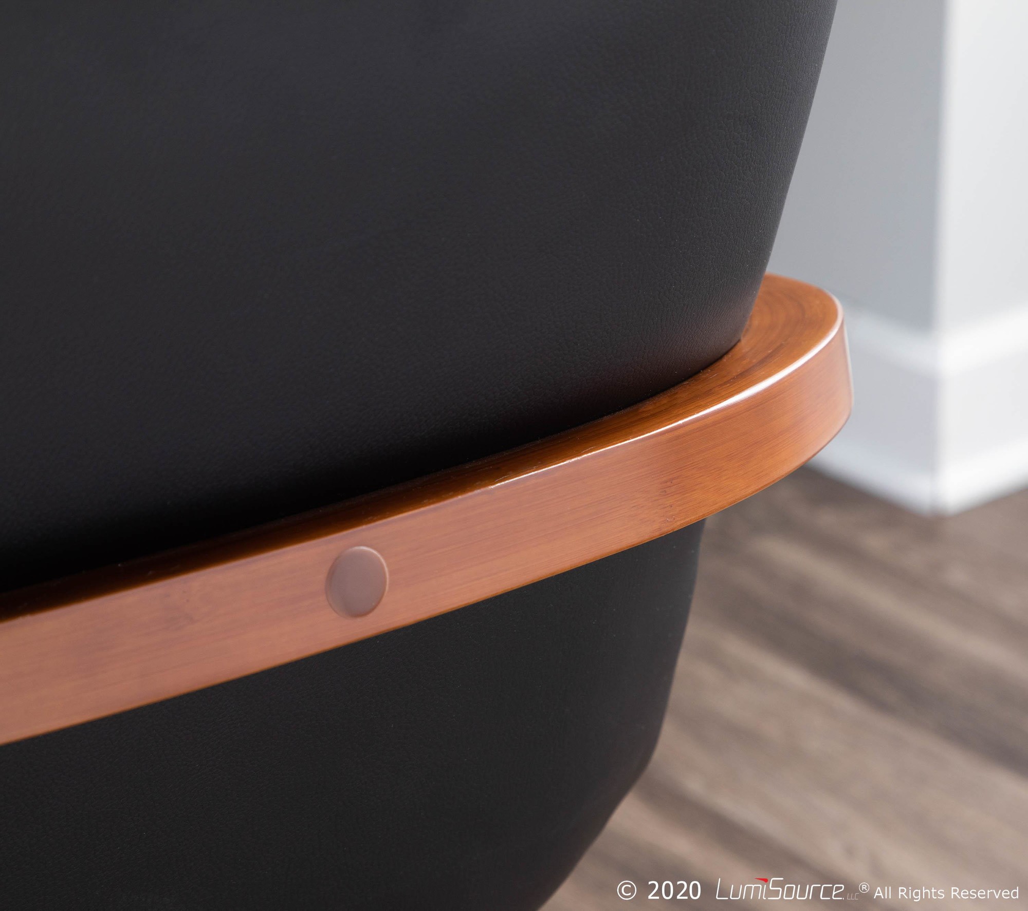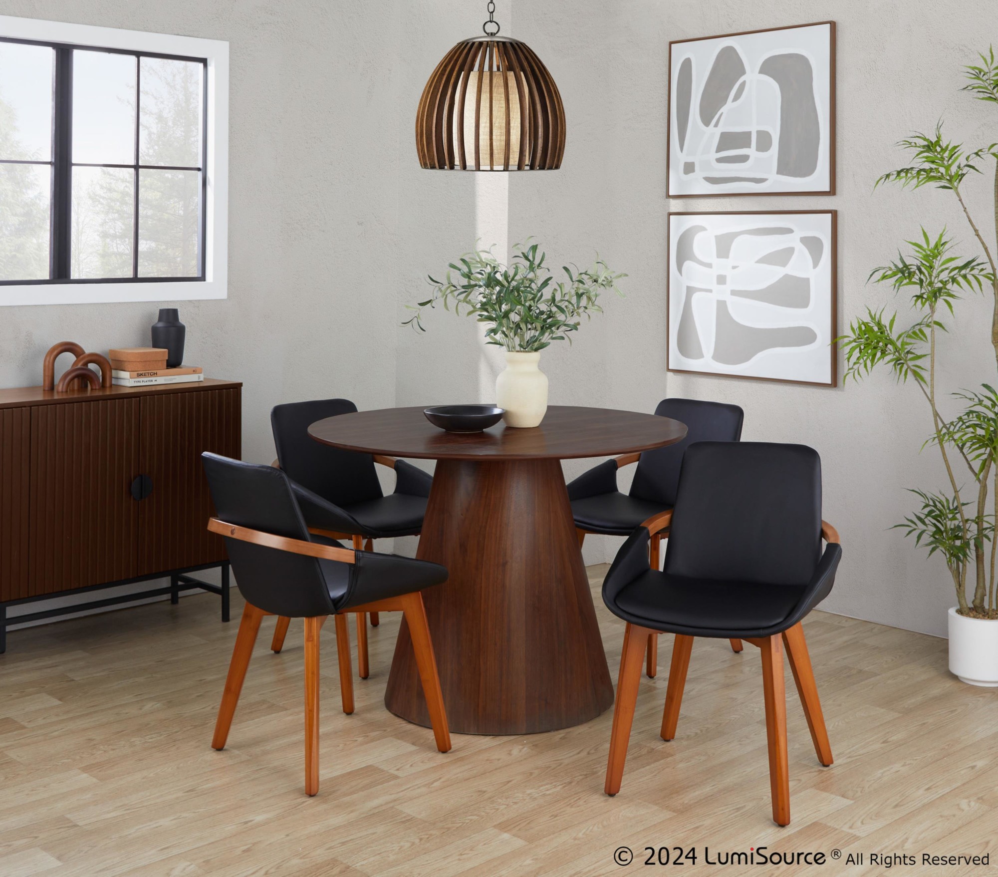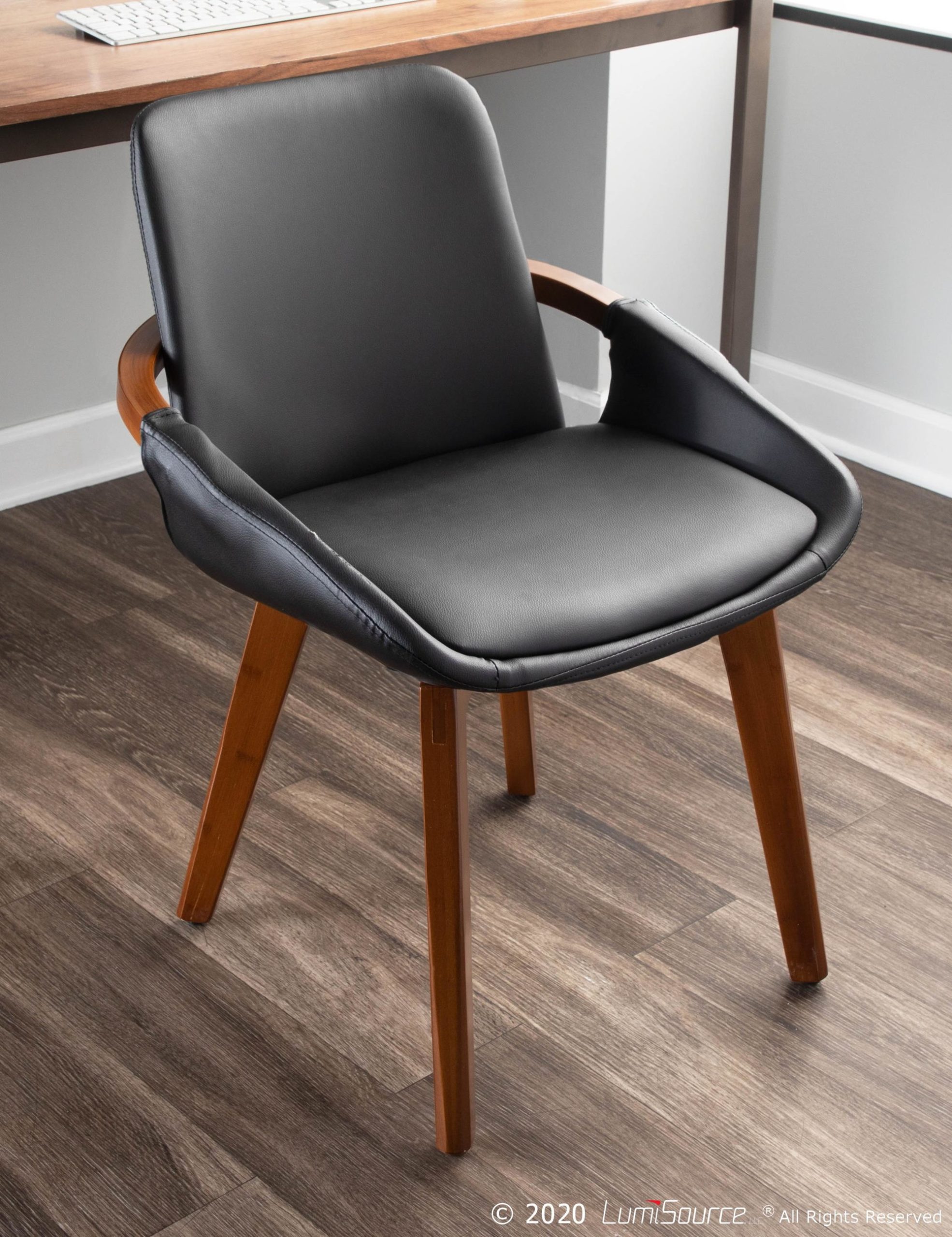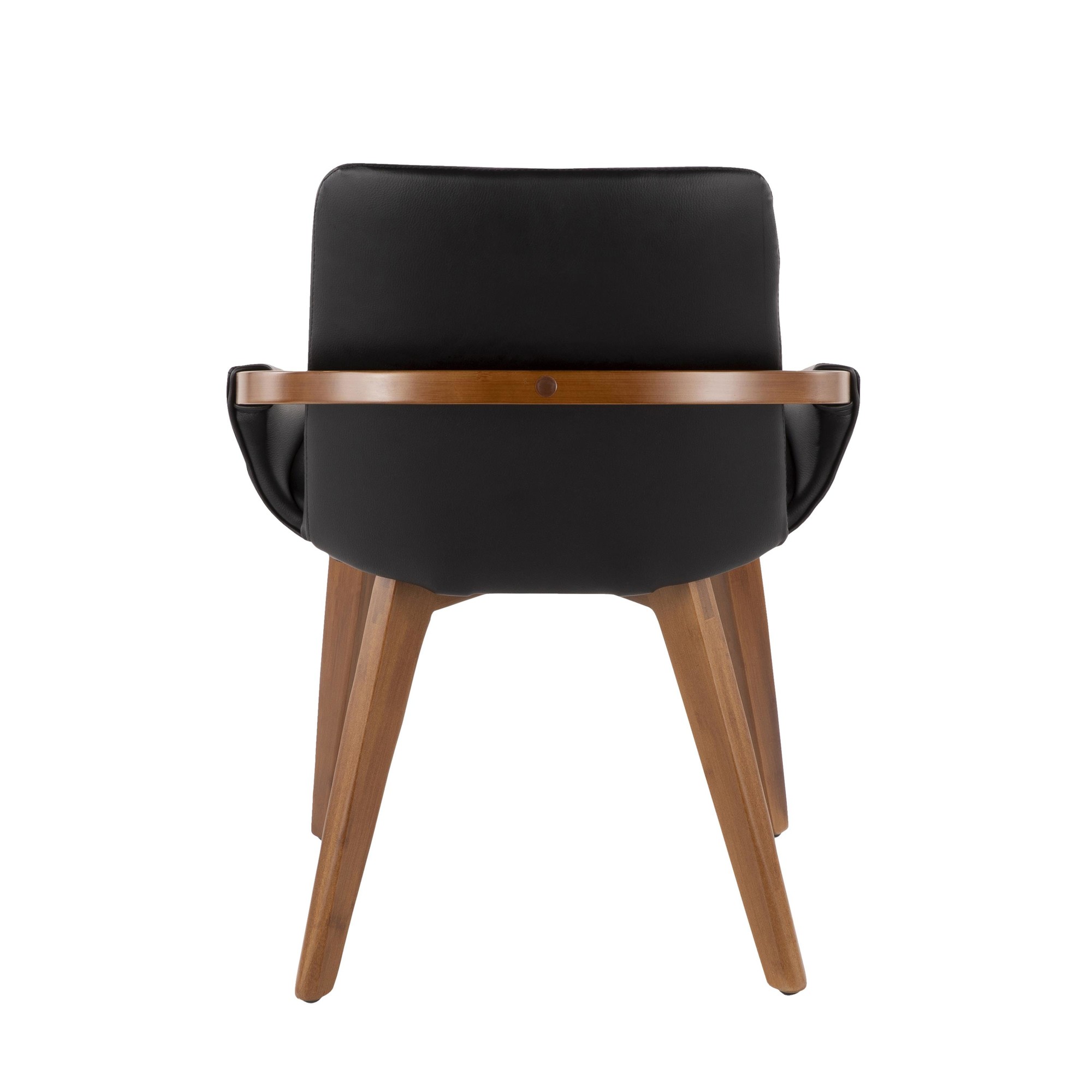 The Cosmo Chair seamlessly blends mid-century style with exceptional comfort. Its design features a sleek faux leather seat complemented by elegant walnut wood armrests and legs, making it a stylish addition to any space. Available in various color combinations to perfectly match your decor.