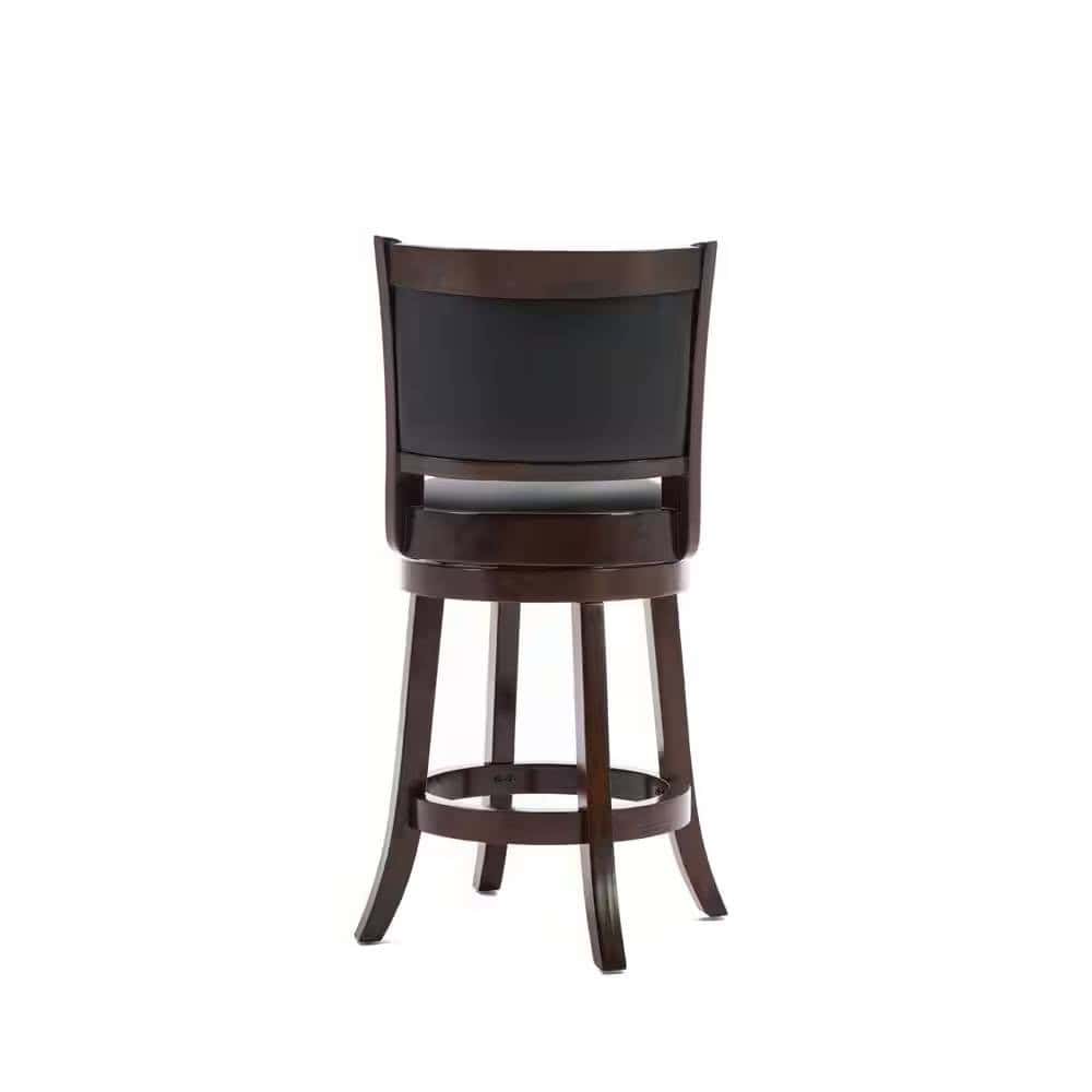 The Counter Height Swivel Barstool with Black Cushion and Wood Frame combines comfort, durability, and style in one versatile piece. This barstool features a sleek wood frame with a dark brown finish, complemented by a padded black faux leather cushion. Its 360-degree swivel functionality ensures maximum mobility, while the contoured back and footrest provide exceptional comfort and support. Built with eco-friendly rubberwood and reinforced stability stretchers, this barstool is designed for long-lasting use. With its contemporary aesthetic, this stool is a perfect addition to kitchens, dining rooms, or man caves.