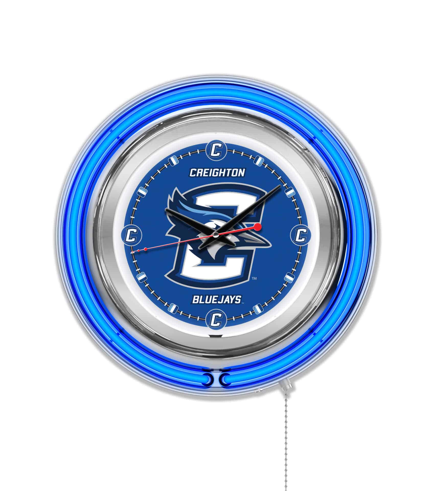 Show off your school pride with this stunning neon logo clock. Featuring a sleek chrome casing and a vibrant team-color neon outer ring, this clock is designed to make a bold statement. The custom-printed clock face is illuminated by a brilliant white inner neon ring, creating a striking visual effect. The neon rings are easily controlled with a pull chain and powered by a UL-listed transformer that plugs into a standard 120V outlet. With accurate quartz movement powered by a single AA battery (not included), this clock is as functional as it is stylish. Perfect for grads, sports fans, or anyone looking to add a touch of team spirit to their space.