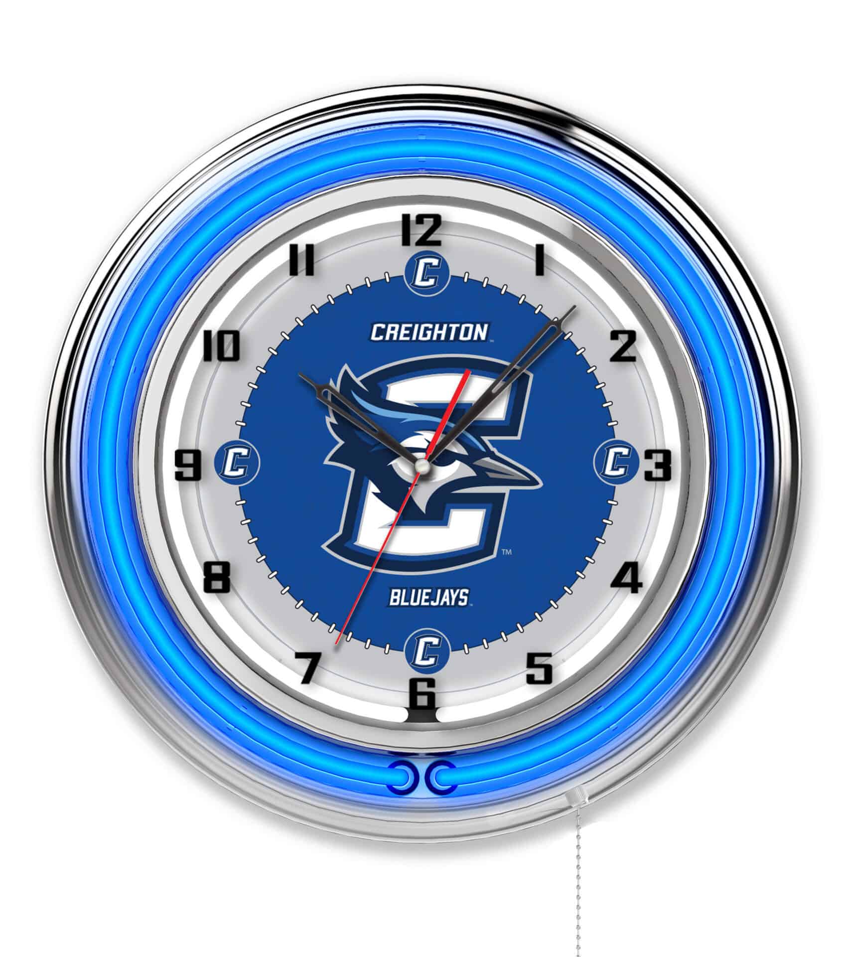 The Creighton University 19-Inch Neon Logo Clock in Chrome is the perfect addition to any fan’s collection, combining vibrant team spirit with functional design. Featuring a striking chrome casing and a neon outer ring in team colors, this clock not only tells time but also makes a bold statement. The brilliant white inner neon ring illuminates the custom printed clock face, ensuring visibility in any setting. With easy ON/OFF operation via a pull chain, this clock is powered by a standard 120V outlet and includes a UL Listed power transformer. Its accurate quartz movement is powered by a single AA battery (not included), making it a reliable choice for keeping track of time while showcasing your pride.