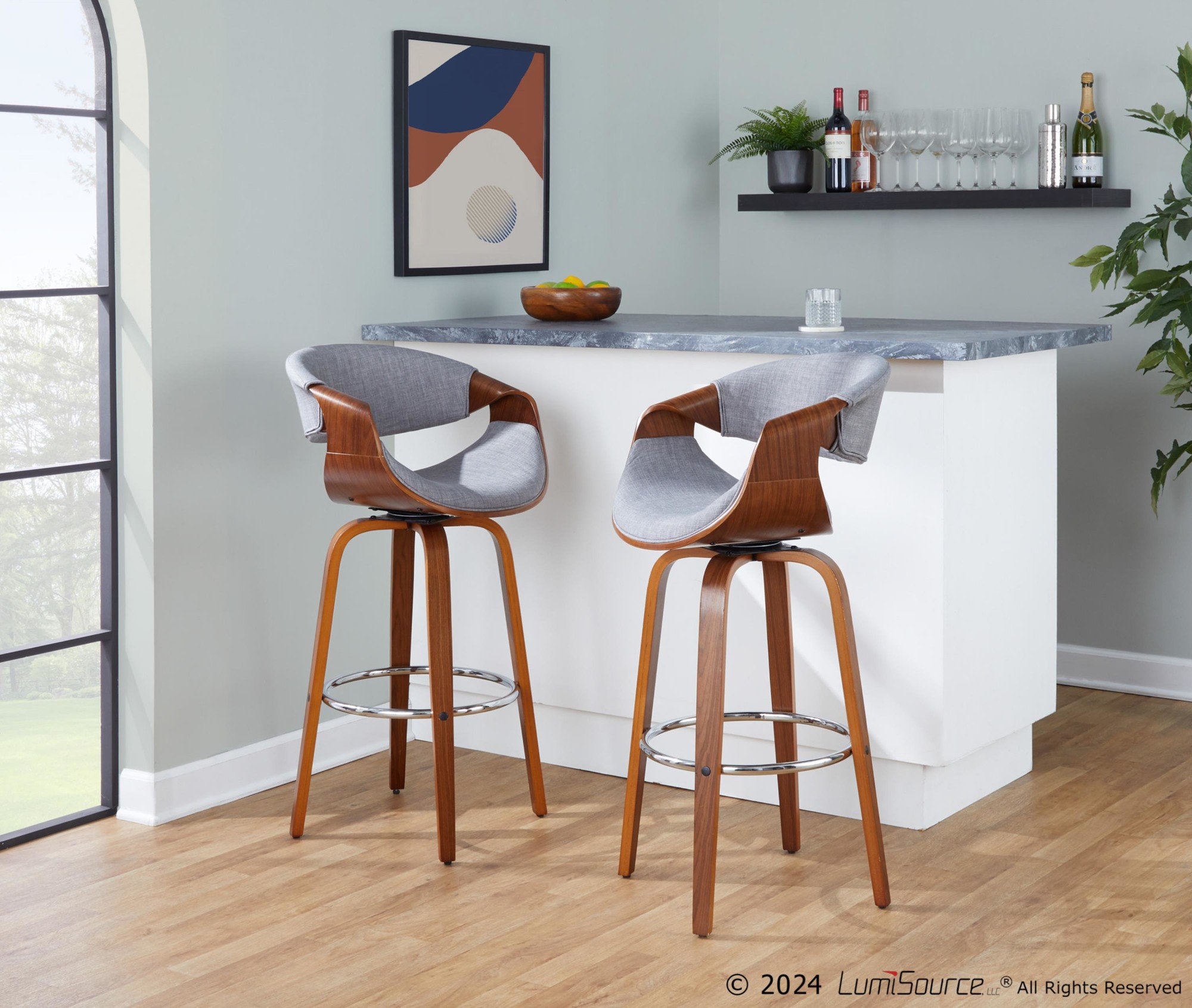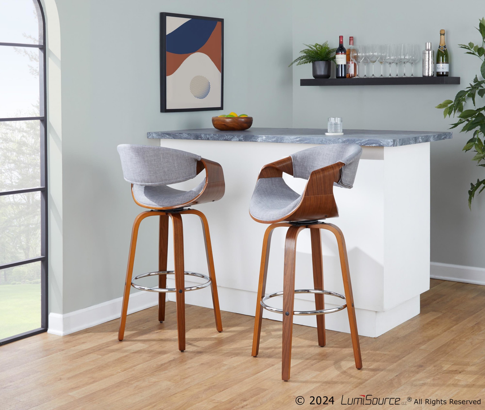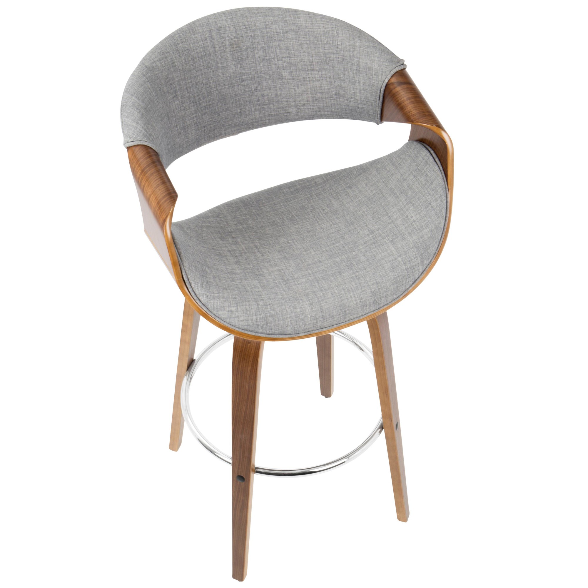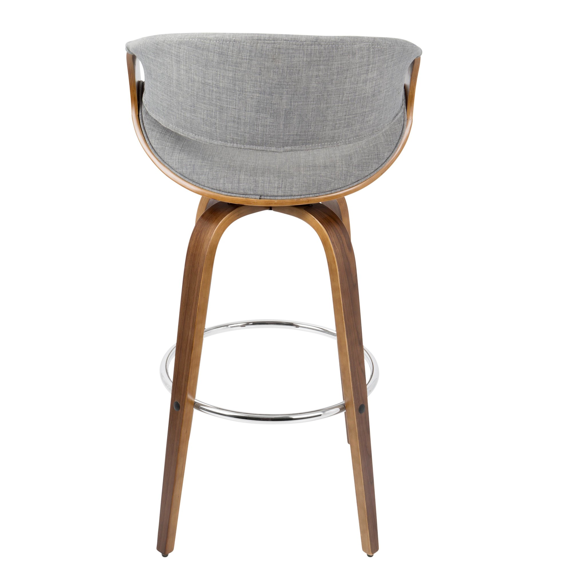 The Curvini 30 Mid-Century Walnut and Grey Swivel Barstool brings a curvaceous touch of Mid-Century Modern style to your kitchen or bar area. This unique design features a walnut-finished wood frame, luxurious woven fabric upholstery, a swiveling seat, and stylish armrests, providing both comfort and sophistication. This bar stool will look great in any space.
