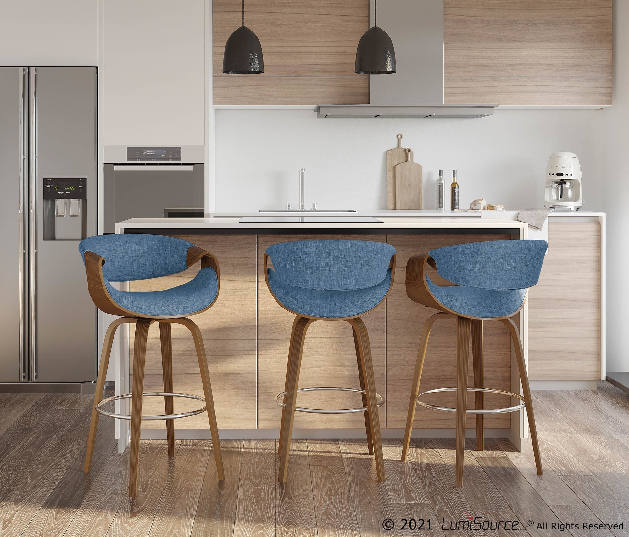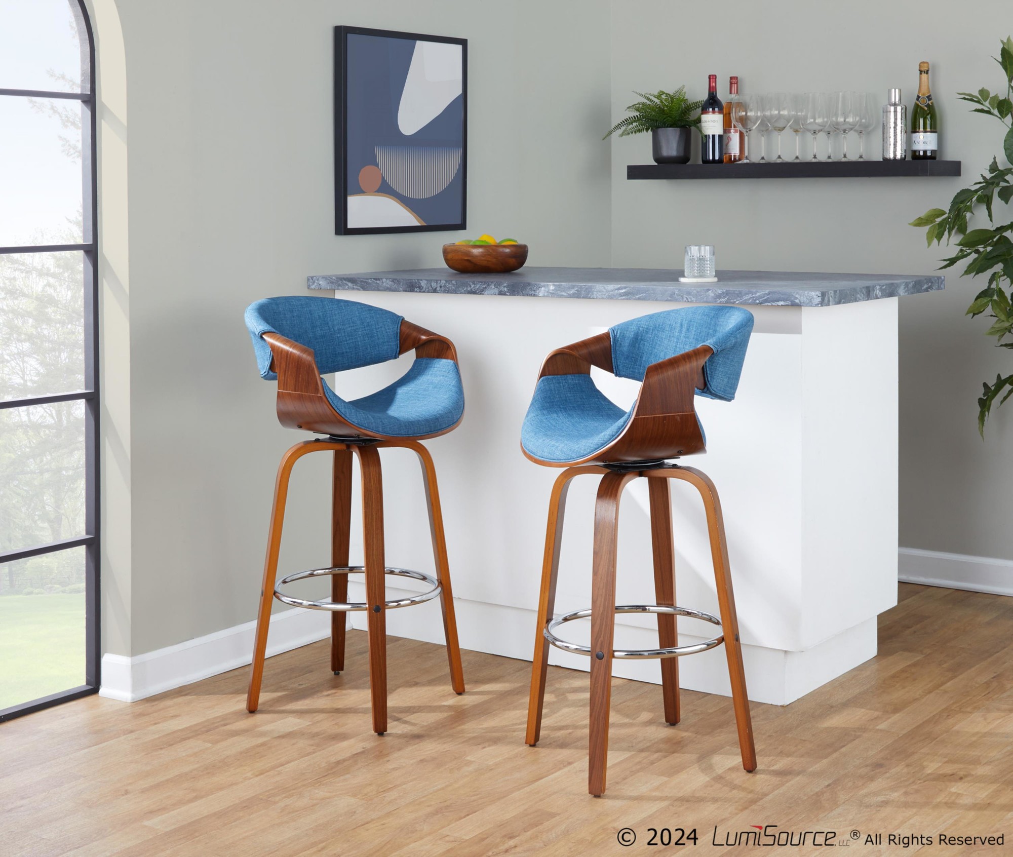 The Curvini Barstool brings a curvaceous dose of mid-century modern style to your bar area. This unique design features a walnut-finished wood frame, luxurious woven fabric upholstery, a swivel seat, and stylish armrests, creating a comfortable and visually appealing seating option. Choose the color that best complements your space. This barstool is sold in pairs.