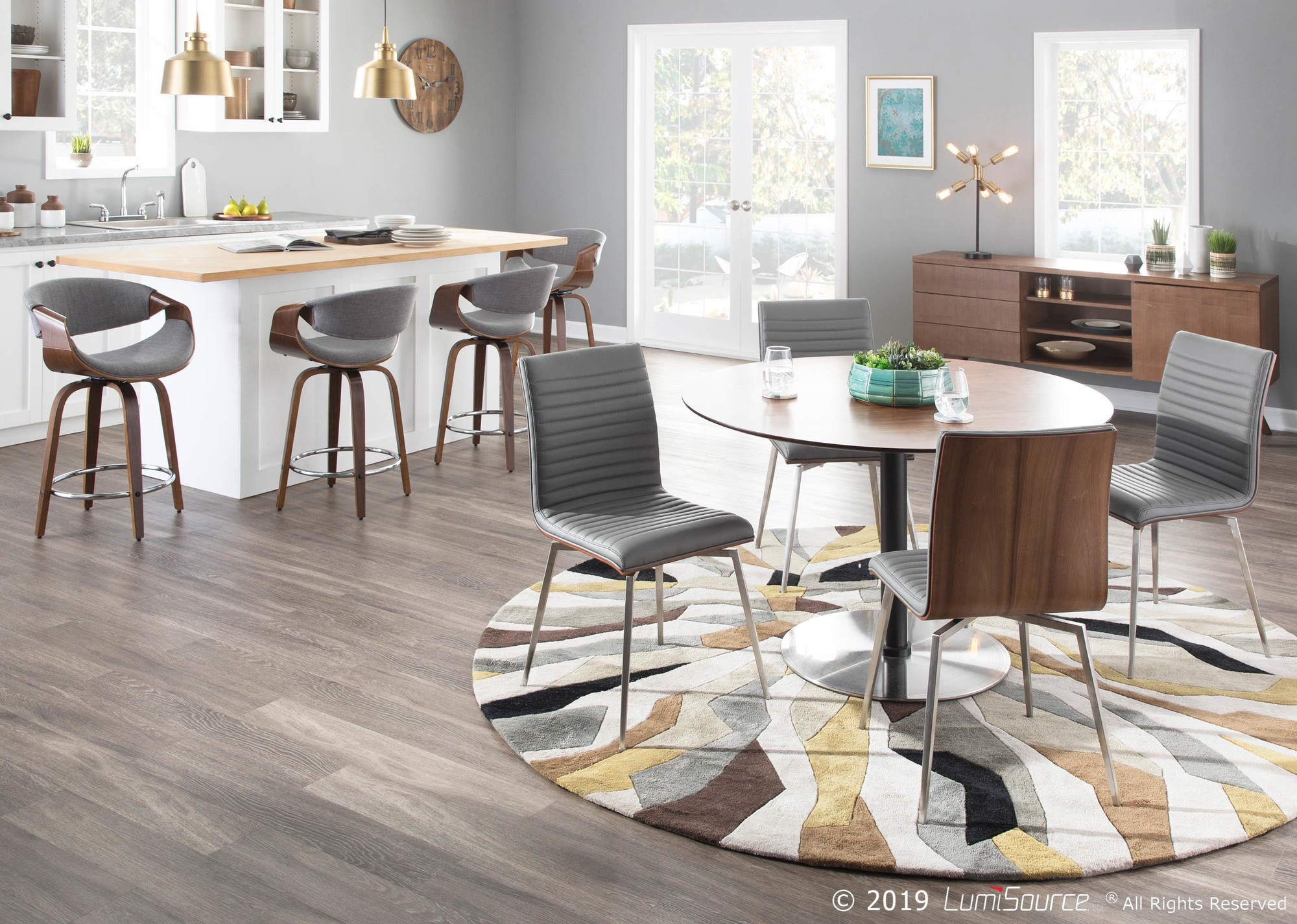 Add a touch of cool to your bar with these Curvini Mid-Century Modern Counter Stools. These stools offer a Mid-Century Modern design with a walnut finished wood frame. They feature luxurious woven grey fabric upholstery and stylish, curved bent wood armrests. The 360-degree swivel seat lets you keep an eye on the whole cave. These stools are sold in pairs and have a fixed counter height, perfect for your bar area. Dimensions: 20.5″L x 21″W x 34.5″H. Seat Height: 24″. Weight Limit: 250 lbs per stool. Some assembly is required, but it’s worth it for the comfort and style!