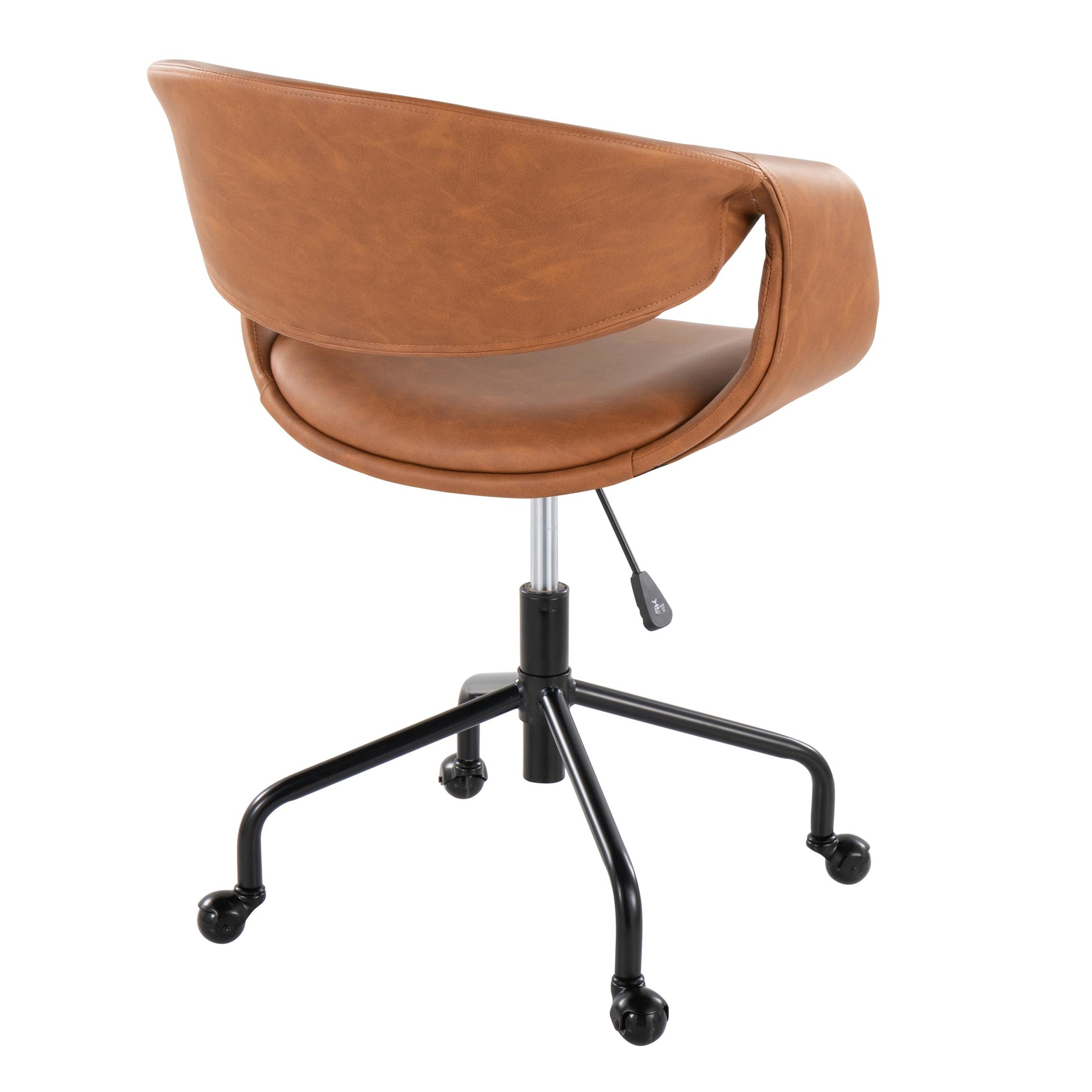 The Curvo Camel Faux Leather Contemporary Task Chair offers a stylish and comfortable seating solution, perfect for enhancing your workspace. This chair features a fully upholstered seat and a curved, ergonomic backrest, providing exceptional support and a refined aesthetic. Customize your comfort and mobility with its adjustable height and smooth swivel function, making it a versatile and valuable addition to any home or professional office.