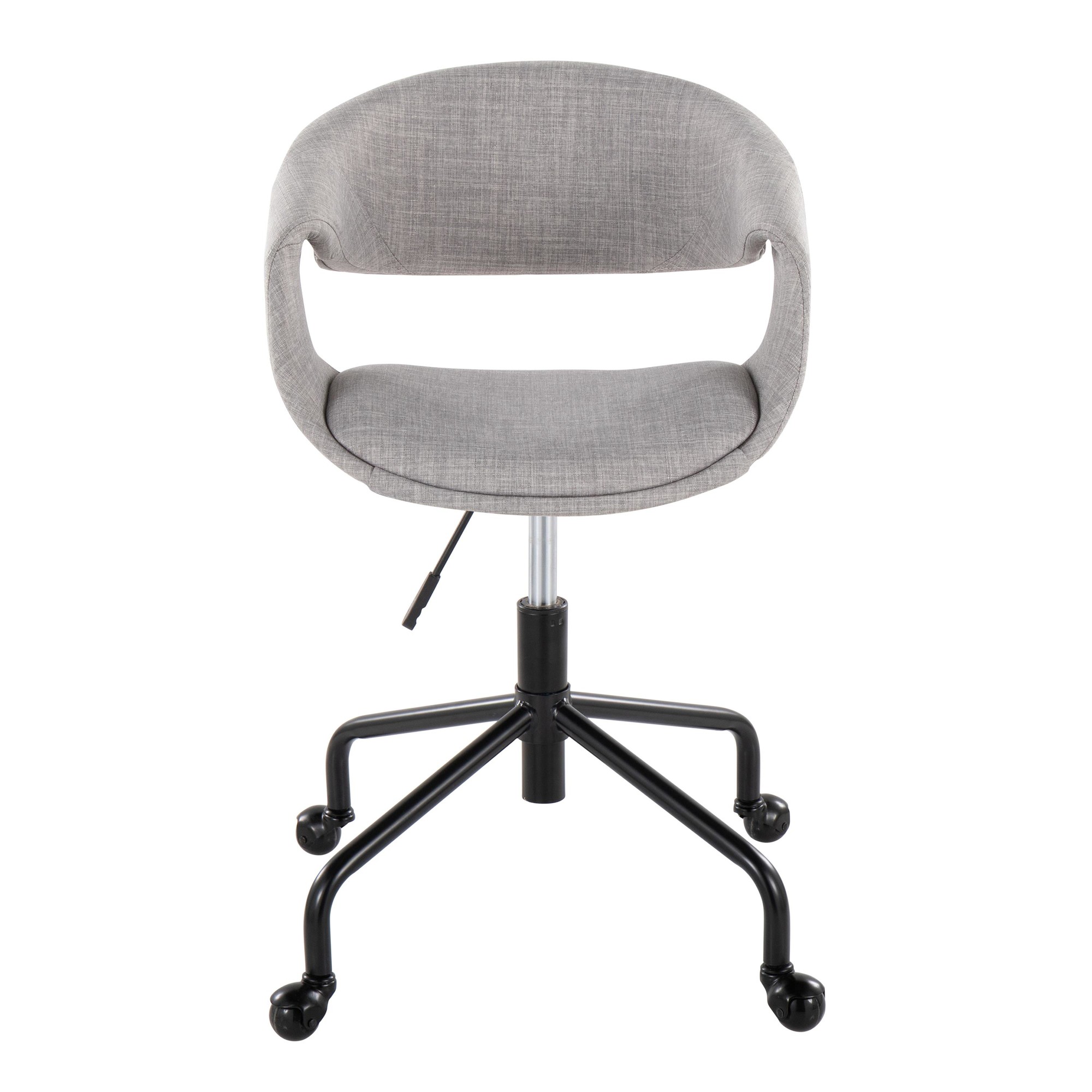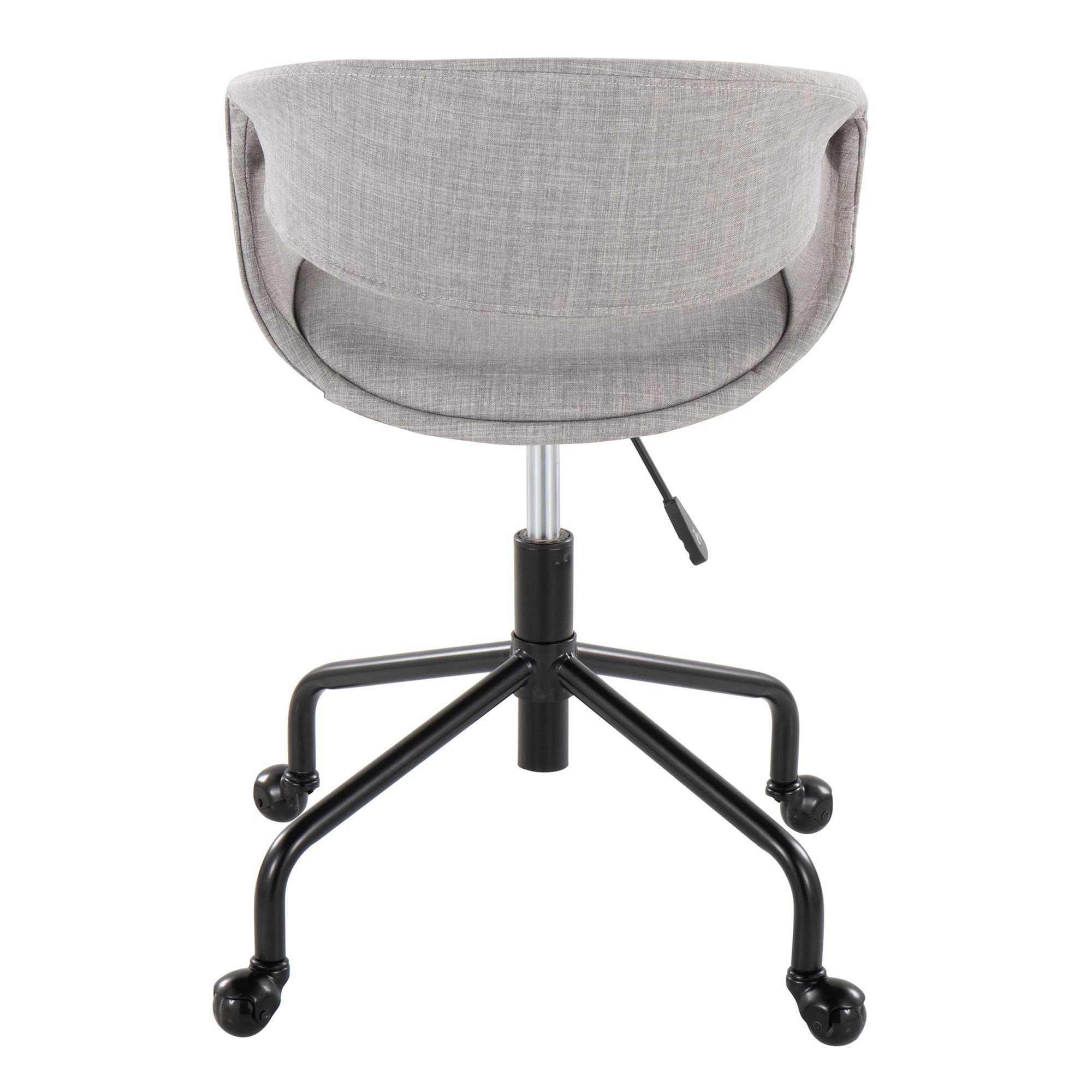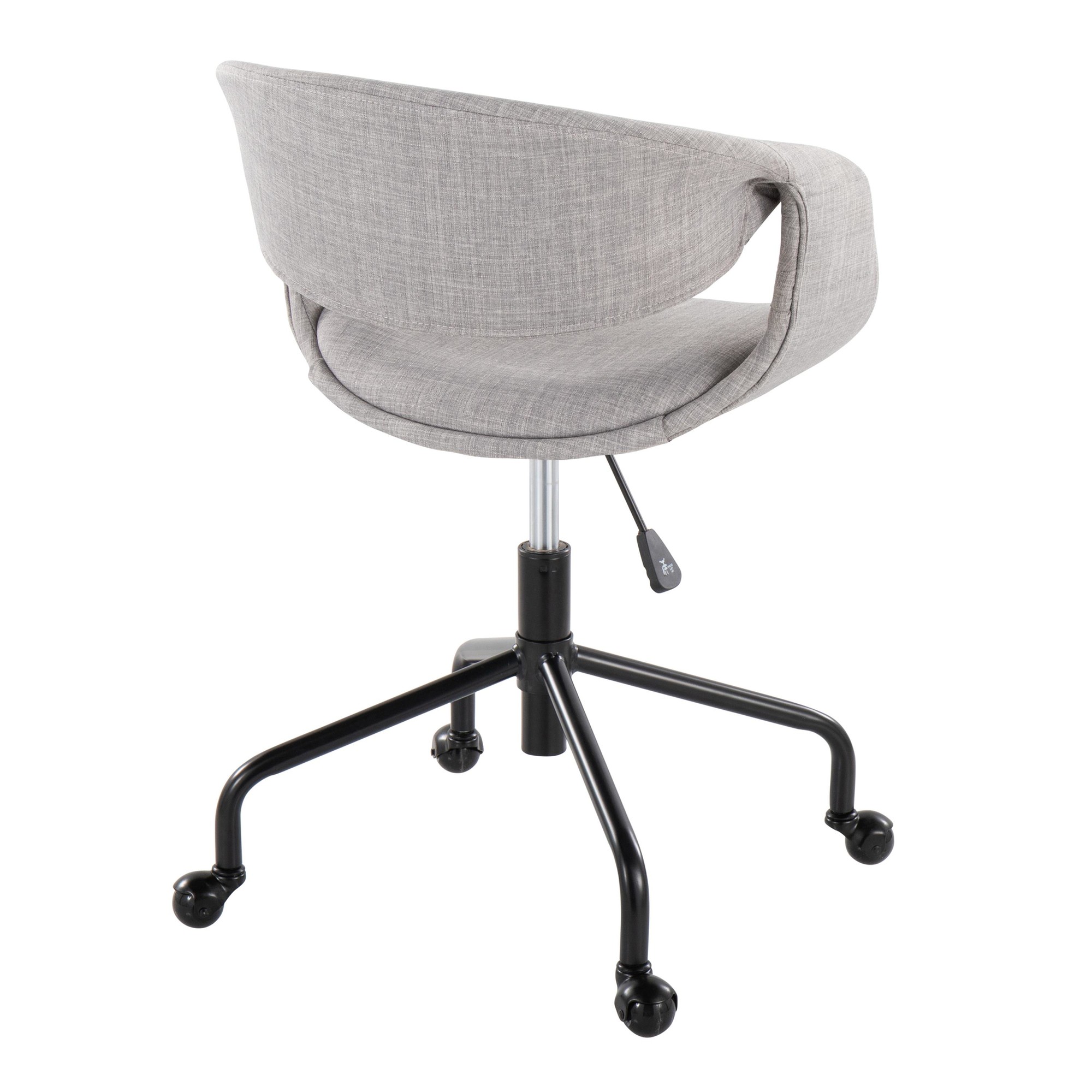 The Curvo Grey Fabric Contemporary Swivel Task Chair provides a stylish and comfortable seating solution for any workspace. This task chair features a fully upholstered seat and a curved, ergonomic backrest, offering exceptional support and a refined aesthetic. Enjoy customized comfort and mobility with its adjustable height and 360-degree swivel functionality, making it a versatile addition to your home or professional office.