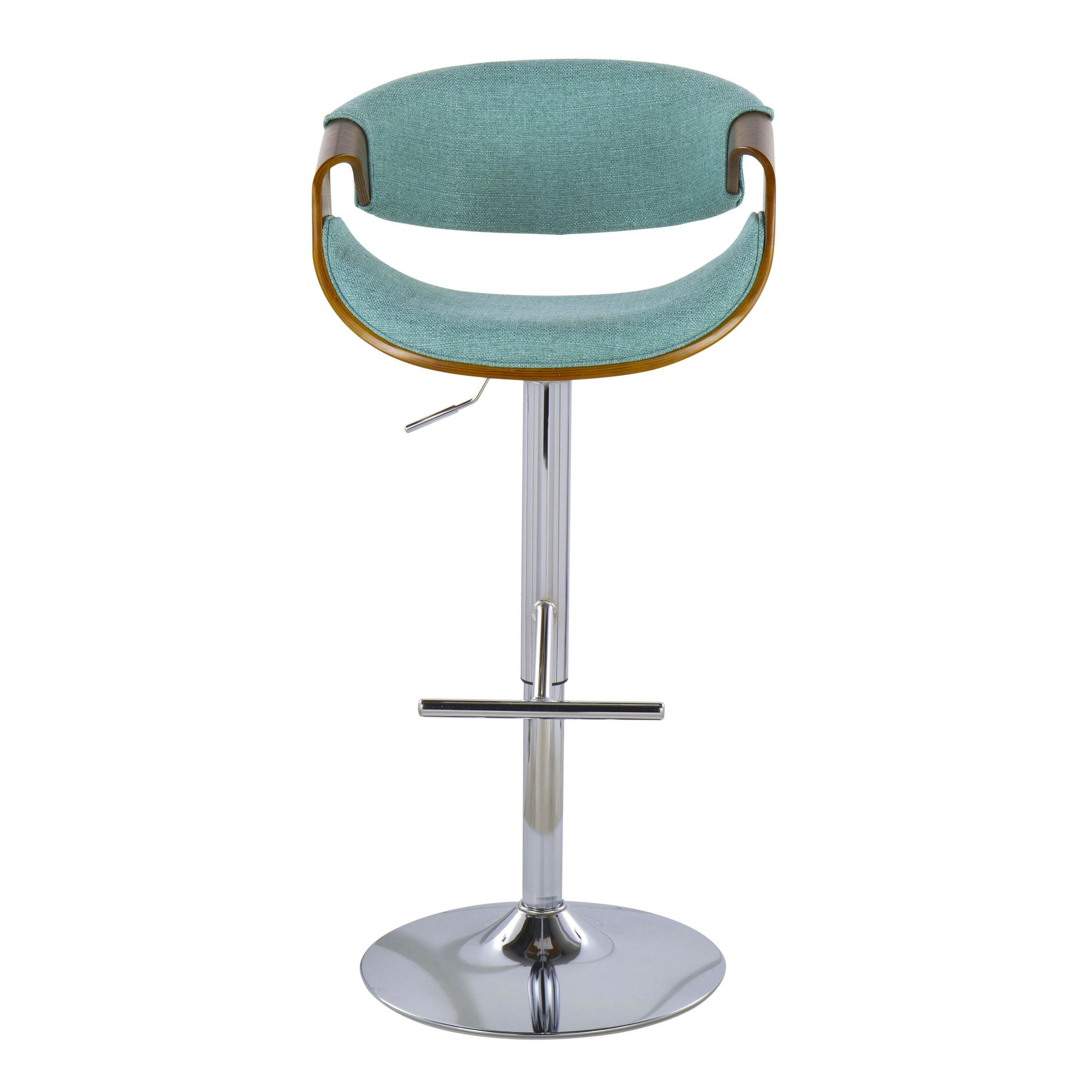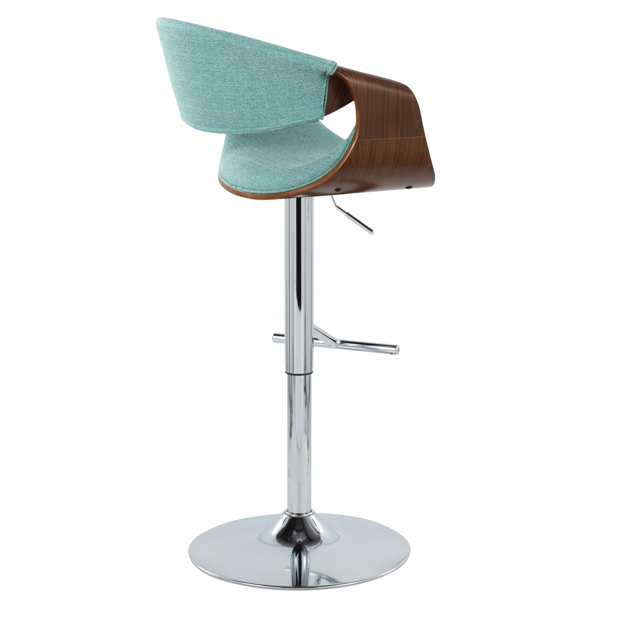 Bring a touch of the past into your man cave with the Curvo Mid-Century Modern Teal Swivel Barstool. This barstool is a modern take on a retro style. The cut-out back creates an open feel, while the curved seat and walnut armrests add charm. Enjoy the comfort of the chrome footrest without sacrificing style. This stool features adjustable height with a 360-degree swivel, letting you find the perfect position. Made with polyester fabric, foam, metal, and bent wood. Sold in pairs. Perfect for adding a personal touch to your bar area. Weight limit: 250 lbs (each). Some assembly required.