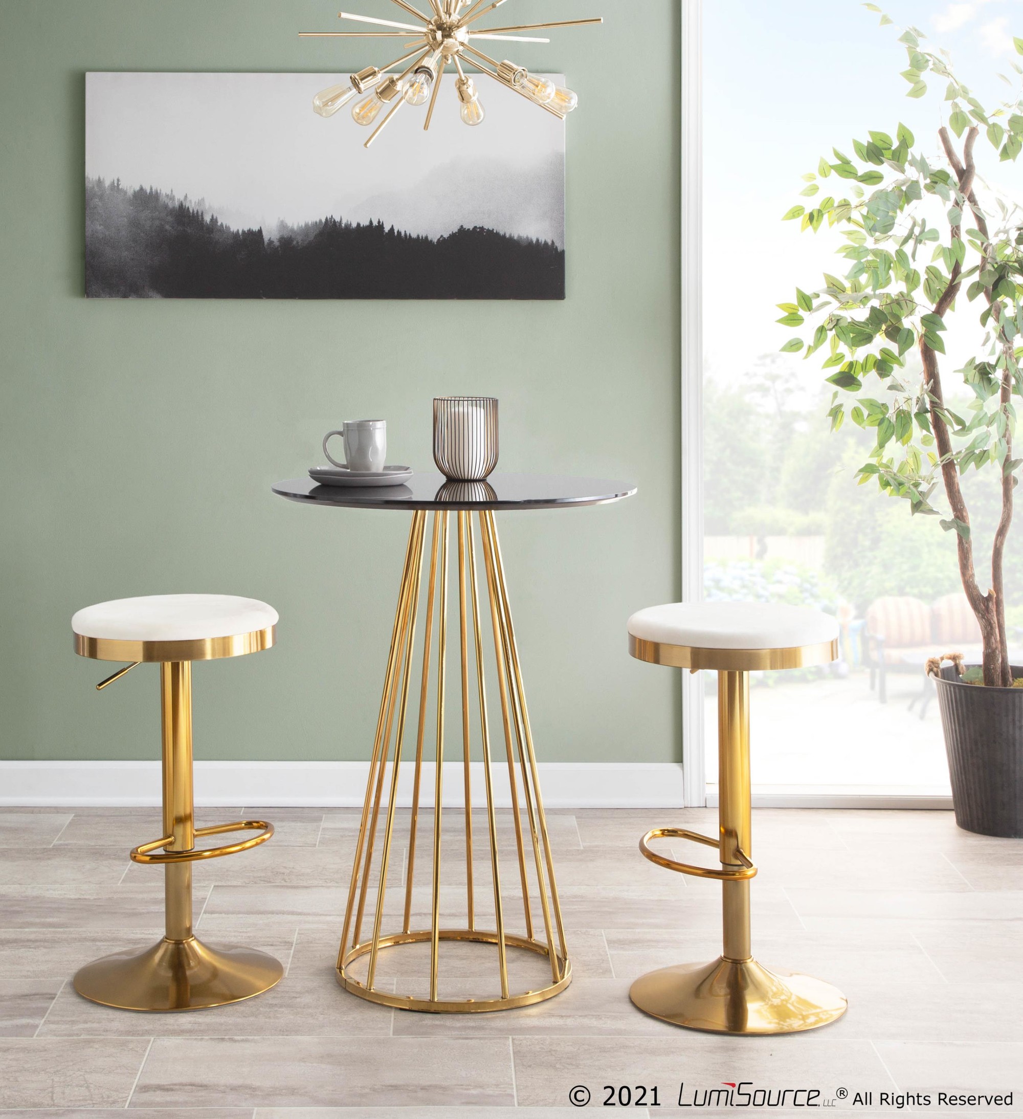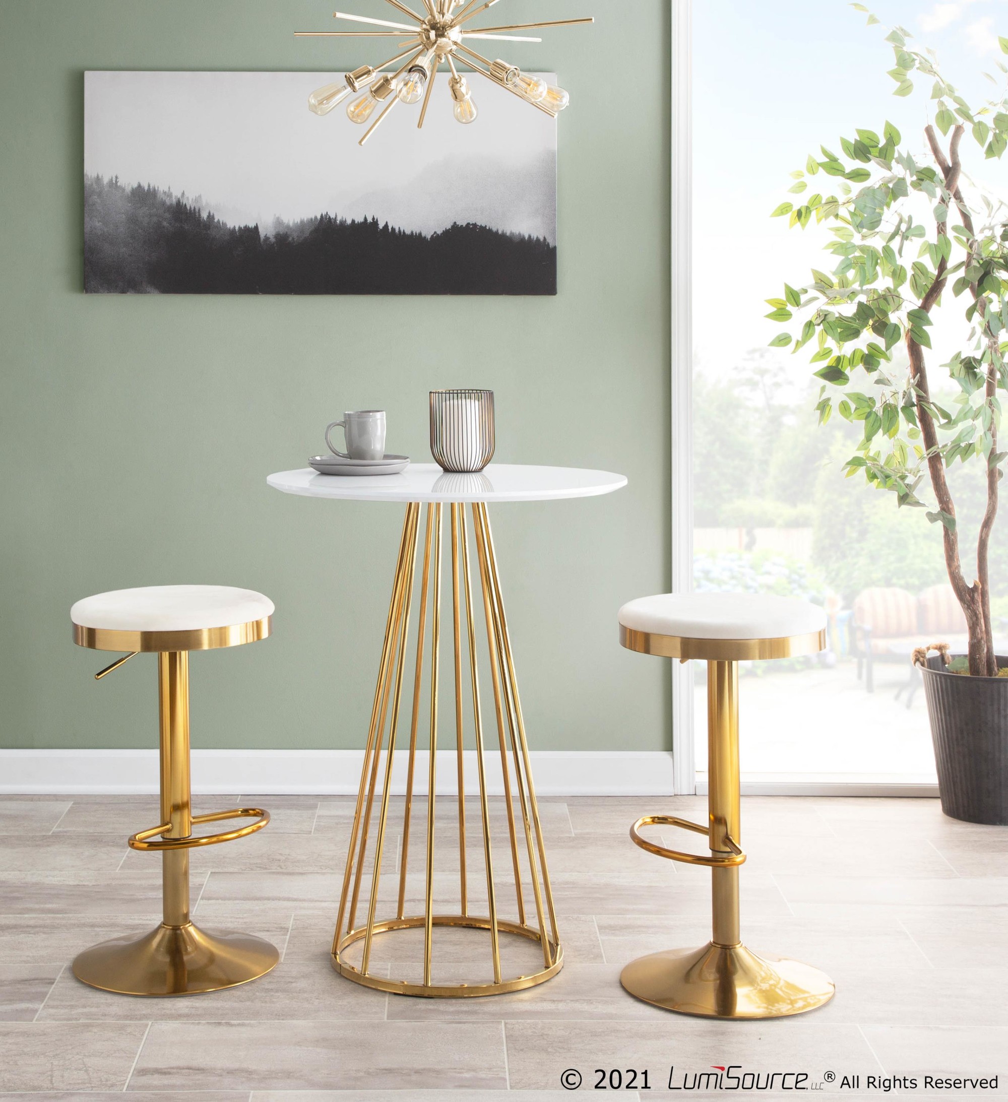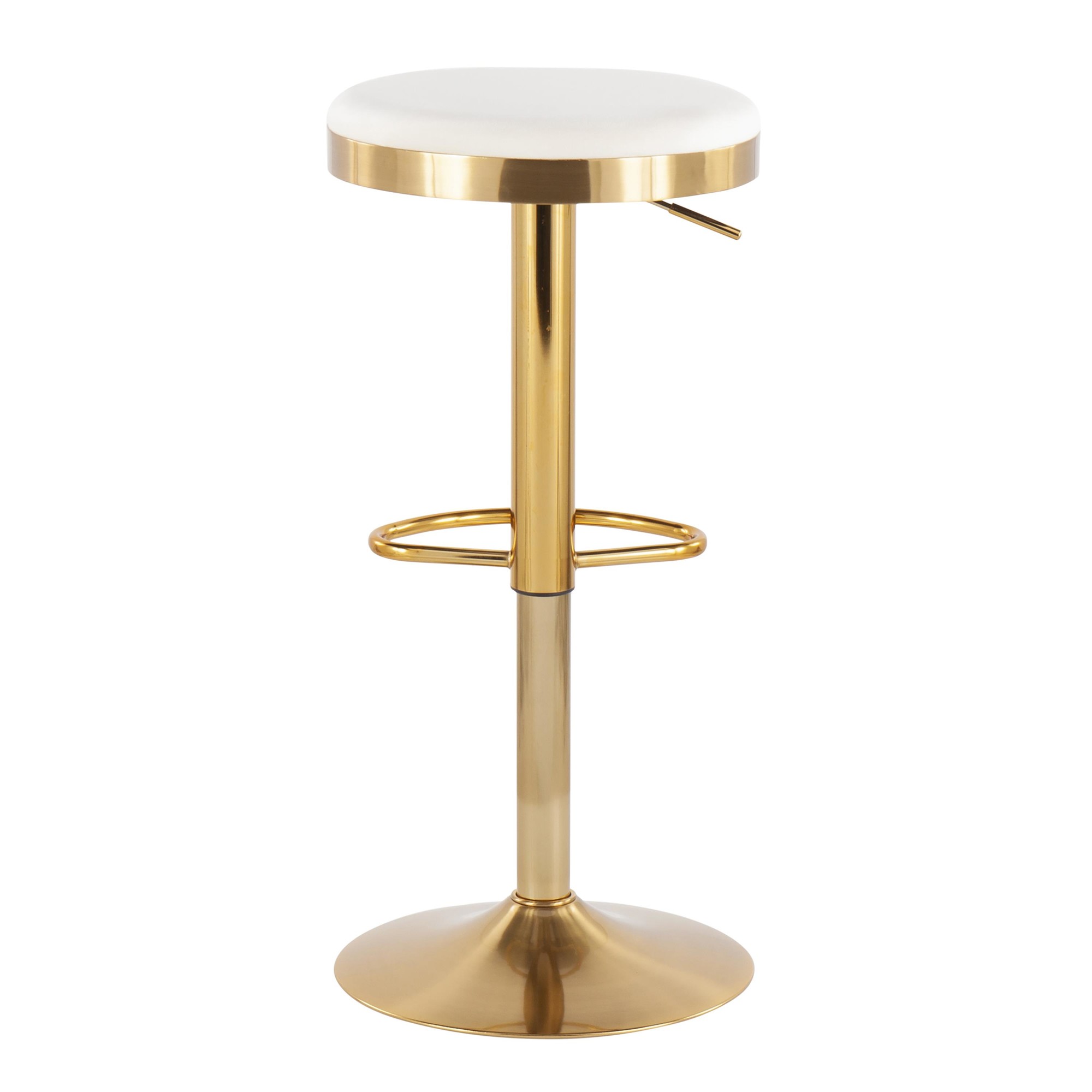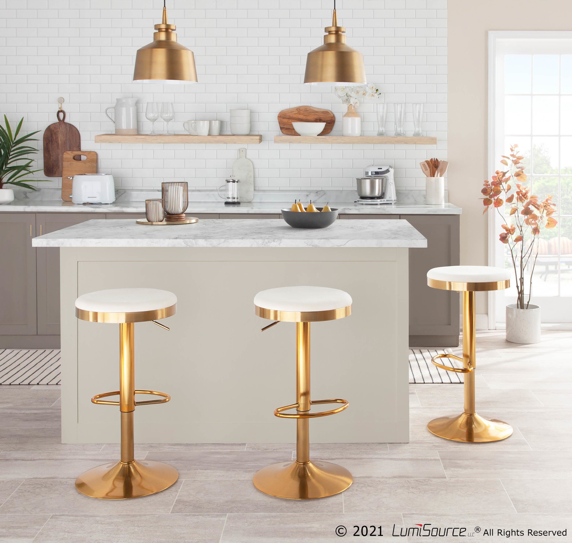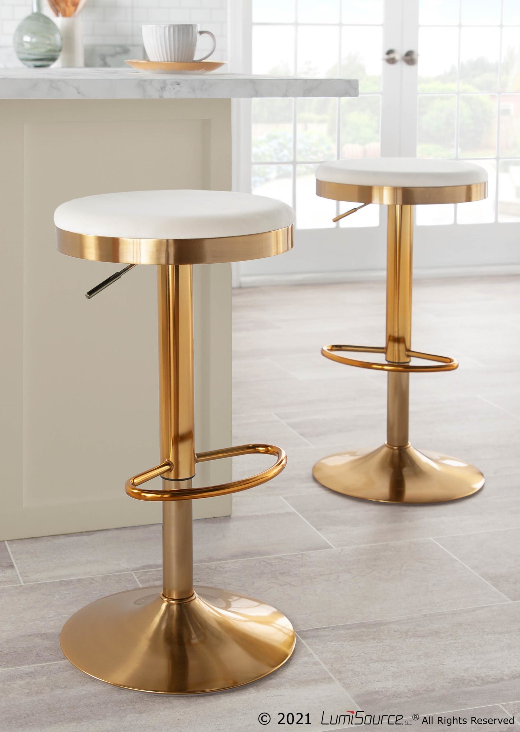 Add a touch of glam to your kitchen or bar area with the Dakota Gold Cream Velvet Contemporary Adjustable Barstools. These barstools perfectly combine modern and glamorous styling, making them a stunning addition to any space. Each stool features a plush, upholstered seat, a convenient built-in footrest, and a 360-degree swivel function for ultimate comfort and versatility. Sold in pairs, these adjustable height stools are sure to elevate your home décor.