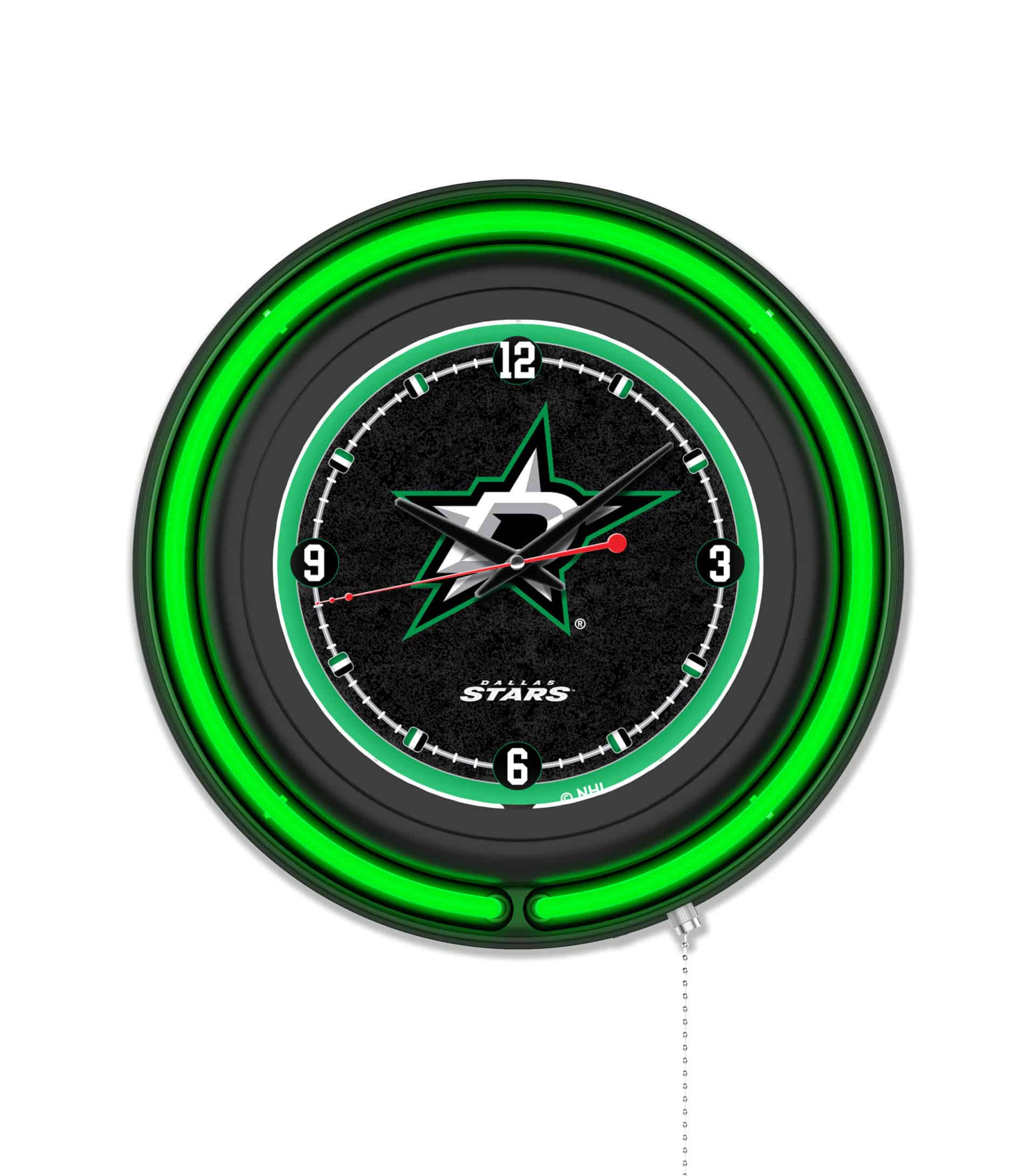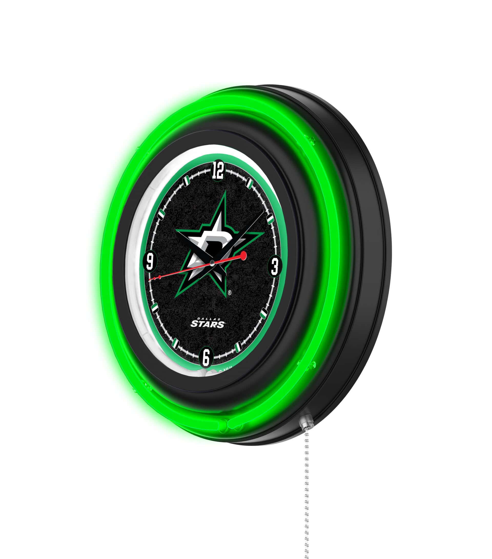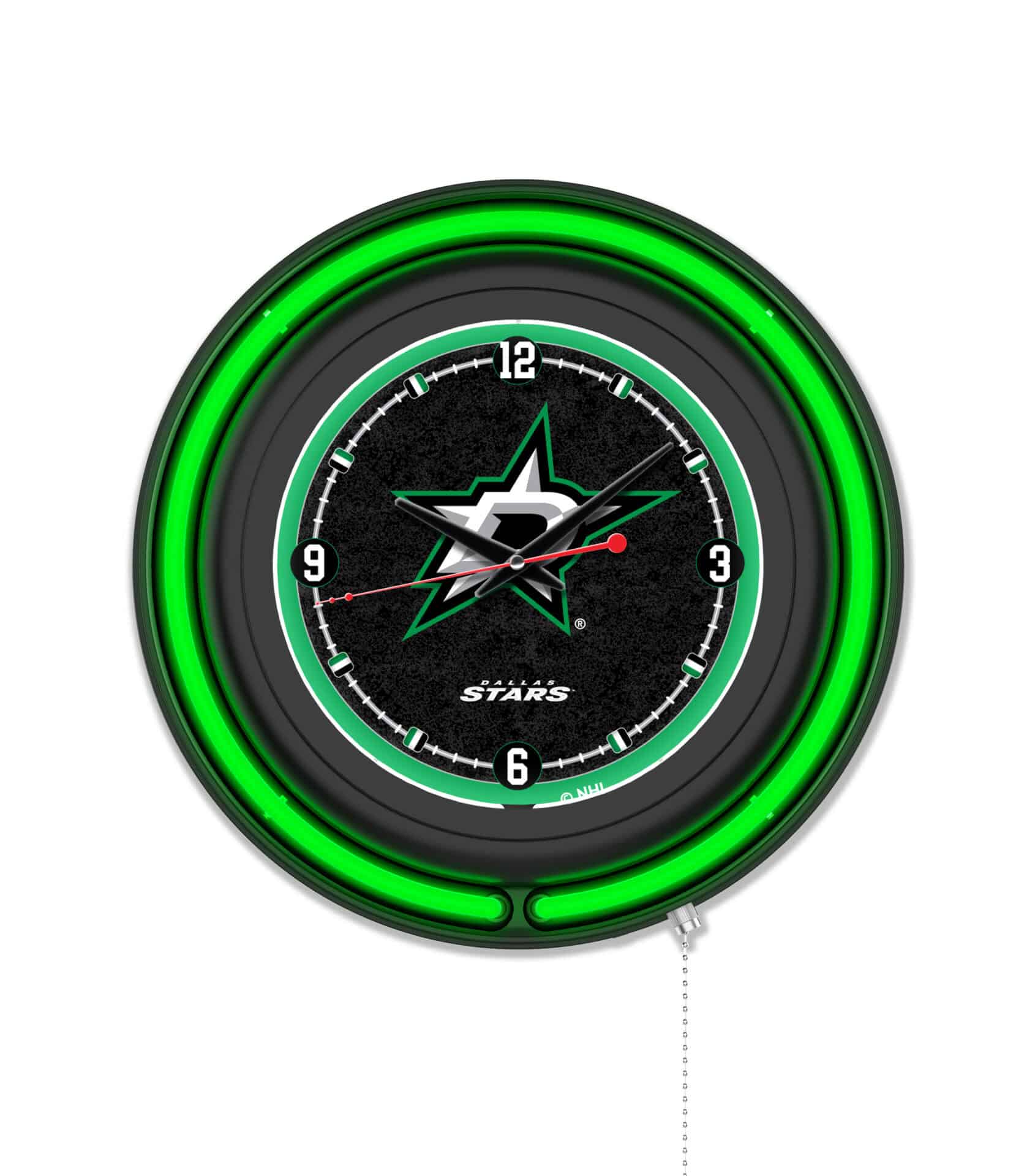 Showcase your team pride with the Dallas Stars 15-Inch Neon Logo Clock in Black. This eye-catching clock features a sleek black casing coupled with a vibrant team-colored neon outer ring that beautifully highlights the custom printed clock face, illuminated by a brilliant white inner neon ring. The neon rings can be easily turned on and off using a convenient pull chain located at the bottom of the clock. Powered by a UL Listed transformer, it operates from a standard 120V outlet. With accurate quartz movement, this clock ensures precise timekeeping and runs on a single AA battery (not included). Perfect as a gift for sports enthusiasts or as a stylish addition to your own decor, this clock promises to be a standout piece in any room.