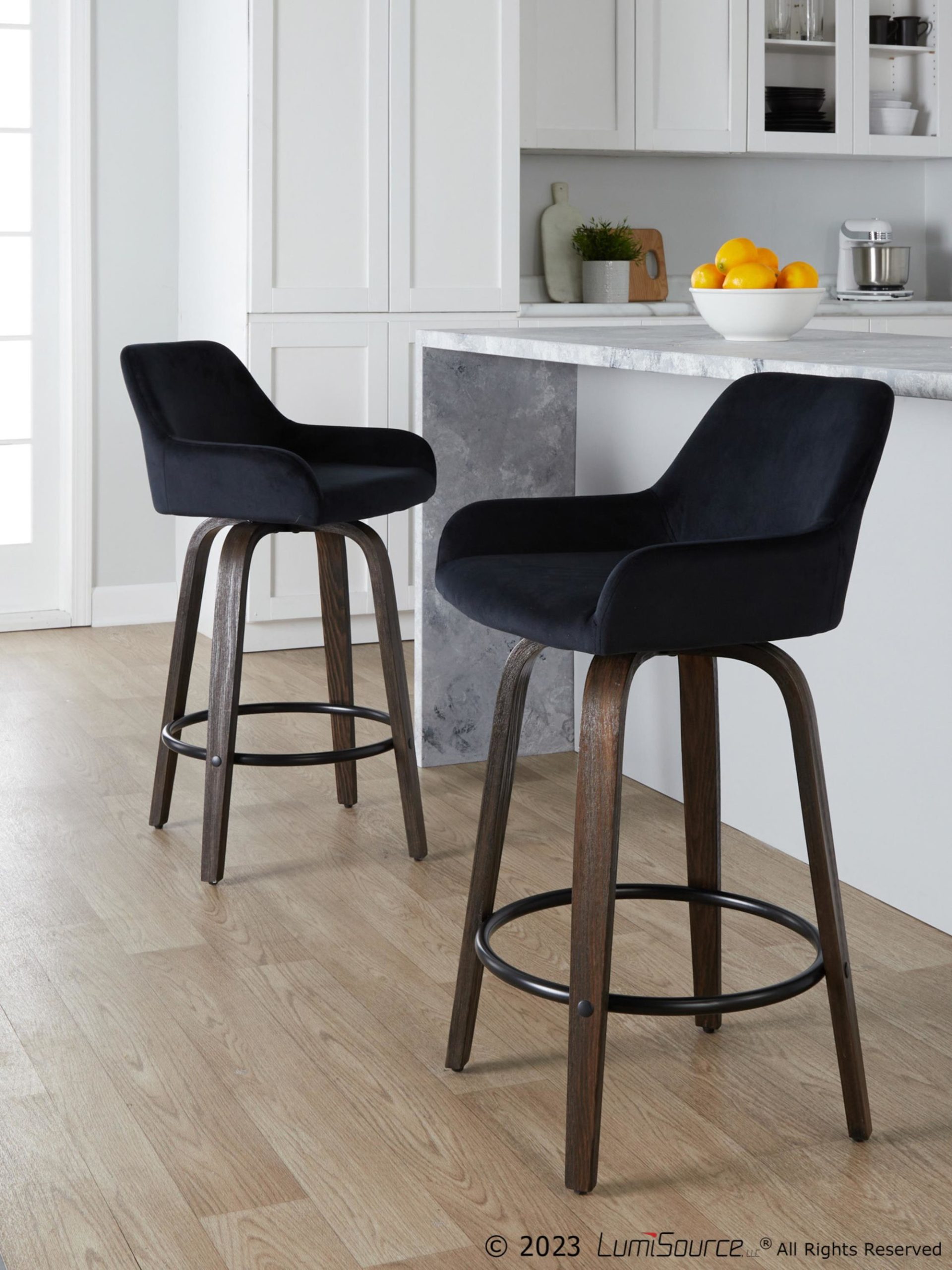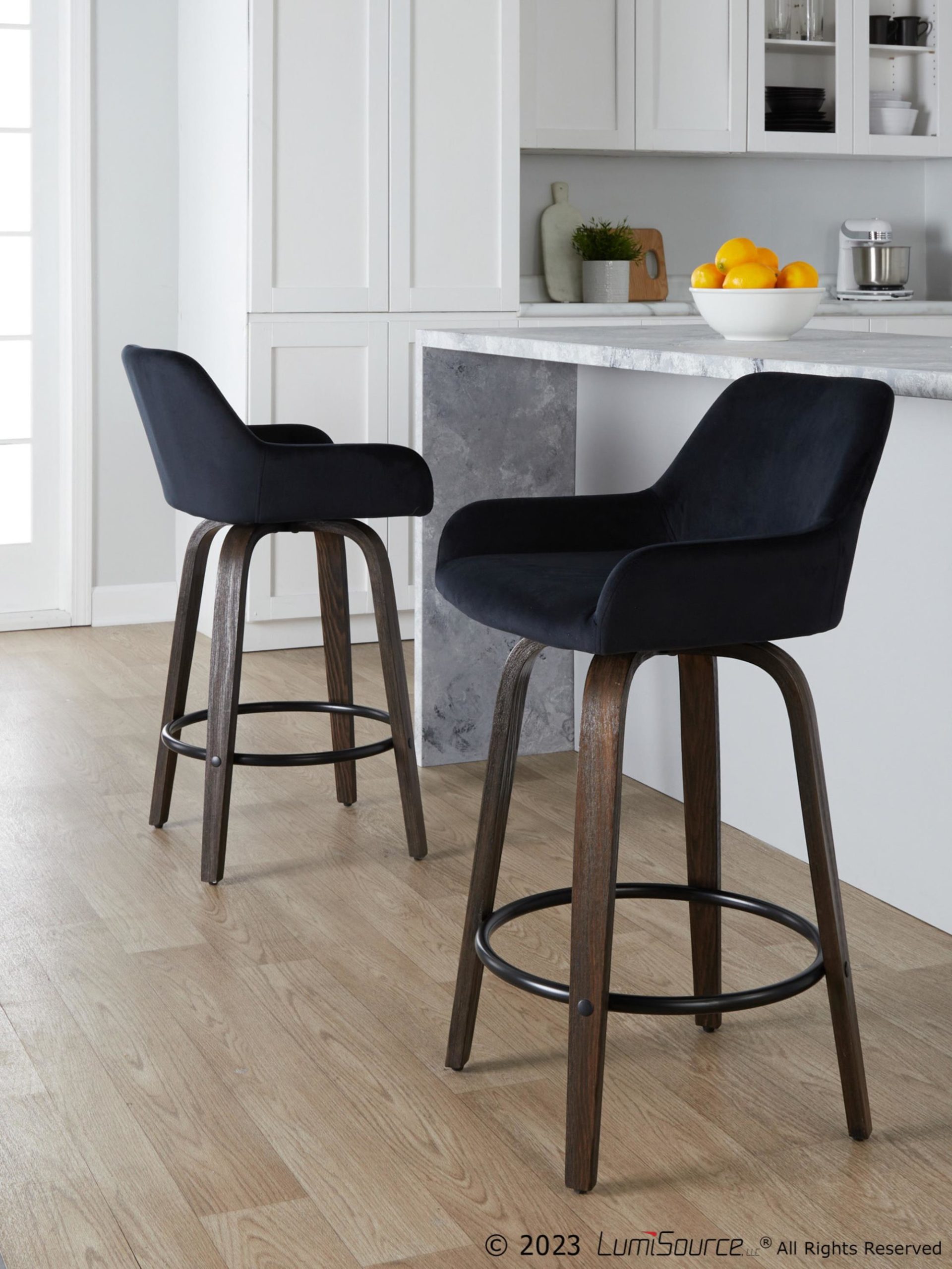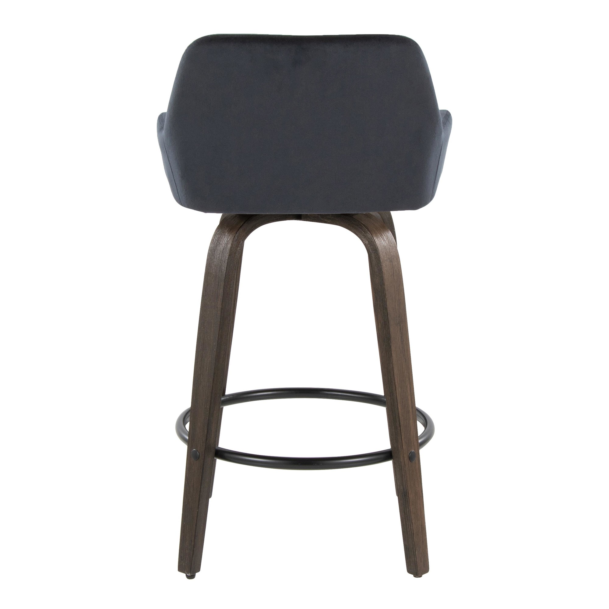 Add some style to your bar with this set of 2 black velvet counter stools. The contemporary style makes it perfect for any space. They feature a 360-degree swivel, so you can easily chat with your friends. The padded backrest and round black metal footrest provide comfort. The bent wood legs add a unique touch. These stools are great for any kitchen or bar area. Assembly is required, but it’s easy to do. The seat height is 25.5″. Each stool has a weight limit of 250 lbs. The color is black velvet with walnut glazed wood and black metal.