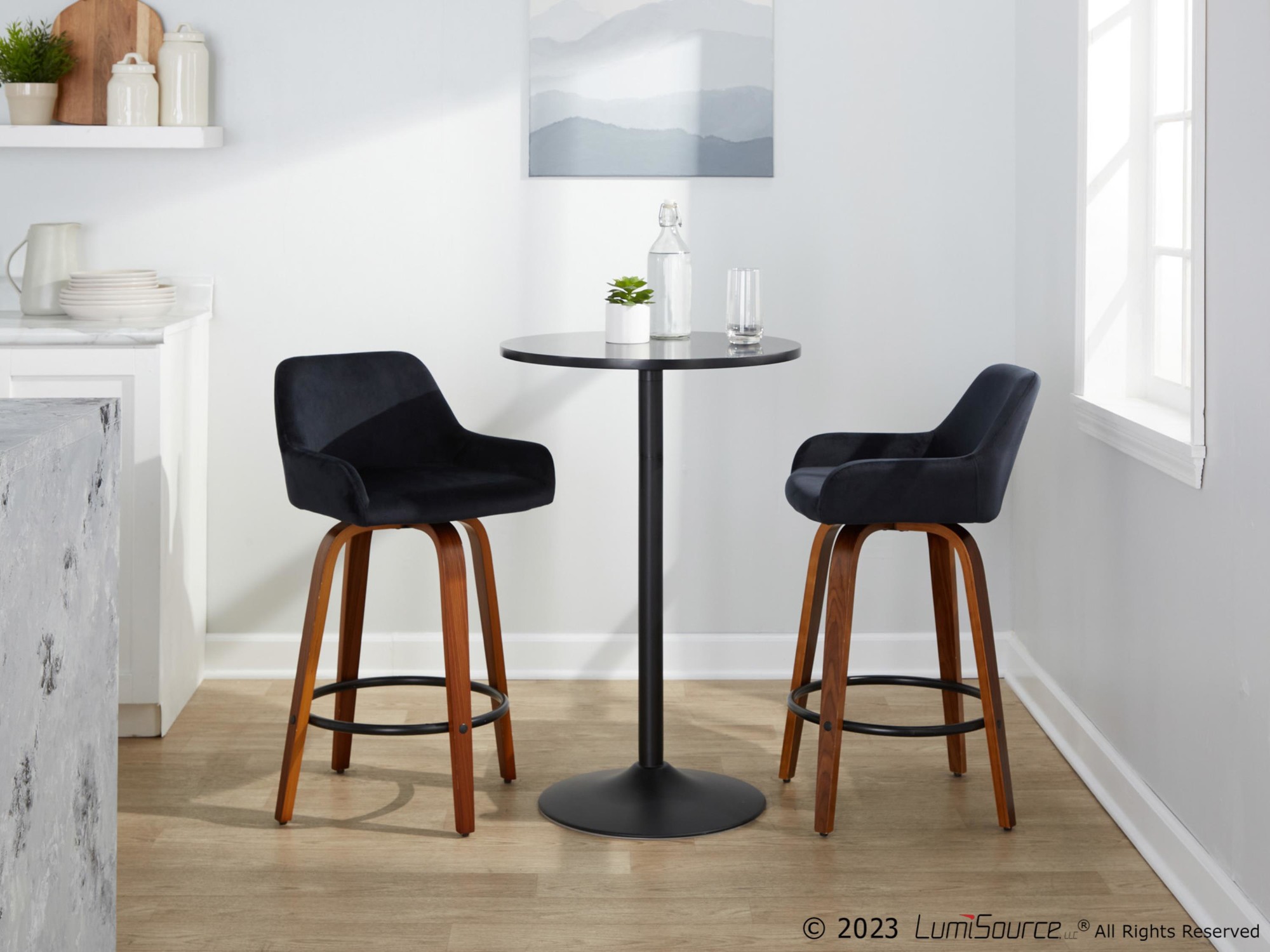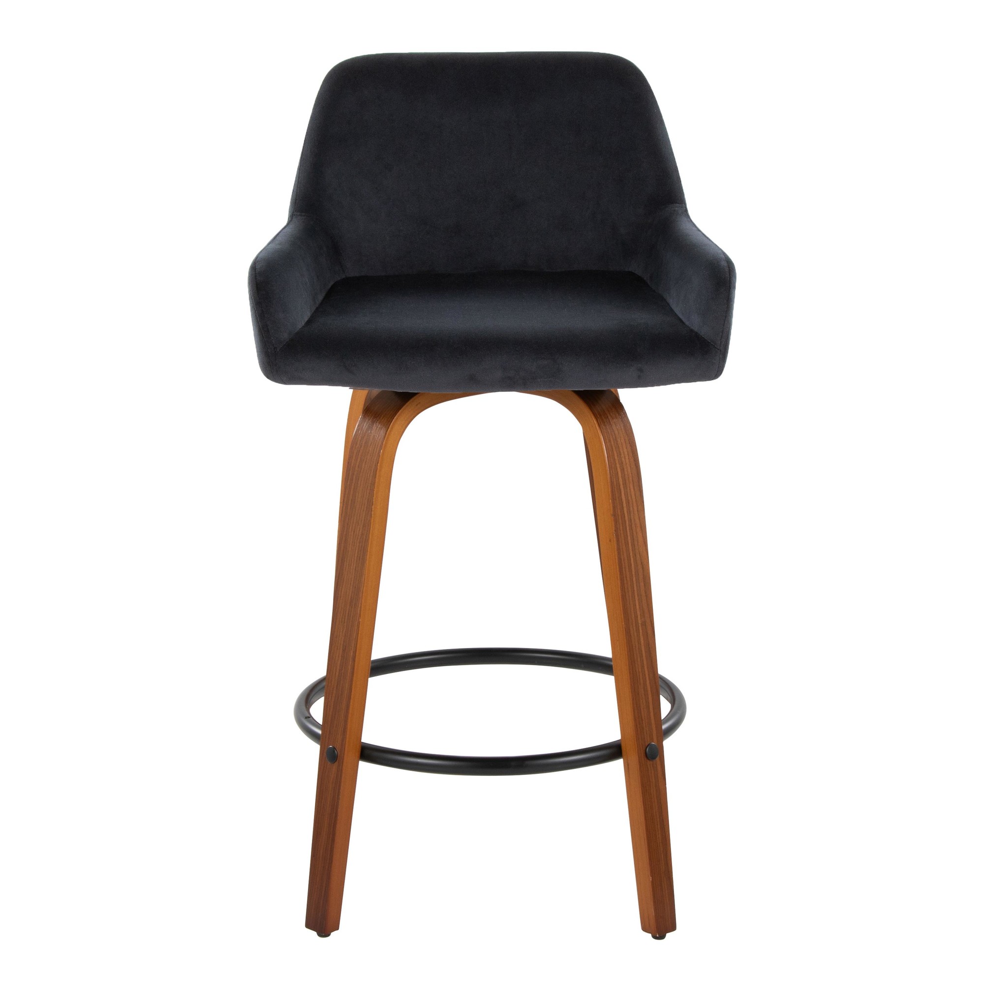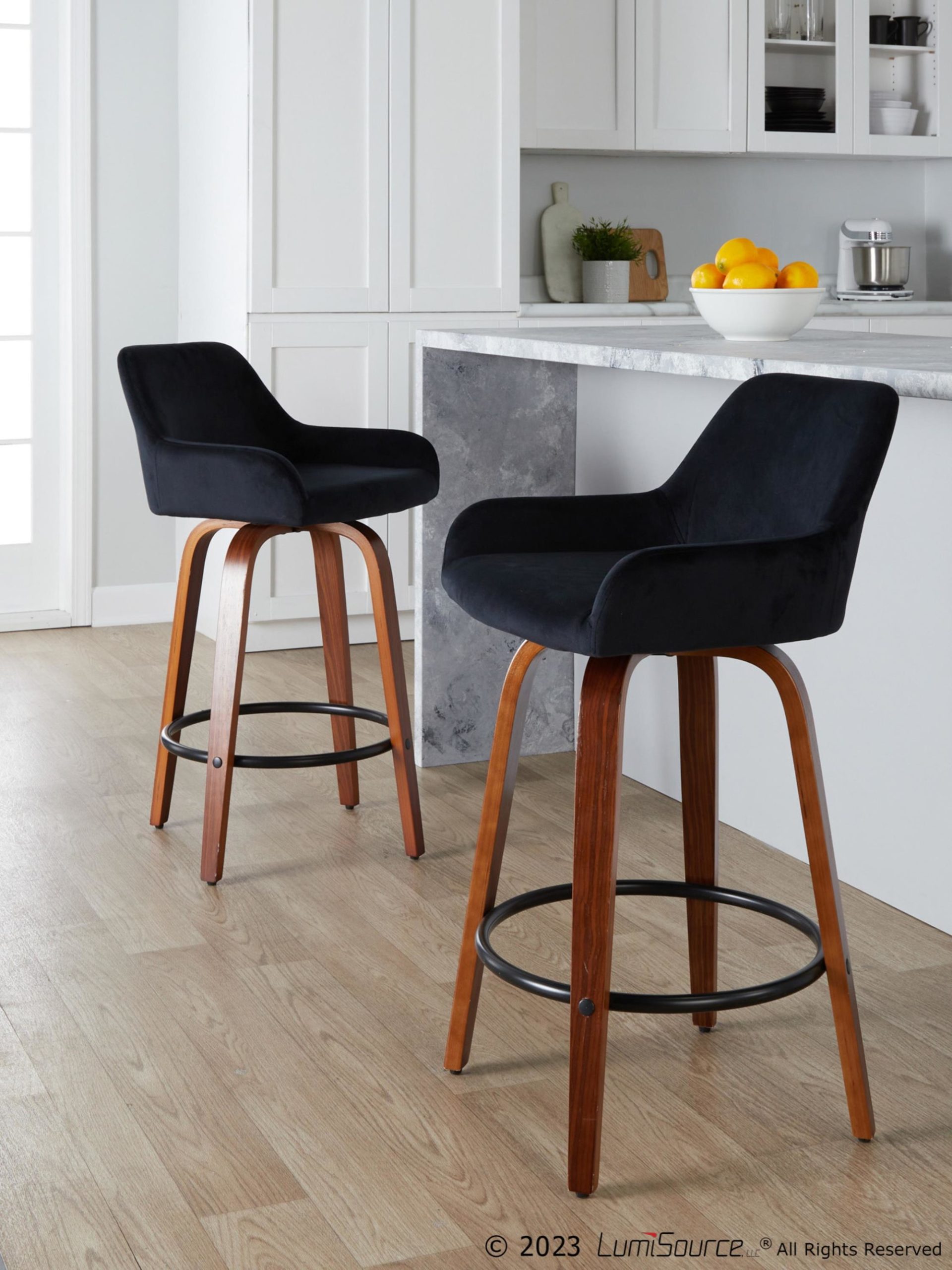 The Daniella 26″ Walnut and Black Velvet Contemporary Stools bring contemporary charm and comfortable seating to your kitchen or bar area. These stylish stools are designed to catch the eye with their sleek lines and inviting features.