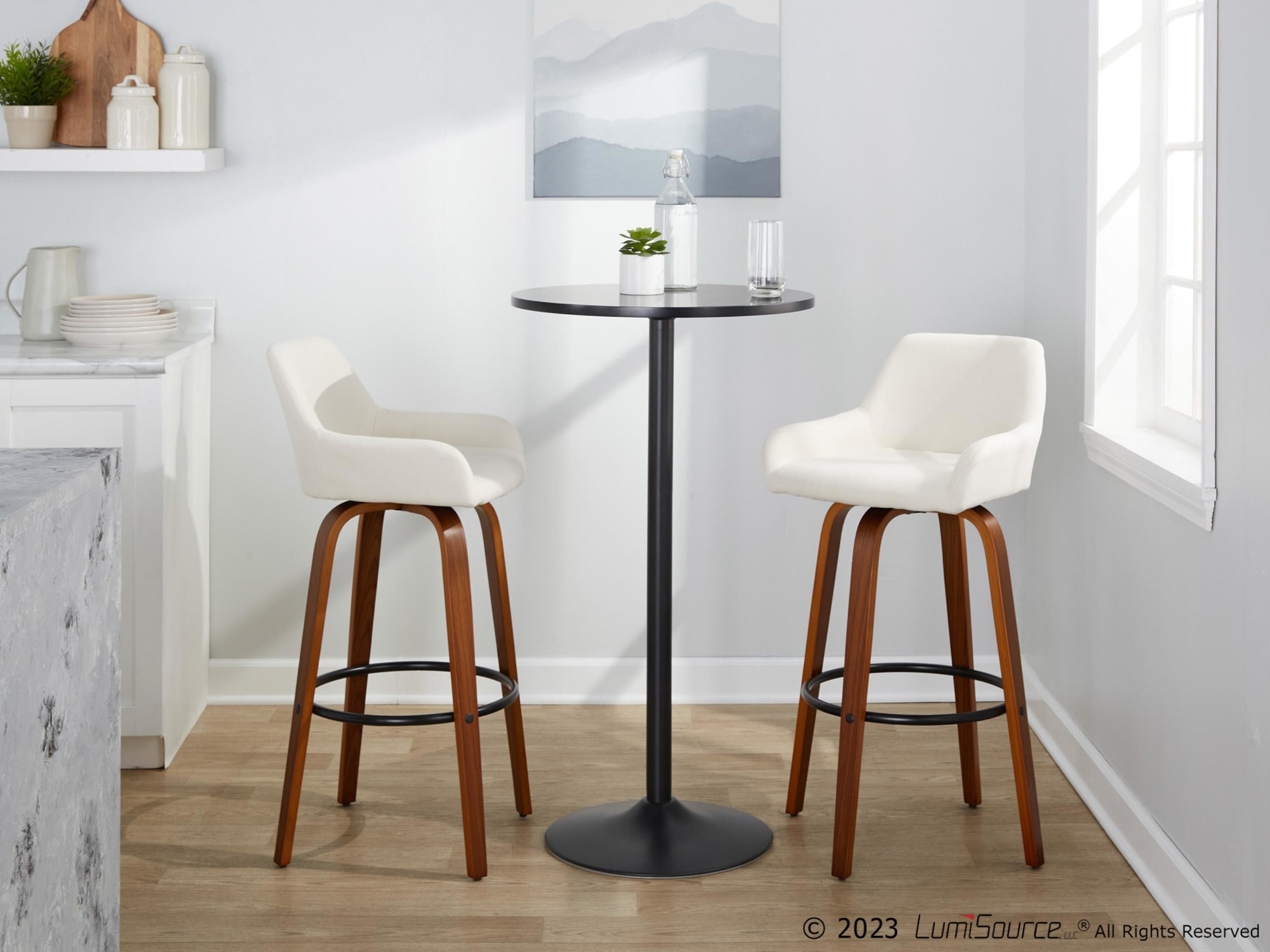 The Daniella 30 Contemporary Walnut and Cream Swivel Barstools add stylish and comfortable seating to your kitchen or bar area. These barstools feature a sleek upholstered swivel seat, padded backrest, and stylish bent wood legs, sure to catch the eye.