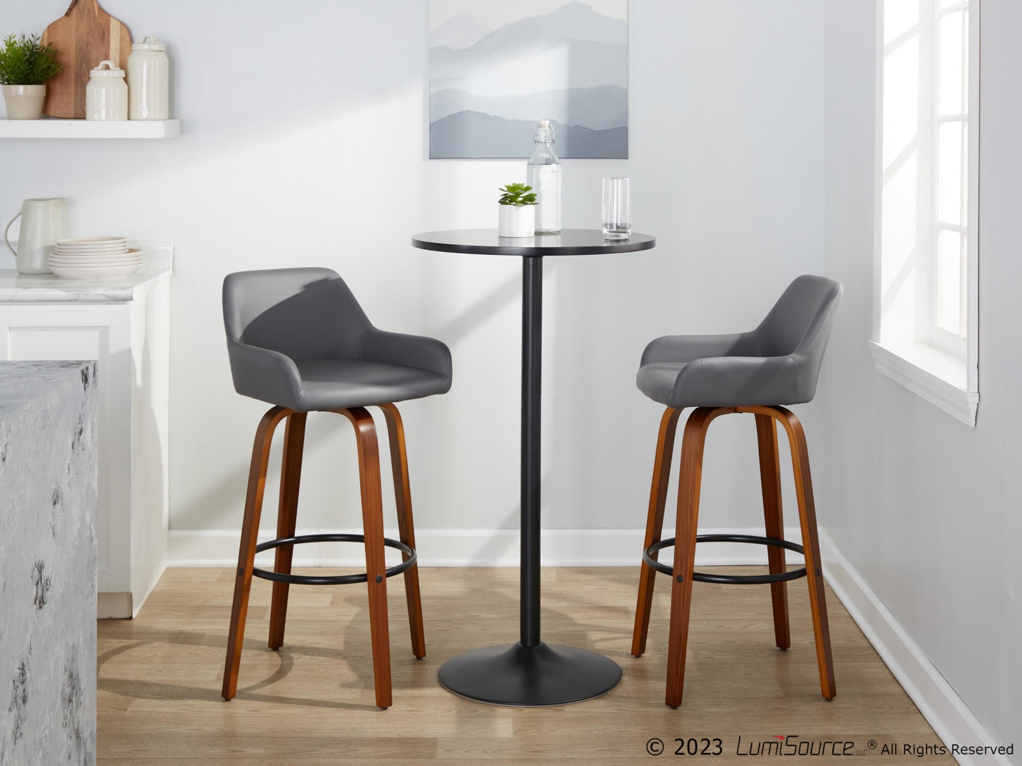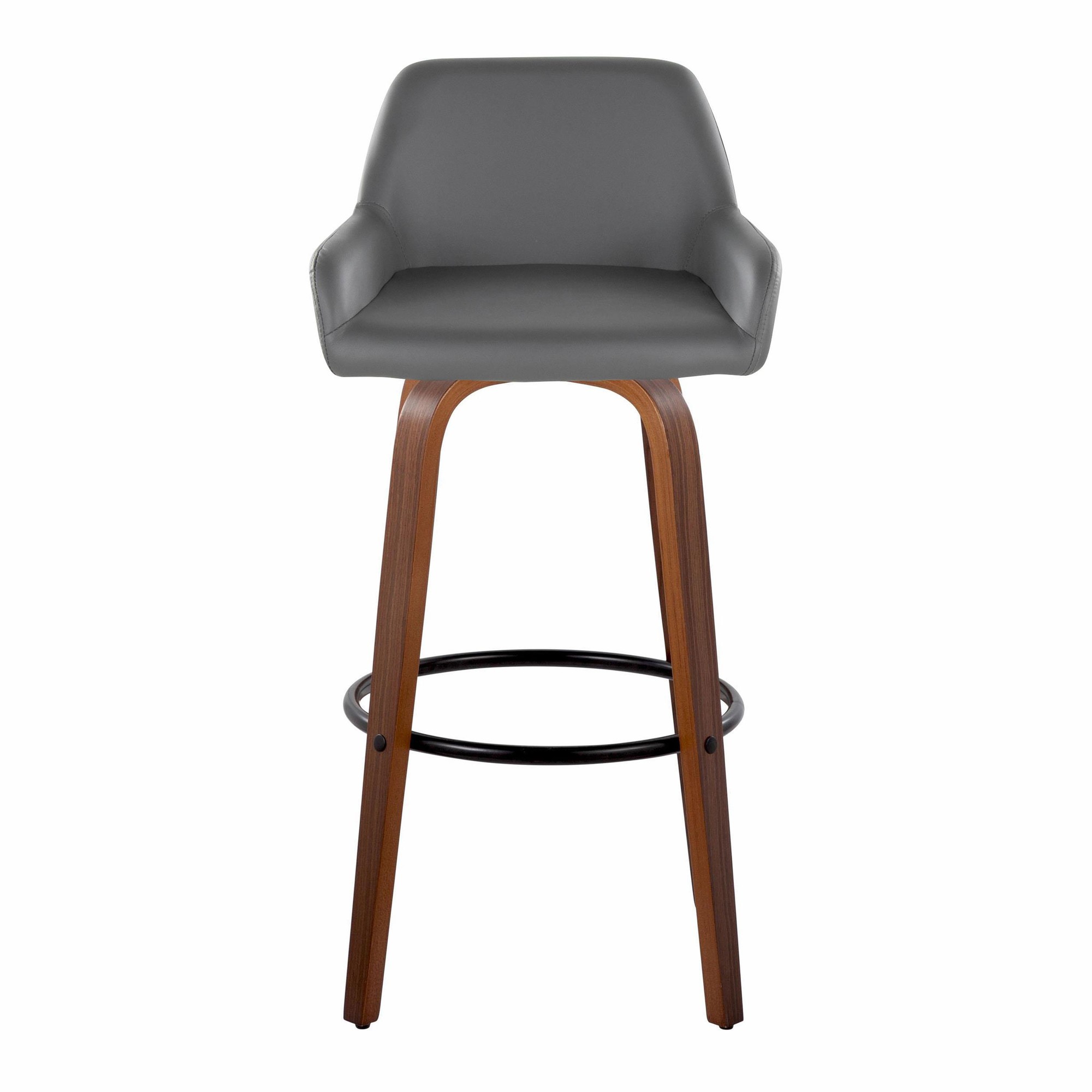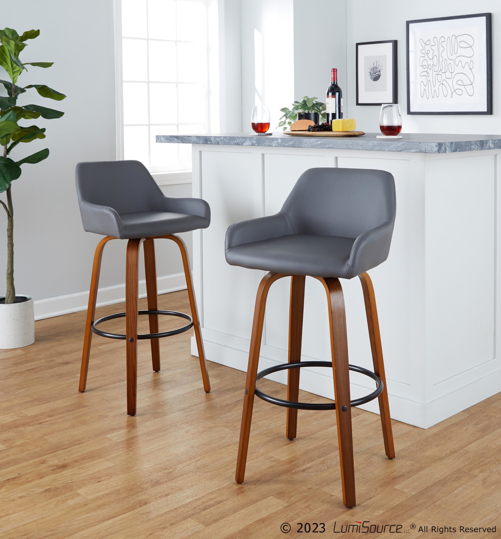 The Daniella 30 Contemporary Walnut and Grey Swivel Barstool adds stylish and comfortable seating to your kitchen or bar area. This barstool is designed with contemporary charm, featuring a sleek upholstered swivel seat and a supportive, padded backrest. The stylish bent wood legs provide a unique and eye-catching design element.