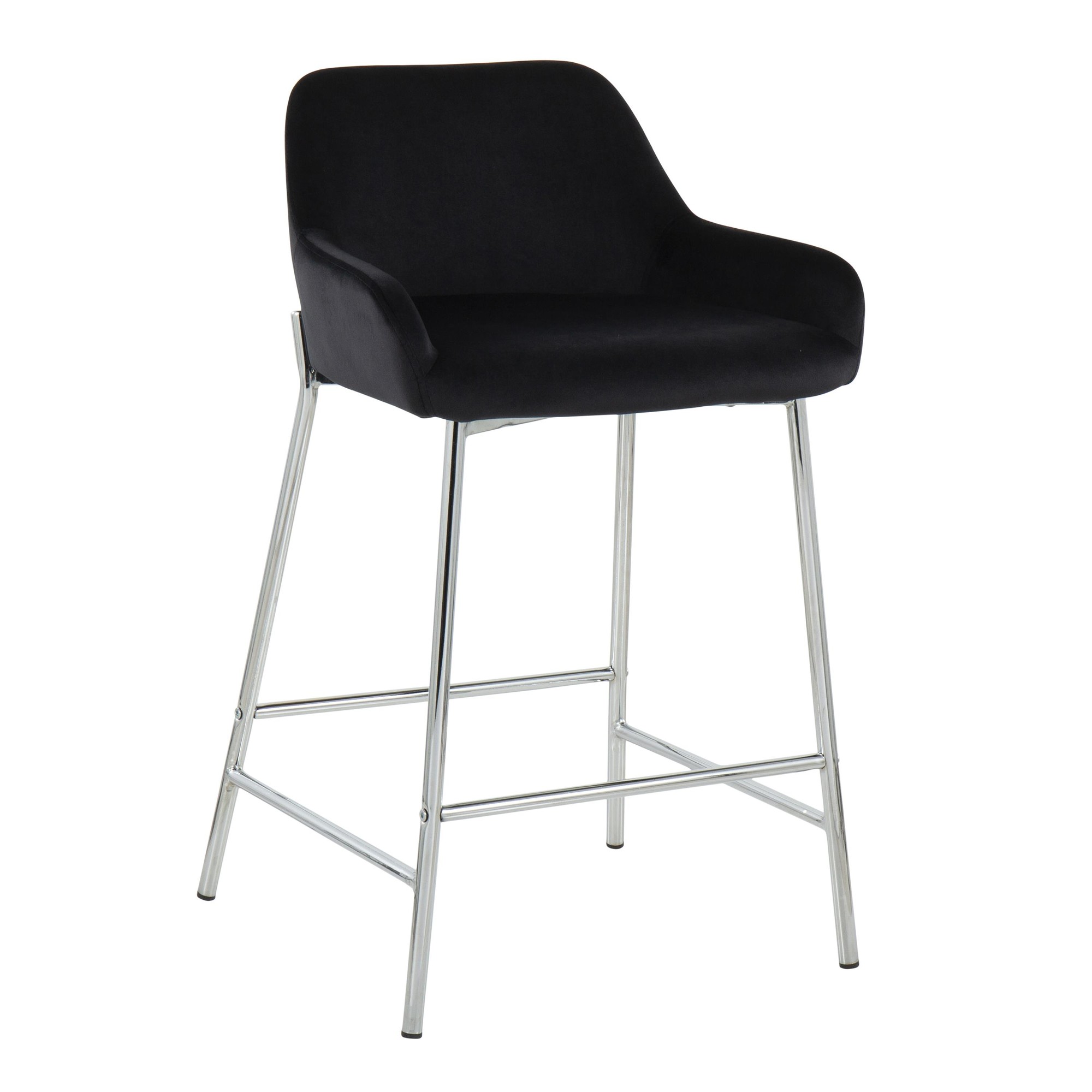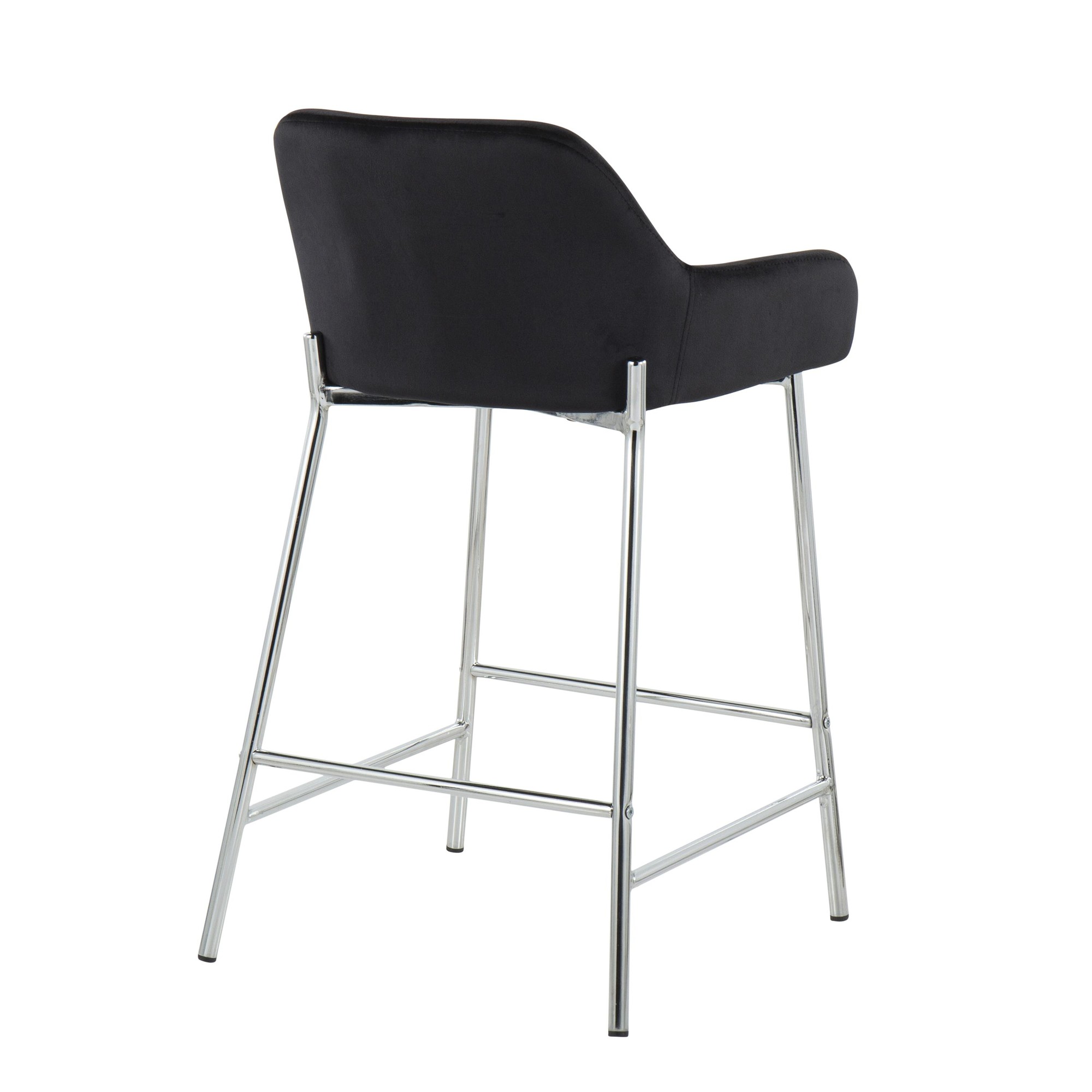 The Daniella Chrome and Black Velvet Contemporary Counter Stools add a touch of contemporary elegance and comfortable seating to your kitchen or bar area. These stools feature a sleek design with a padded seat and backrest, perfect for enhancing your space.
