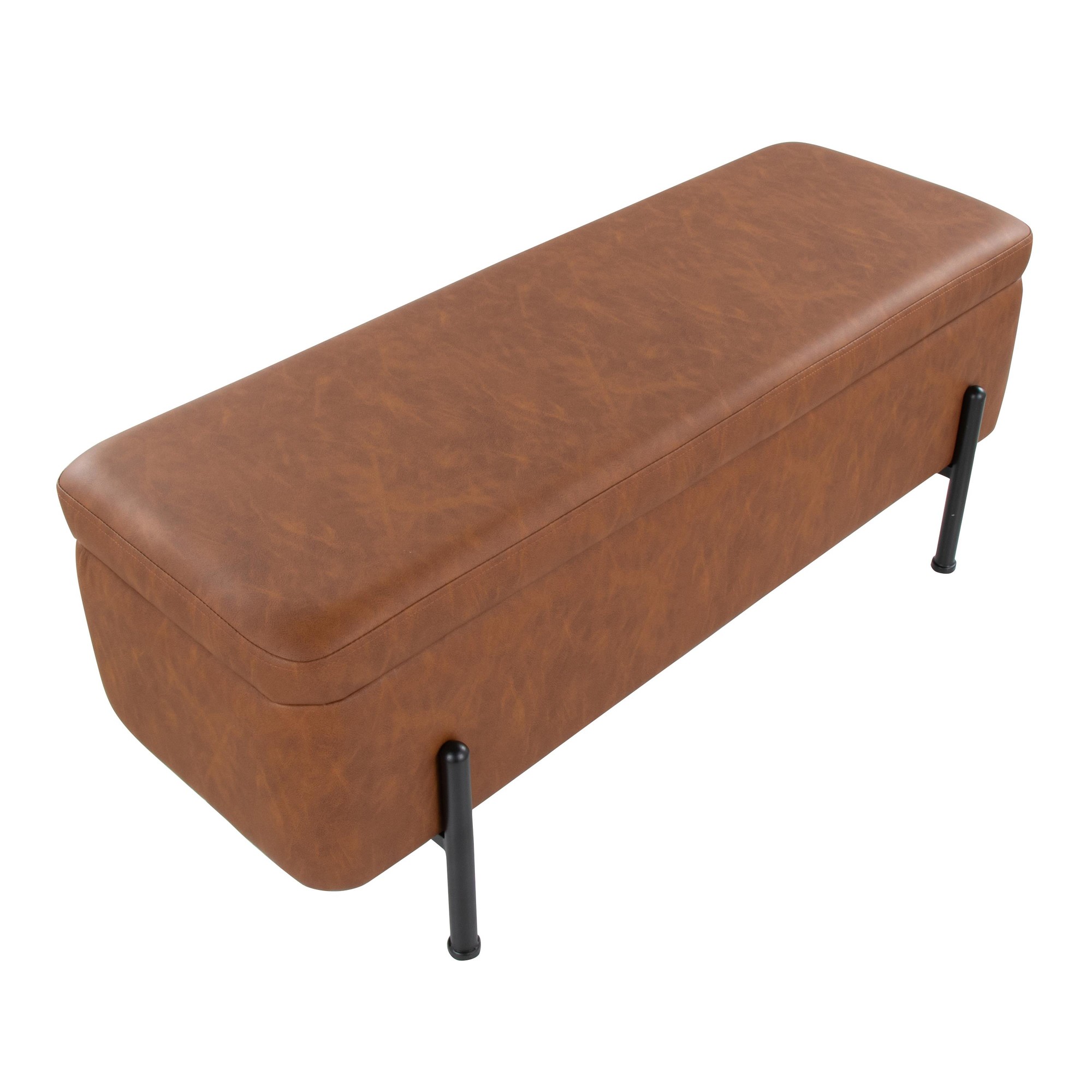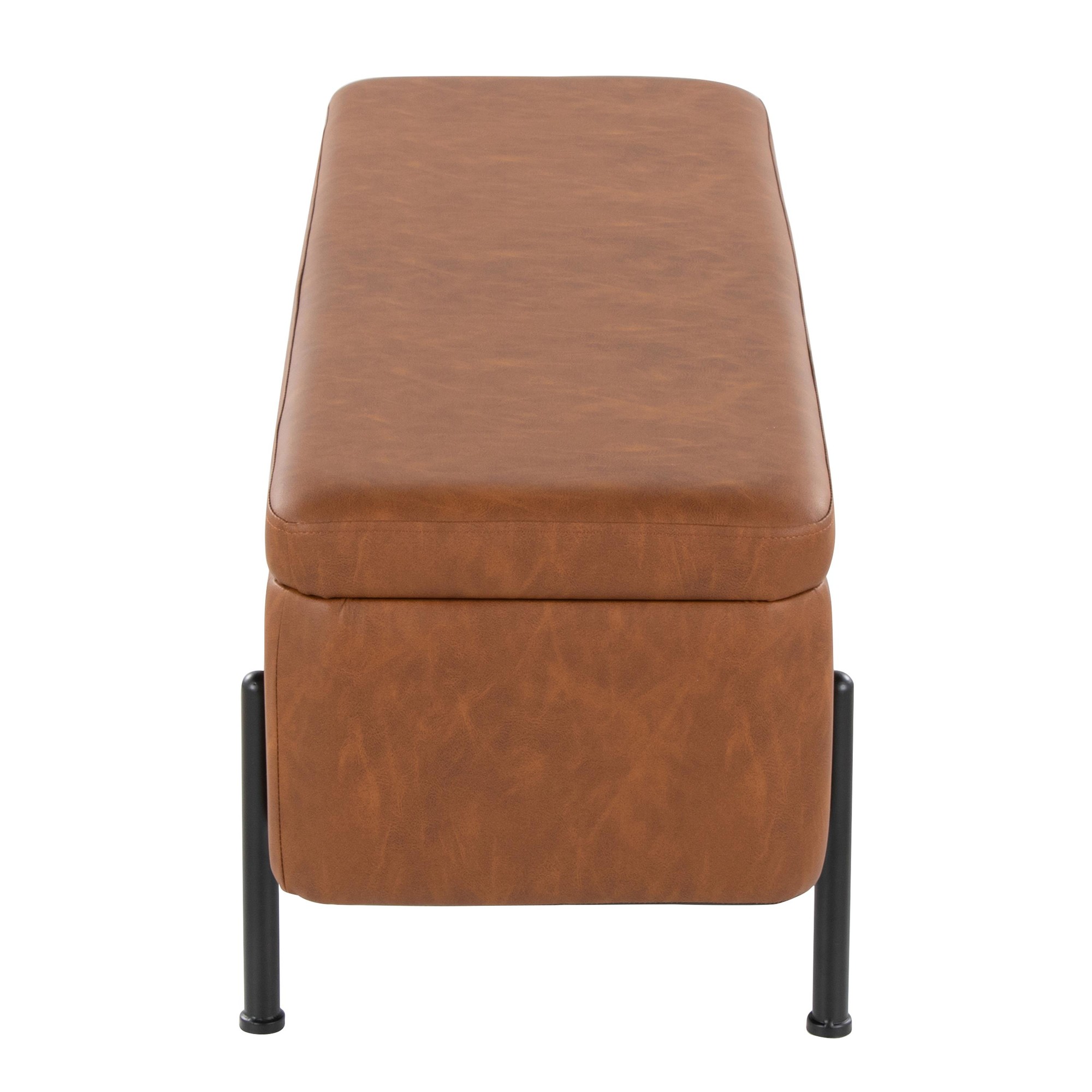 The Daniella Storage Bench features faux leather upholstery beautifully accented by black steel legs. Open the flip-top lid to reveal a roomy storage area, perfect for stashing magazines, remote controls, and anything else you want to keep neatly out of sight. Choose the finish that best complements your space!