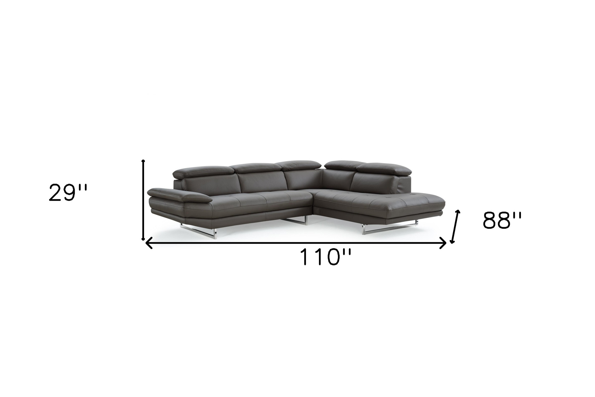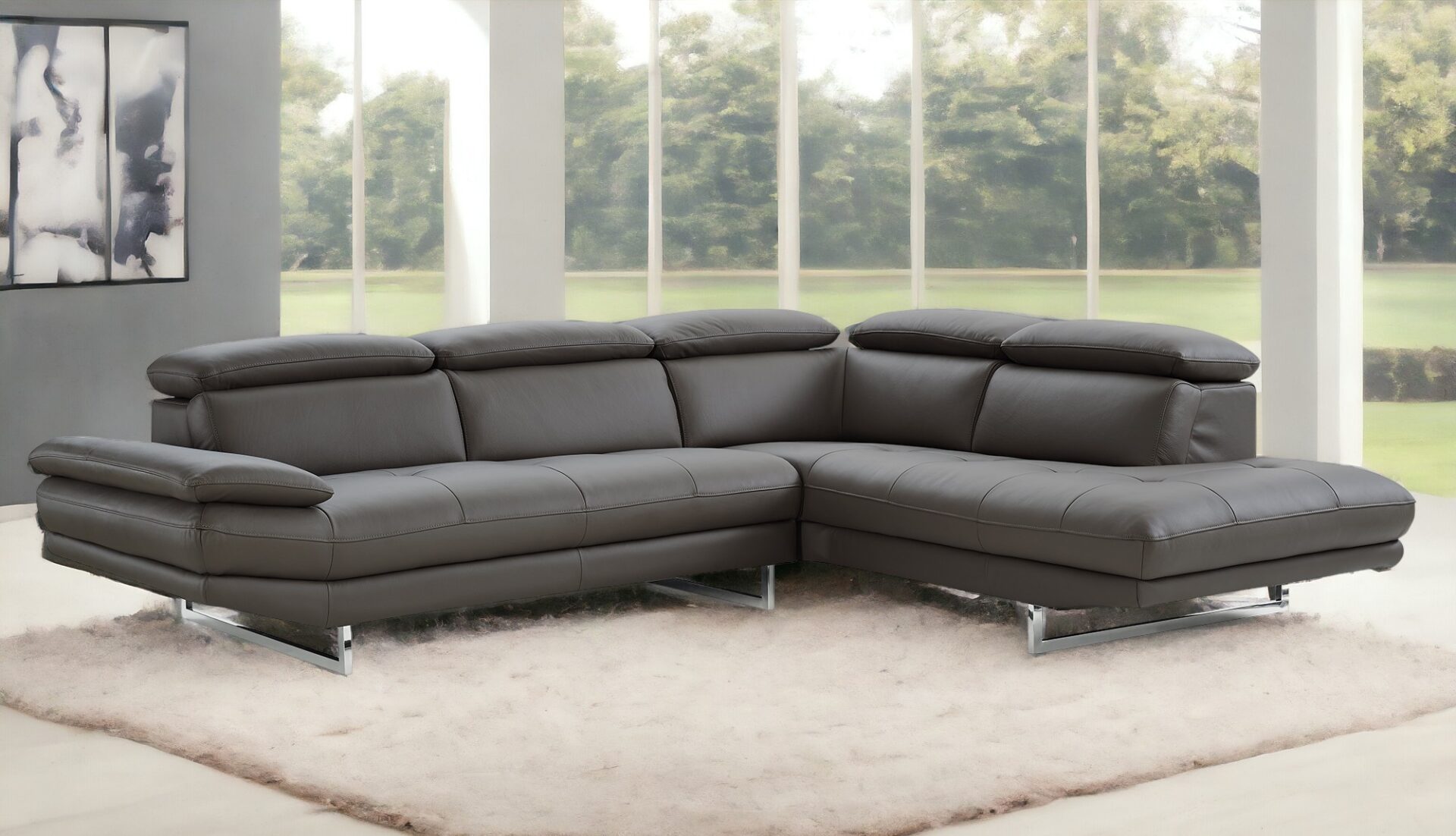Crafted with the highest quality materials, the Dark Gray Genuine Leather L Shaped Sofa with Chaise Sectional is a luxurious centerpiece for any living space. Made from supple, premium-grade leather, it offers an invitingly comfortable lounging experience while elevating the aesthetic of your room. The dark gray upholstery blends seamlessly with various decor styles, and the contemporary silver metal legs add a touch of sophistication. Designed with pillow top arms for extra comfort and a right-facing orientation, this sectional ensures both functionality and style.