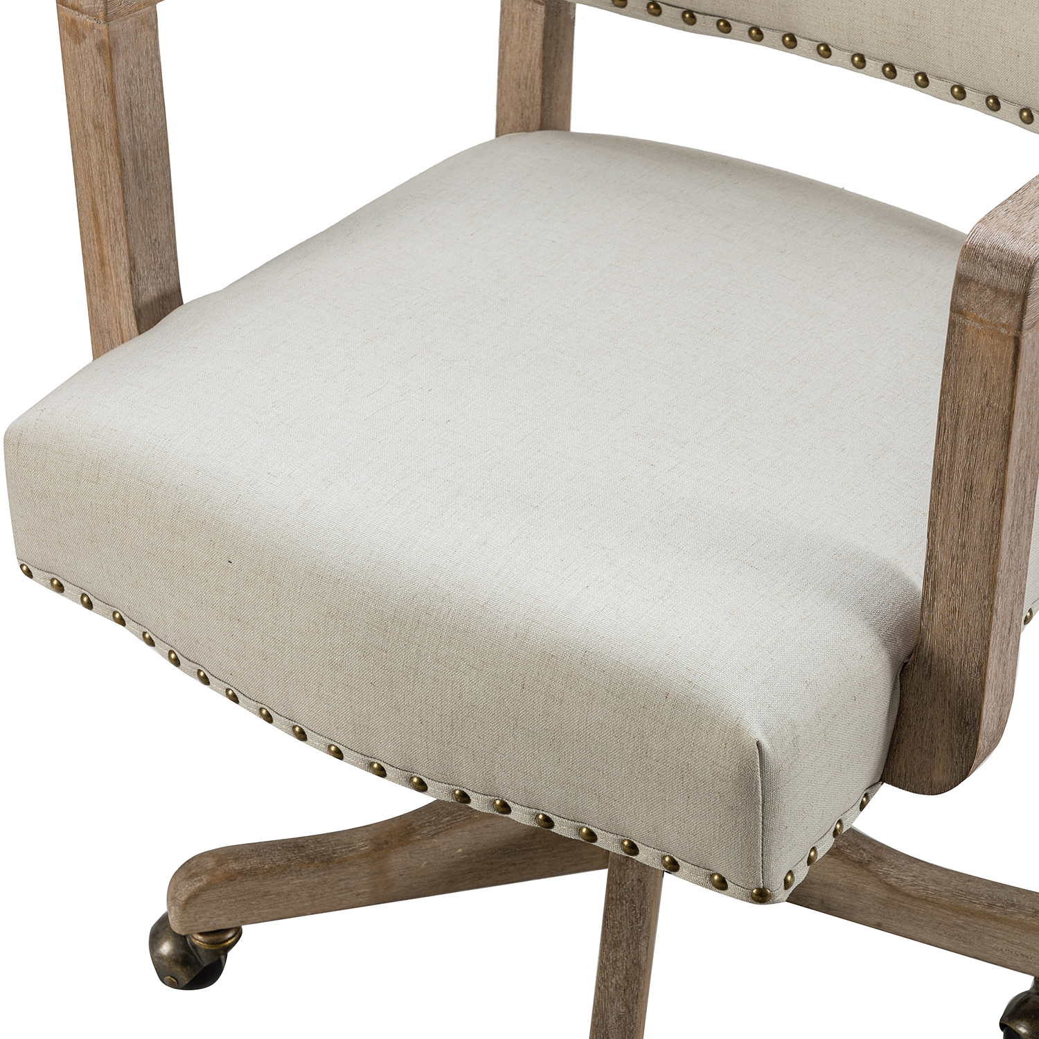 This modern swivel office chair seamlessly blends functionality and style, making it a superb addition to any office or home workspace. Upholstered in a sophisticated linen blend fabric, it complements diverse design aesthetics. The chair features elegant nailhead trim, tilt control, a swivel mechanism, and adjustable height, ensuring both comfort and ergonomic support. The durable wooden base, equipped with 360-degree iron wheels, allows effortless mobility across any room.