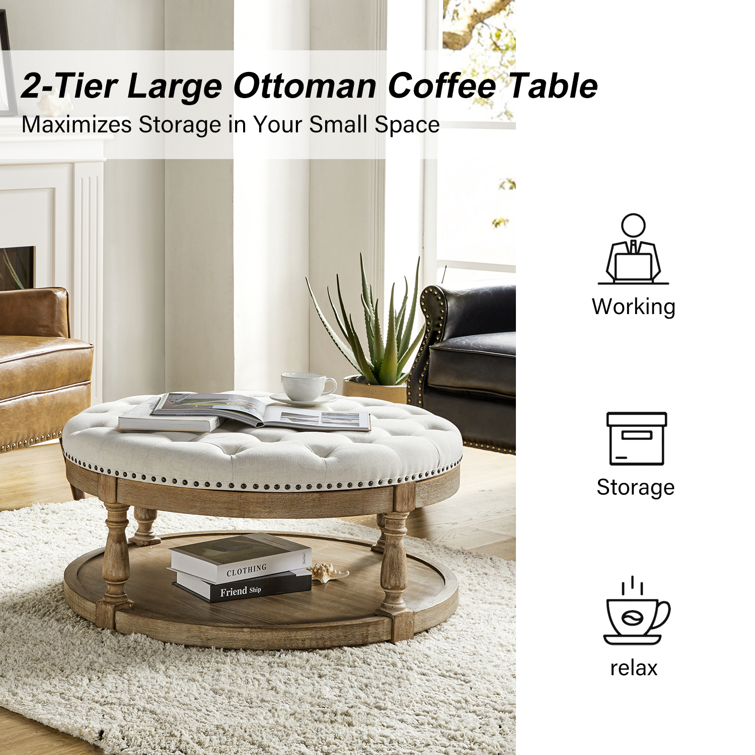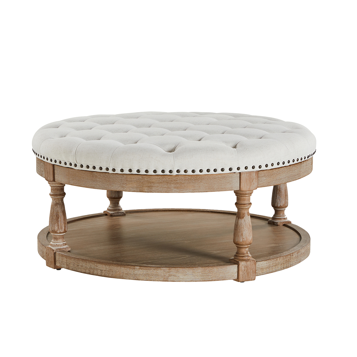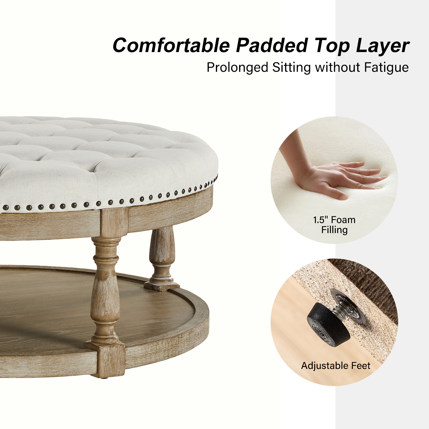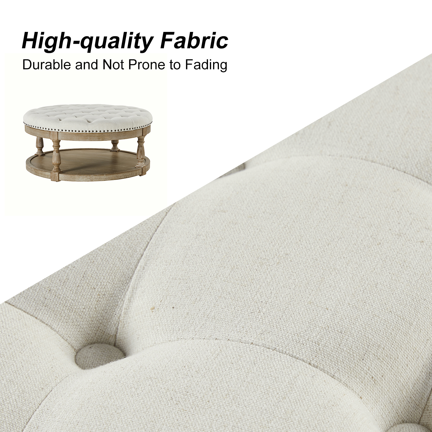 Embellish your living space with this fantastic round storage cocktail ottoman! It’s not just a comfy place to rest your feet or an extra seat; its elegant button-tufted design with nailhead trim makes a statement. Crafted with water, stain, and mildew-resistant fabric, this ottoman is built to last and easy to care for. Enjoy the perfect blend of sturdiness and comfort with its solid wood legs supporting a soft, foam-filled wooden frame. Plus, the built-in storage shelf underneath is perfect for stashing magazines, books, or slippers!