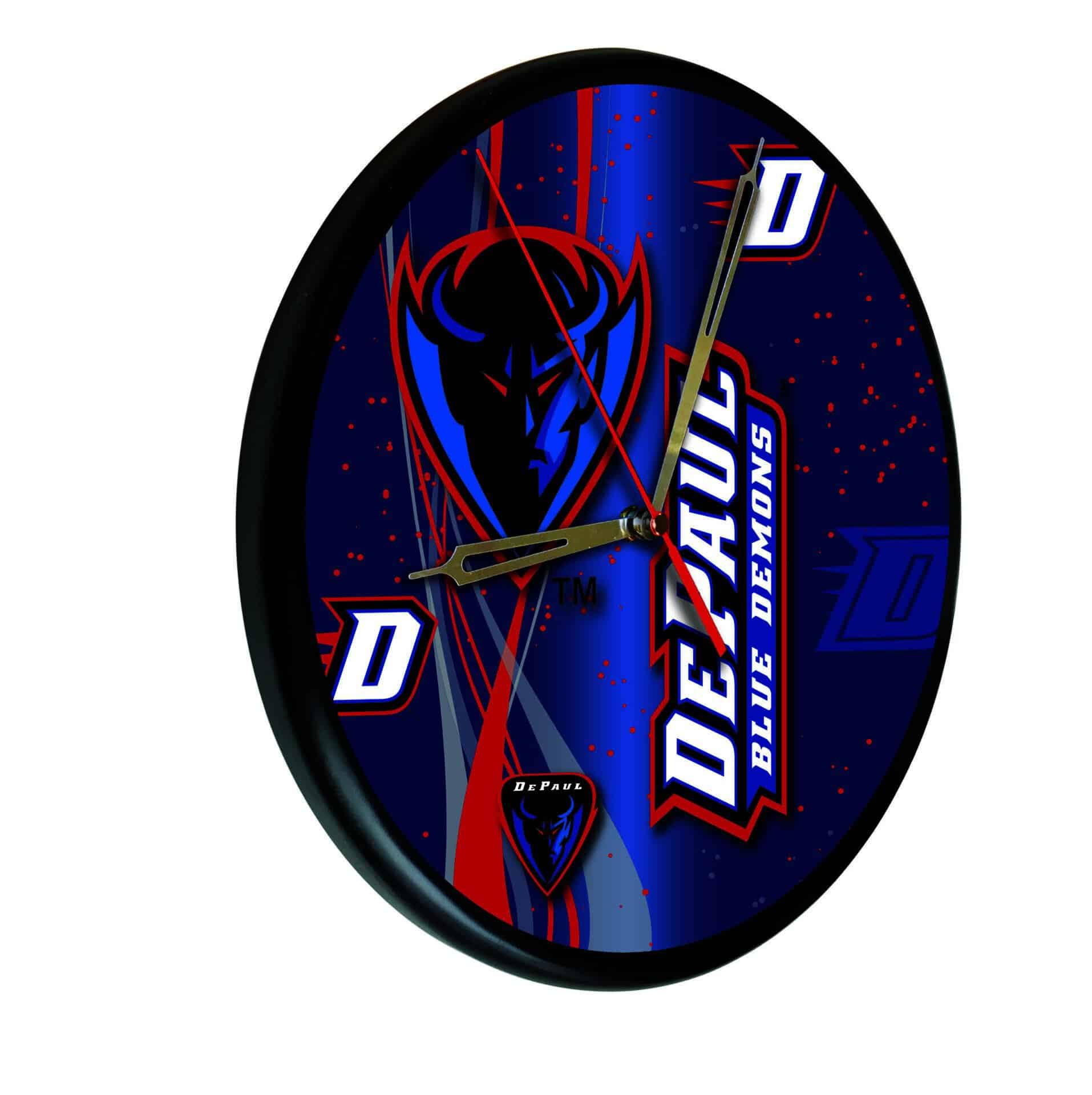 The DePaul University 13-Inch Solid Wood Clock in Black is an ideal way to express your school spirit while enhancing your space. This officially licensed clock features first surface, digitally printed graphics using UV inks that resist fading over time. With accurate quartz movement, this clock ensures precise timekeeping and is powered by a single AA battery (not included). The recessed keyhole hanger allows for a sleek and flush mounting on your wall, creating a polished appearance. Perfect as a gift for graduates, sports enthusiasts, or for personal use, this clock combines functionality with style.