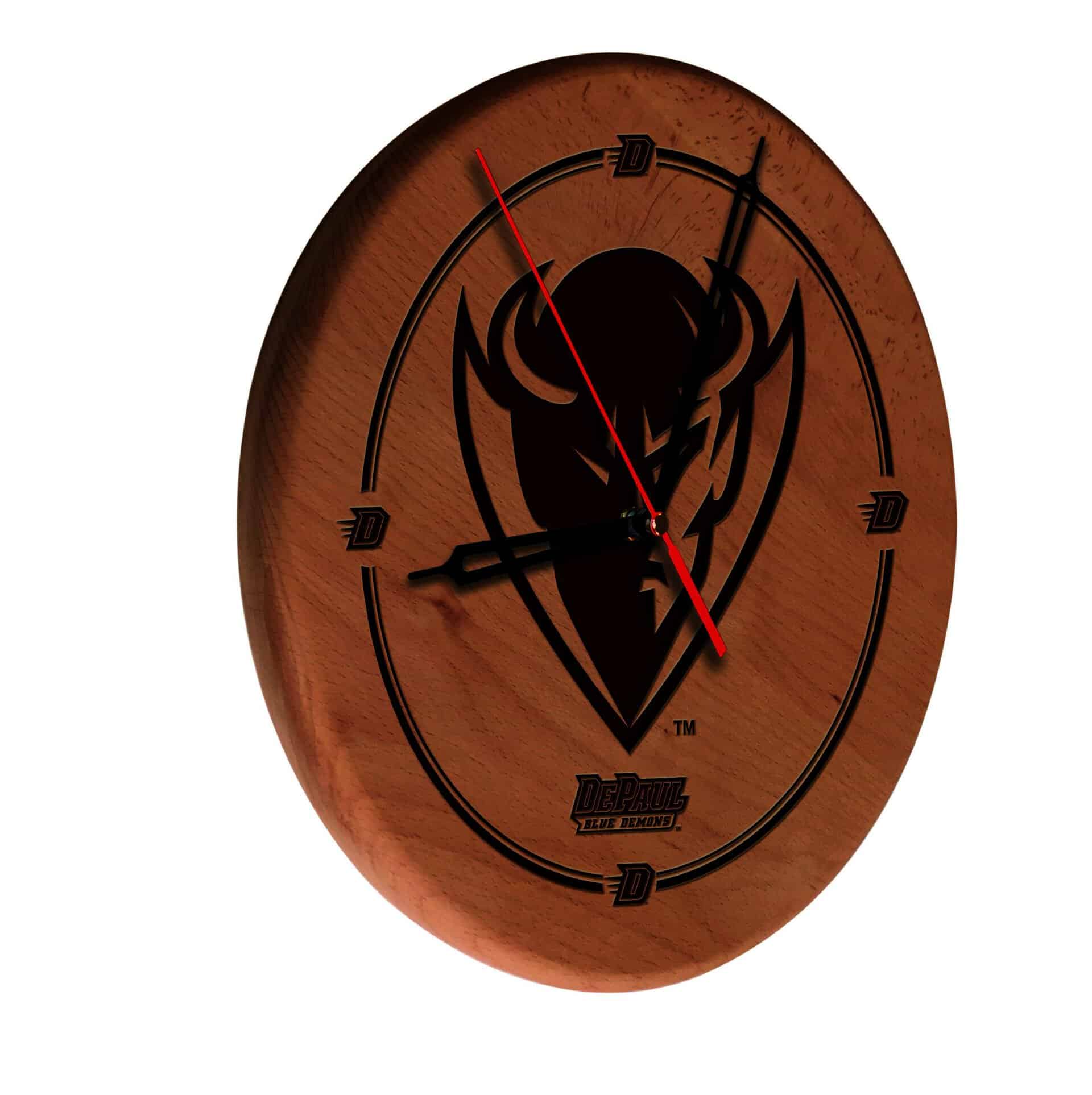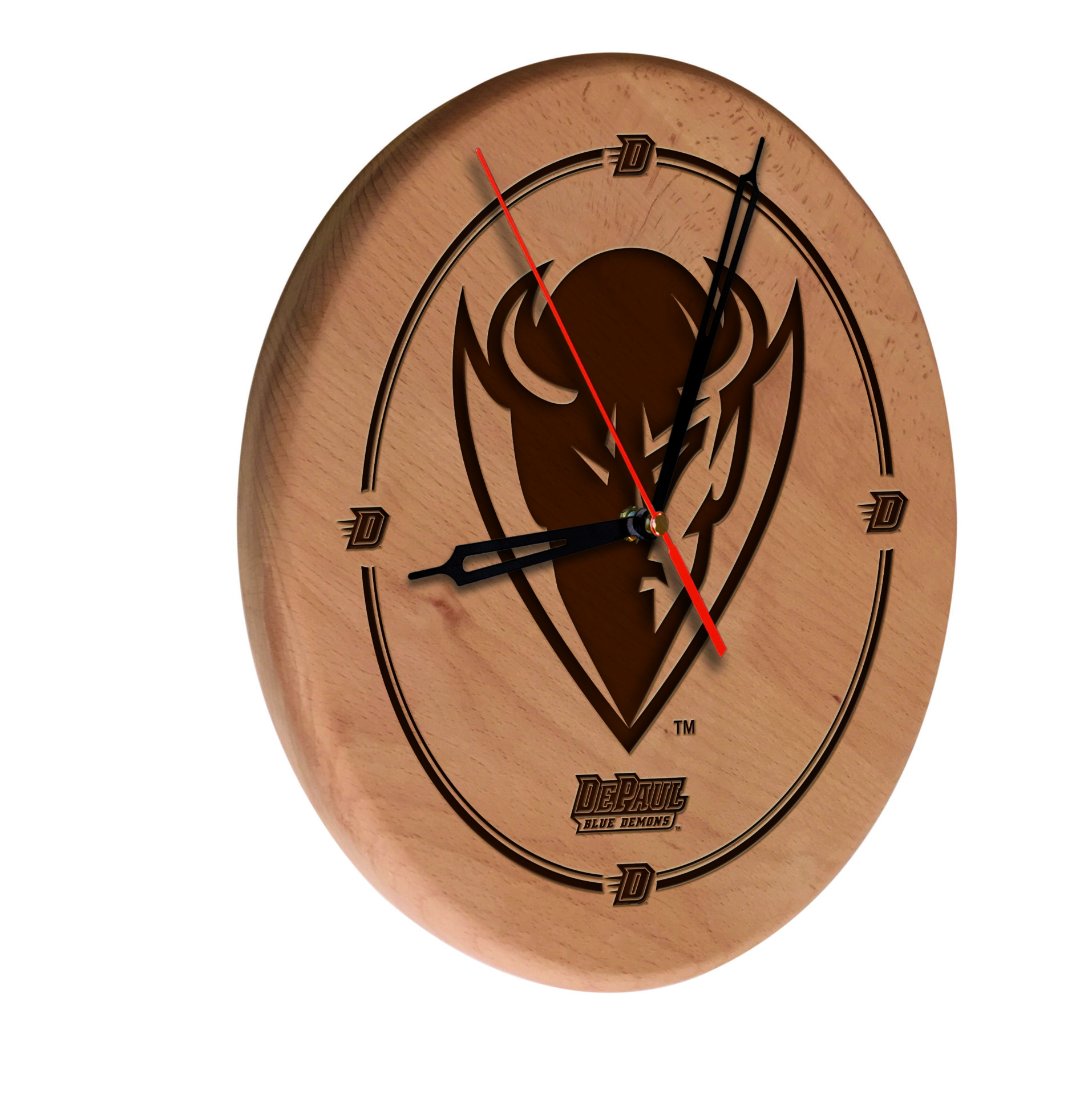 The DePaul University 13-Inch Solid Wood Engraved Clock in Natural is the perfect addition to any man cave, showcasing your school pride while providing functionality. This clock features laser engraved graphics that are officially licensed, ensuring a unique and authentic design. With accurate quartz movement, it keeps precise time and is powered by a single AA battery (not included). The recessed keyhole hanger allows for a sleek and flush mount against the wall, providing a polished look. Ideal as a gift for graduates, sports fans, or for personal use, this clock brings a touch of elegance and school spirit to any space.