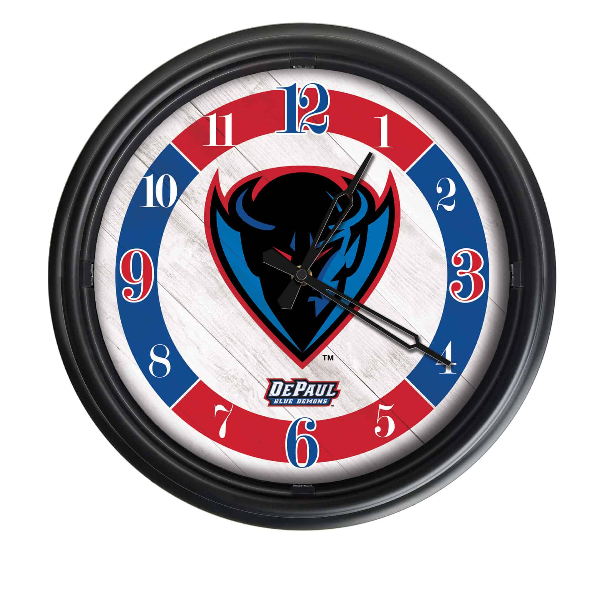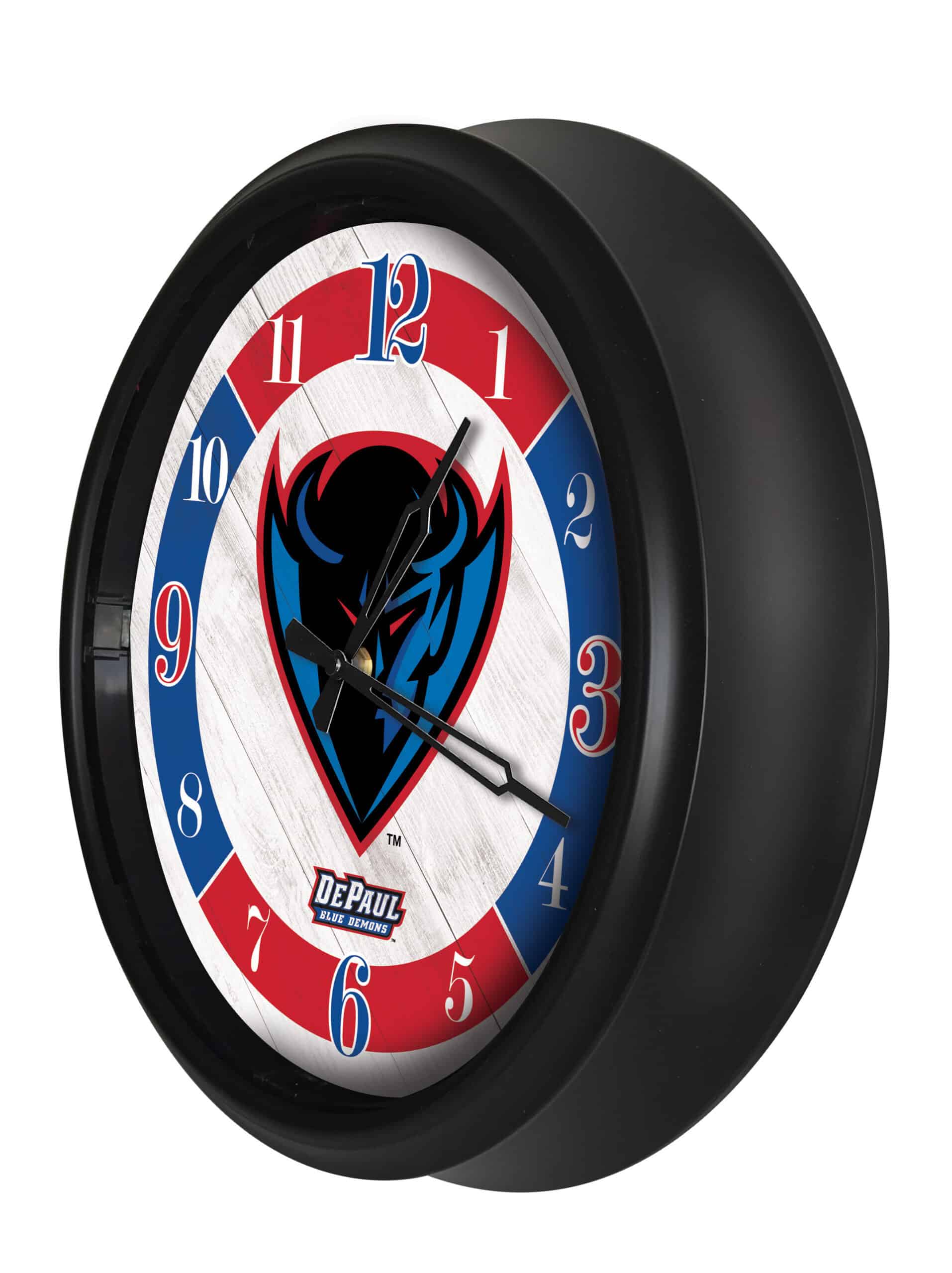 The DePaul University 14-Inch Indoor/Outdoor LED Wall Clock in Black is the perfect addition to any man cave or outdoor space, showcasing your school pride while offering functionality. This clock features a robust design made from UV resistant materials, ensuring it withstands the elements. The illuminated clock face is powered by energy-efficient LED lights that automatically turn on in low light conditions, providing visibility day or night. With its vibrant, fade-free artwork and accurate quartz movement, this clock is not just a decorative piece but also a reliable timekeeper.