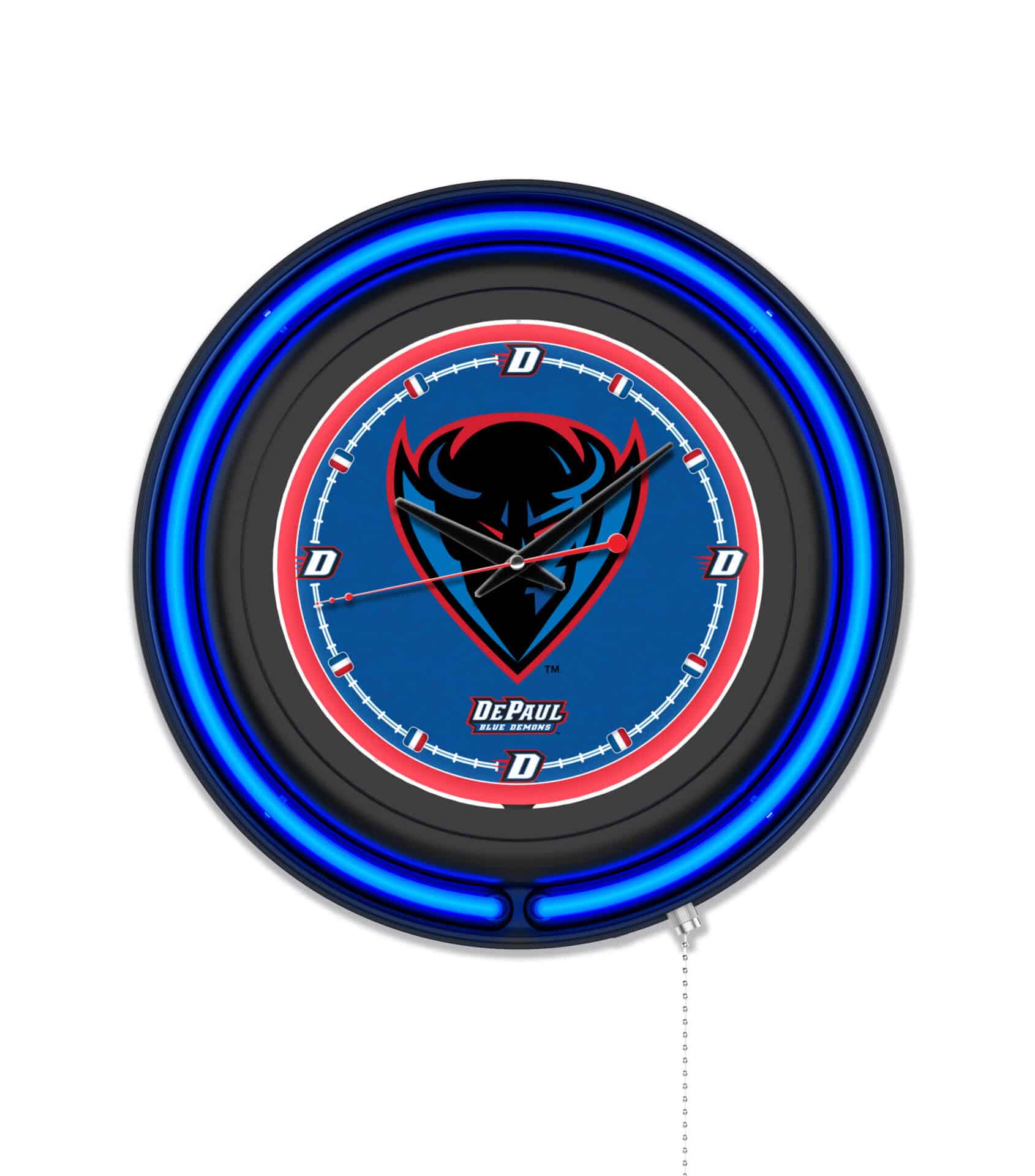 The DePaul University 15-Inch Neon Logo Clock in Black is a striking addition to any man cave, showcasing your school pride with vibrant colors and a sleek design. This clock features a durable black casing and a team color-specific neon outer ring, beautifully illuminating the custom printed clock face with a brilliant white inner neon ring. The neon lights can be easily turned on and off with a convenient pull chain, making it both functional and stylish. With accurate quartz movement, this clock ensures you always keep track of time while adding a touch of collegiate flair to your space.