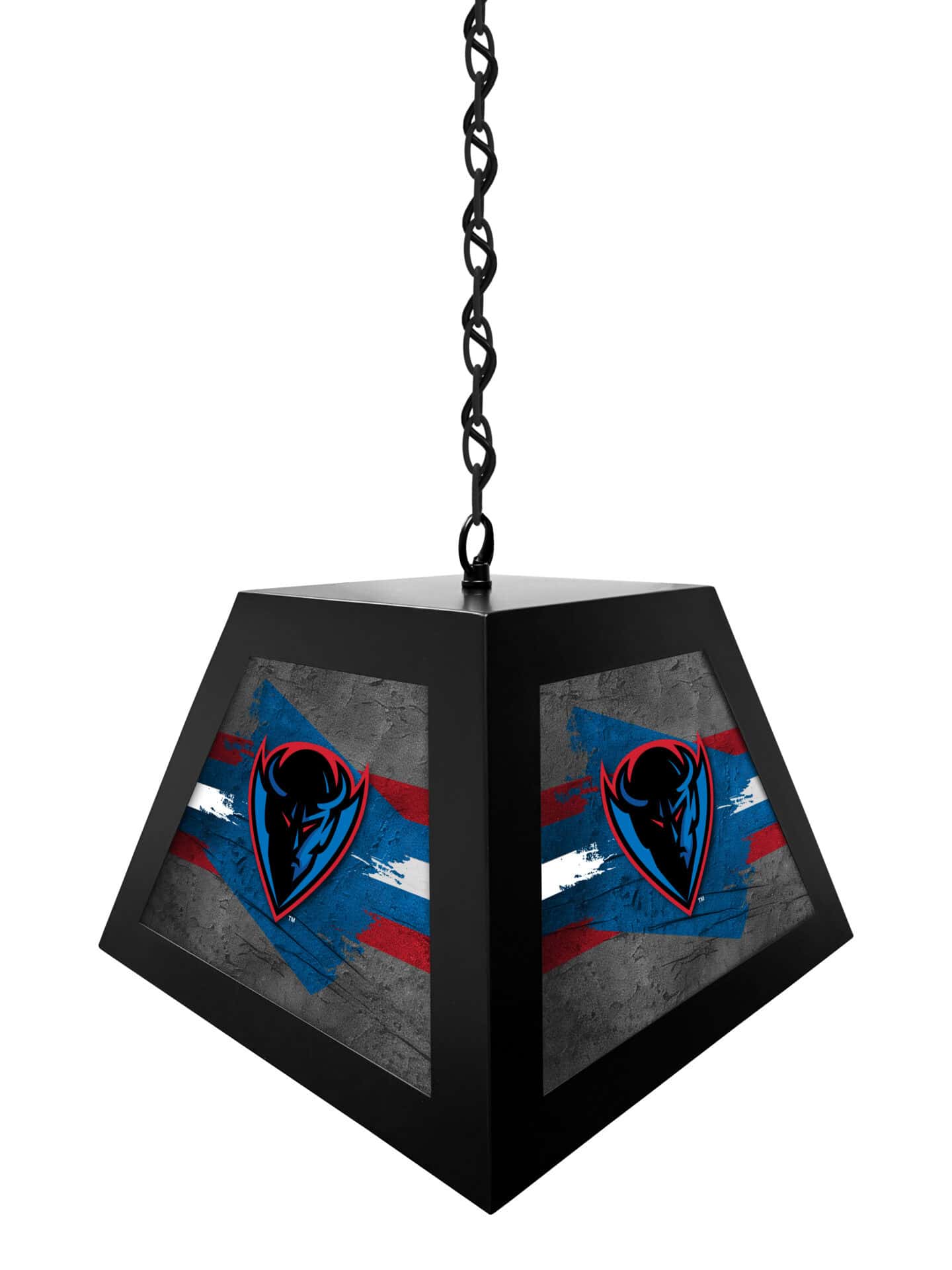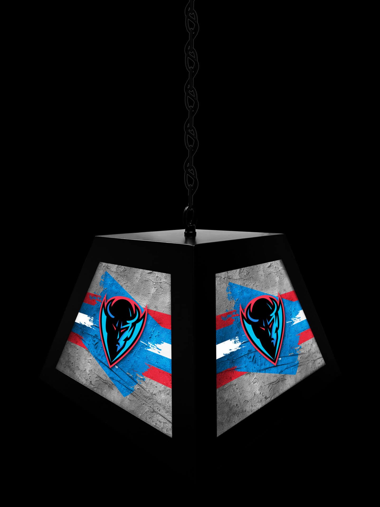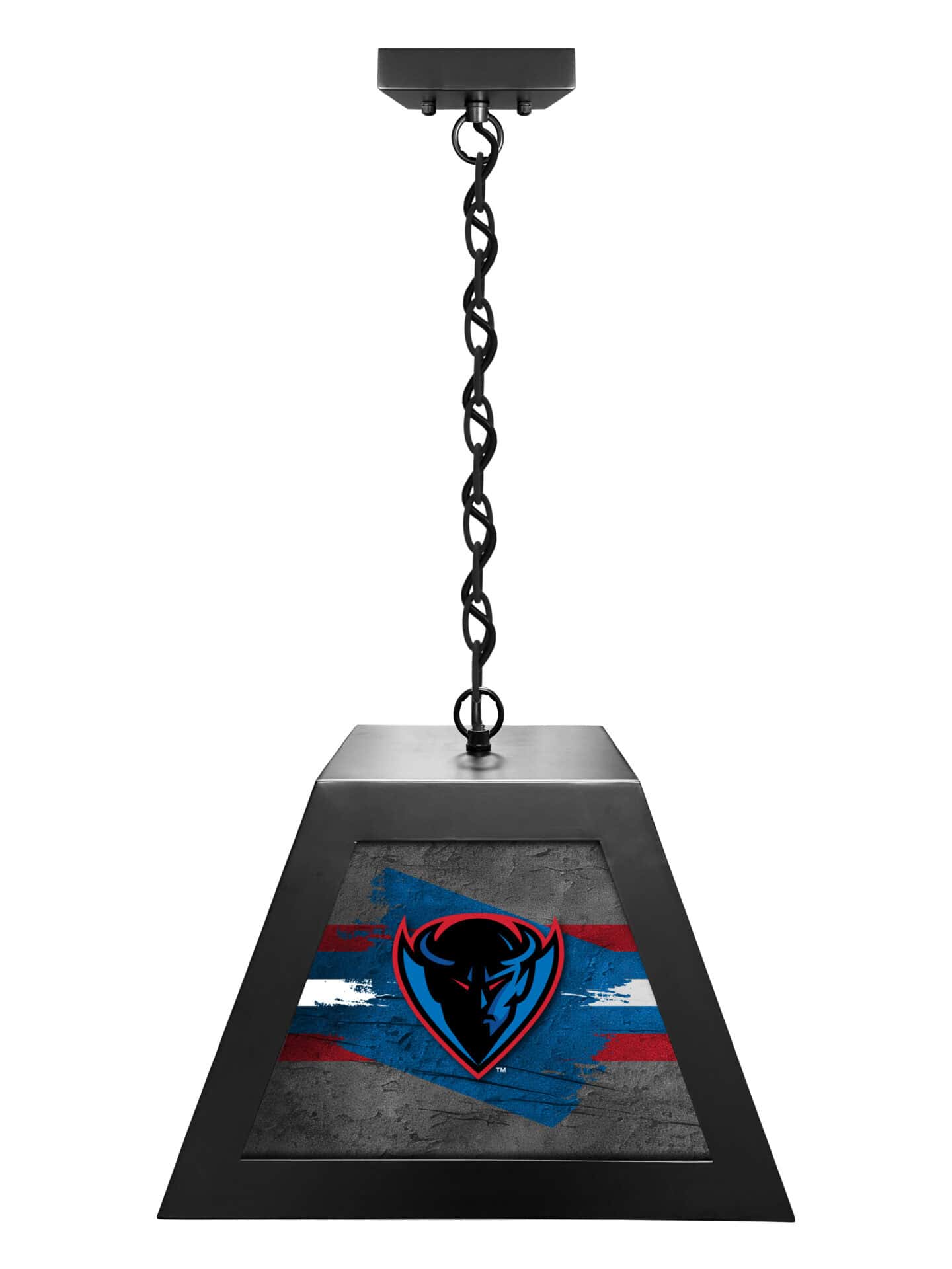 The strong metal frame and durable hanging chain, designed to conceal the cord, feature a sleek black finish. The shatter-resistant acrylic panels are digitally printed with UV-cured ink for exceptional vibrancy. An on/off pull chain provides easy operation. Choose from officially licensed logos or customize your own.