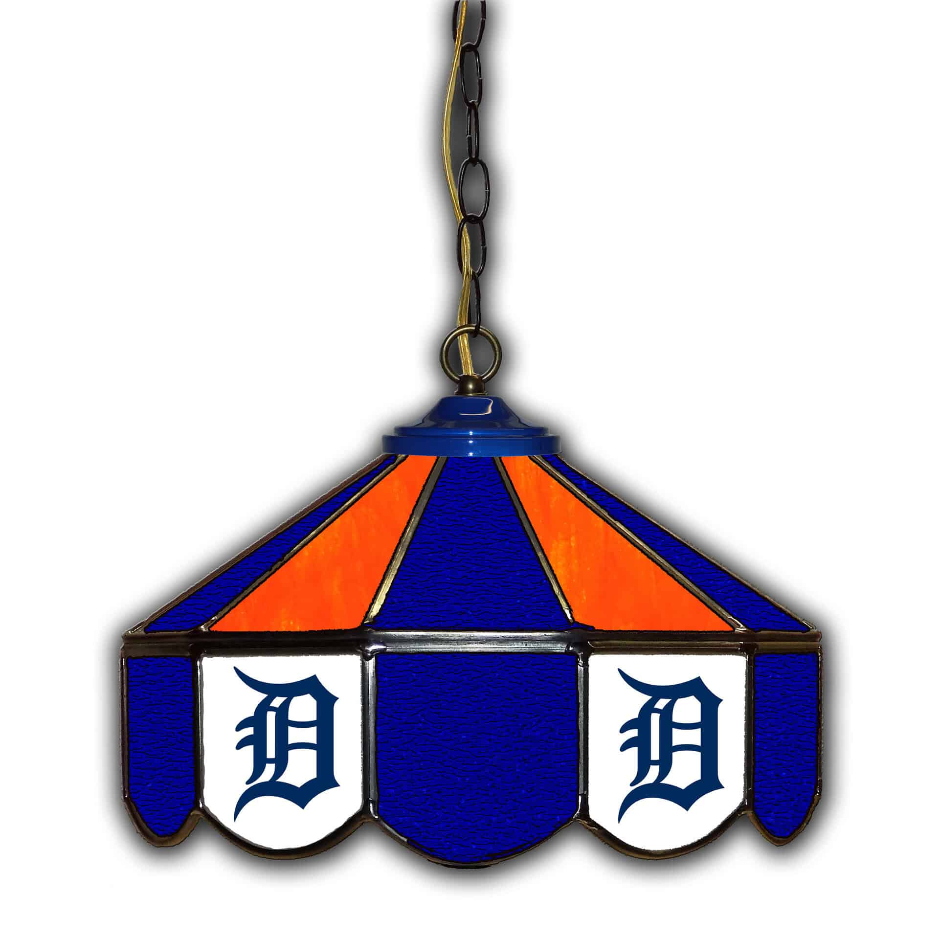 Show your team pride with this Detroit Tigers Stained Glass 14 inch Pub Light. Each piece of glass is cut and placed by hand. The pieces are soldered with care by skilled artists. The light is fully wired with a UL approved porcelain light socket. It also has a 12-foot cord with an inline switch and plug. This light has 9-feet of heavy duty antique brass chain. It adds a touch of luxury to the lamp. It is handmade in the USA. The lamp measures 14″ wide x 10″ high and weighs 12 pounds. Please note that mounting hardware and the bulb are not included. Please allow 3-4 weeks for shipping.