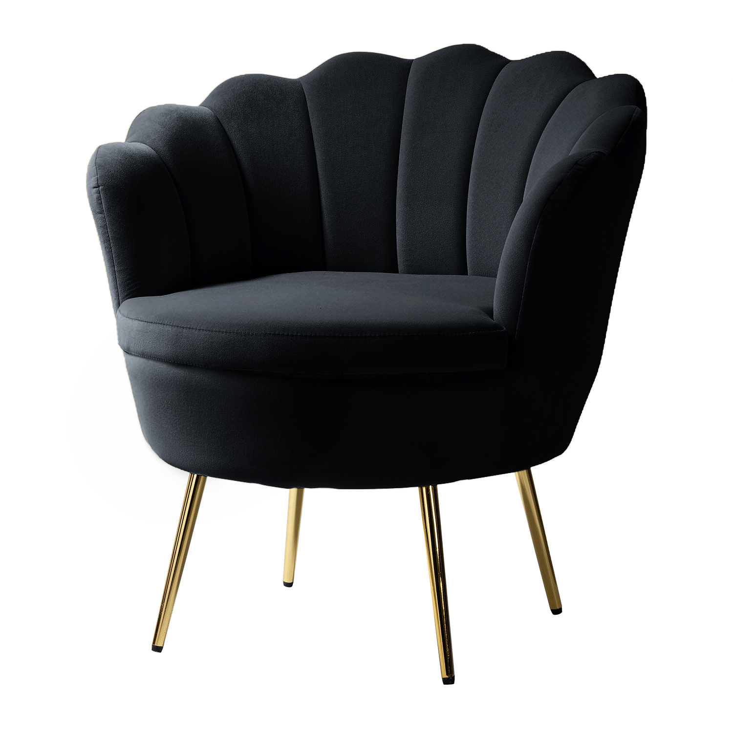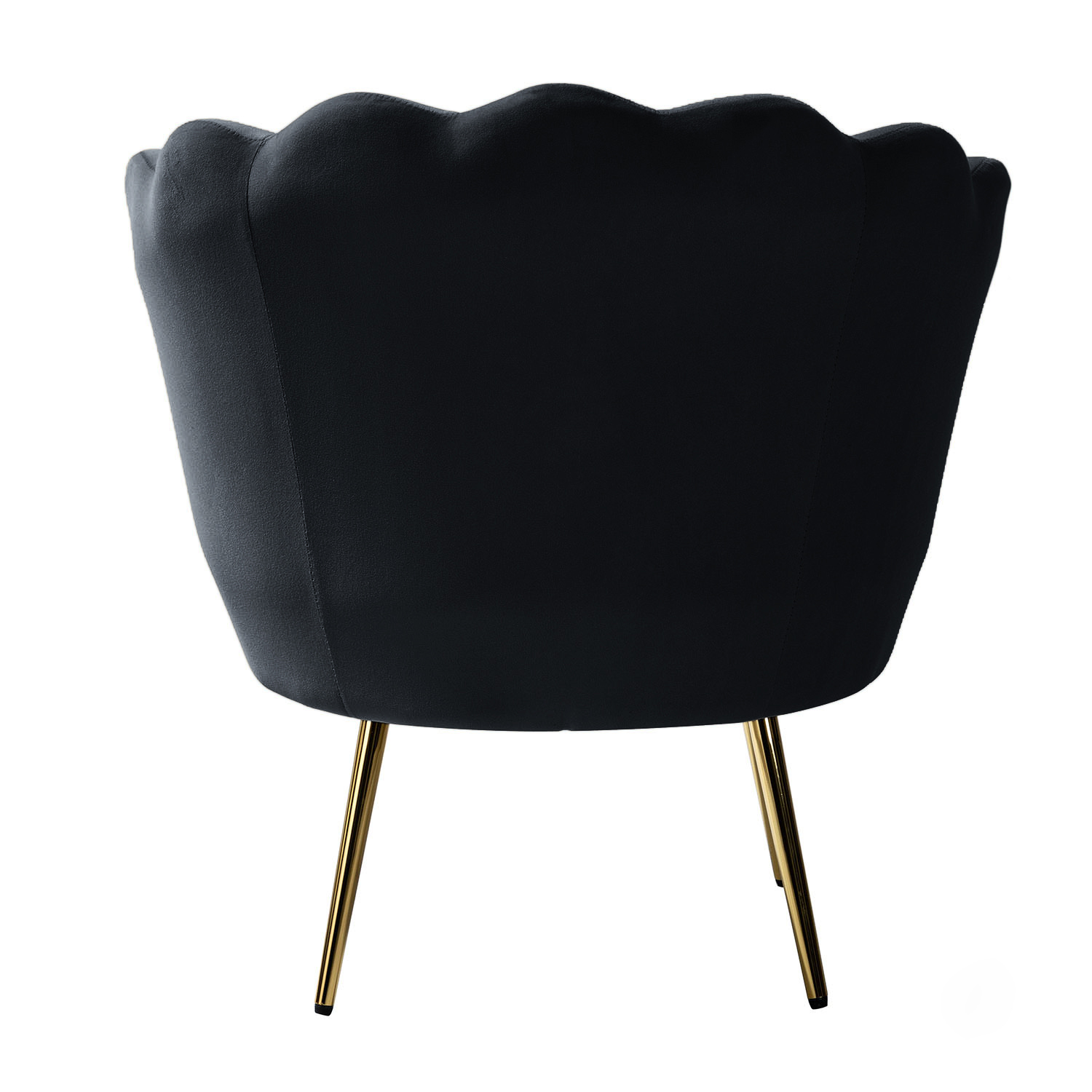 The Donata Black Velvet Channel Tufted Barrel Accent Chair is a versatile addition to any space, perfect for curling up with a book or adding a touch of elegance. This classic and contemporary accent chair features a stunning vertical channel-tufted back, crafted with premium velvet fabric for ultimate comfort. Its on-trend solid hue effortlessly complements any color scheme. Enjoy superior comfort and support thanks to the high-density foam filling and a sturdy wood frame. The slender, polished golden metal legs inject a dose of modern design, enhancing the chair’s timeless appeal. The scalloped seashell edges add a touch of artful elegance, making it an ideal choice for living rooms, offices, bedrooms, and seating areas.
