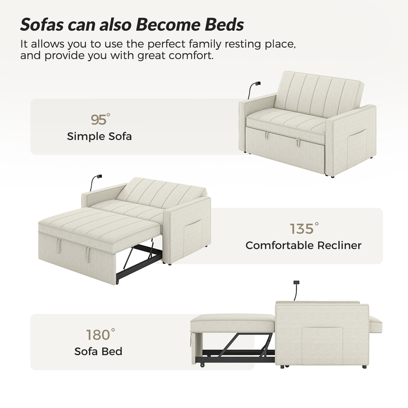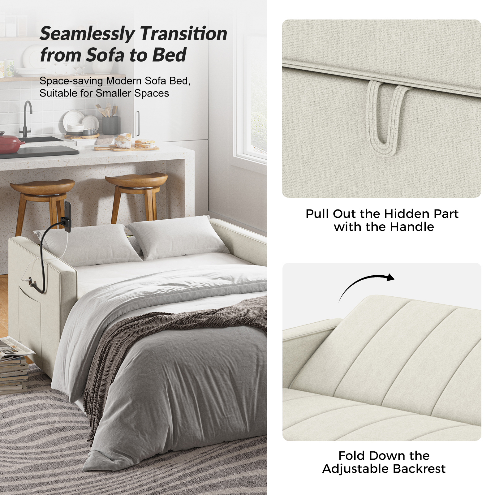 This versatile sleeper sofa is perfect for your living room or office, especially if you don’t have much space! It easily transforms from a sofa to a comfy bed with a smooth pull-out mechanism. It’s great for reading, relaxing, or catching some Zzz’s. Keep your devices handy with the built-in mobile phone holder and charge them up with the integrated USB port. The channel stitching and elegant piping details, along with the unique square armrests, add a modern touch. This white linen look fabric sofa is great for guests or everyday use. Dimensions (WxDxH): 53 x 35 x 17-32. Product Weight: 118 lbs. Material: Linen Look Fabric, Manufactured Wood, Original Foam. Color: WHITE. Assembly Required: Yes.