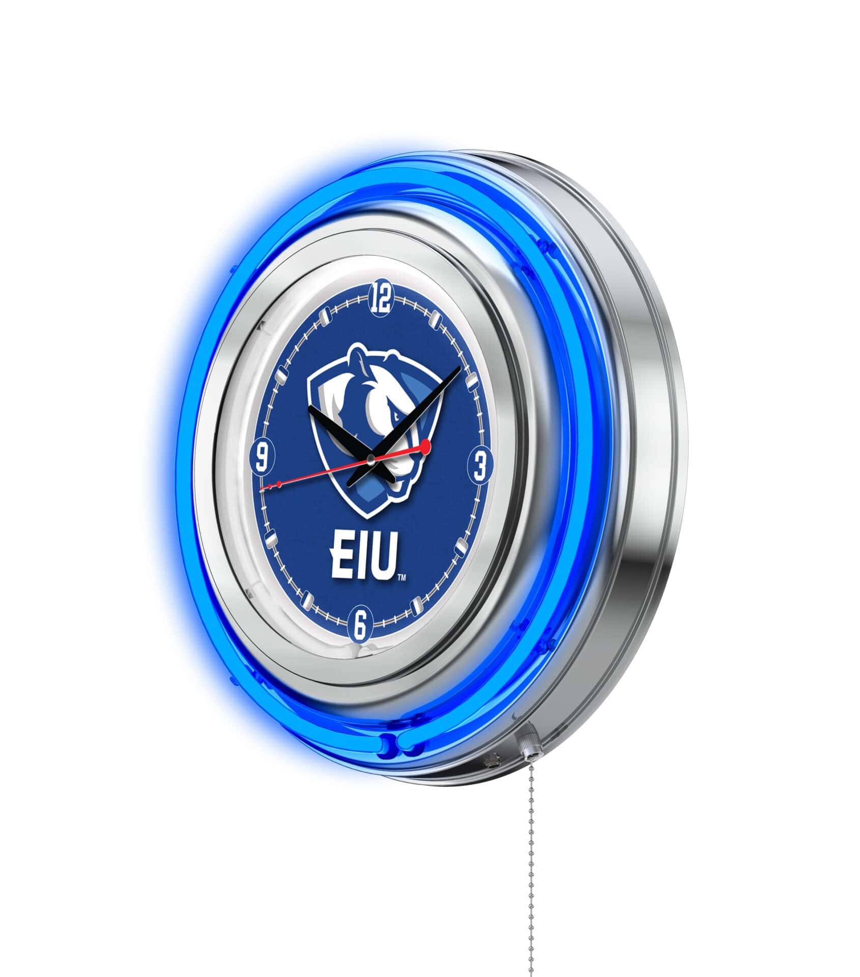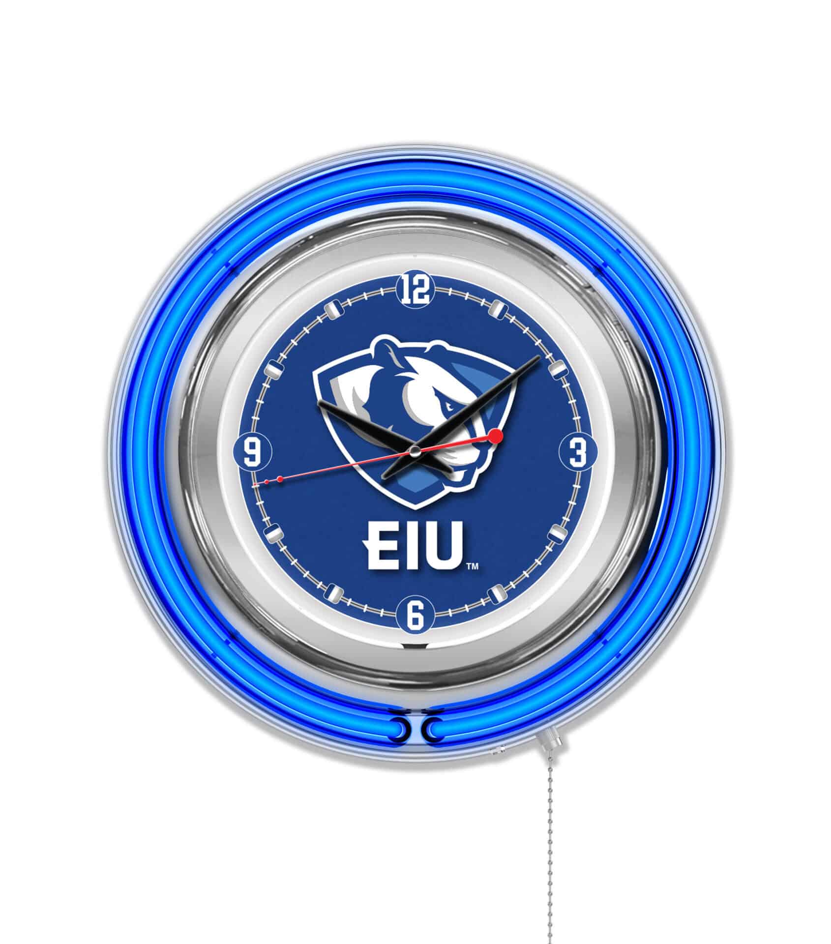 The Eastern Illinois University 15-Inch Neon Logo Clock in Chrome is the ultimate decor piece for any fan’s man cave. With a stunning chrome casing and vibrant team colors, this clock not only serves a functional purpose but also showcases your school pride. The custom printed clock face is illuminated by a brilliant white inner neon ring, creating a captivating look that draws attention. Easily control the neon lights with a pull chain for effortless on/off operation, adding convenience to its stylish design. This clock is powered by a UL Listed transformer, working off a standard 120V outlet, and features accurate quartz movement, ensuring you always keep track of time.