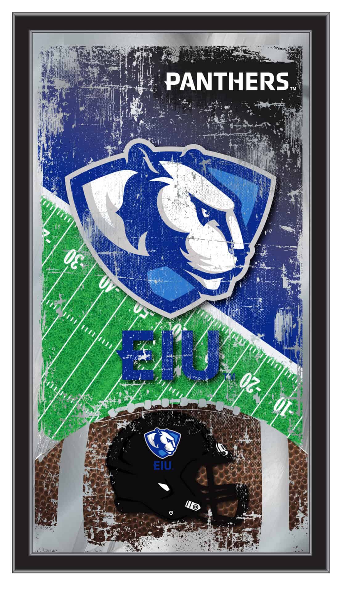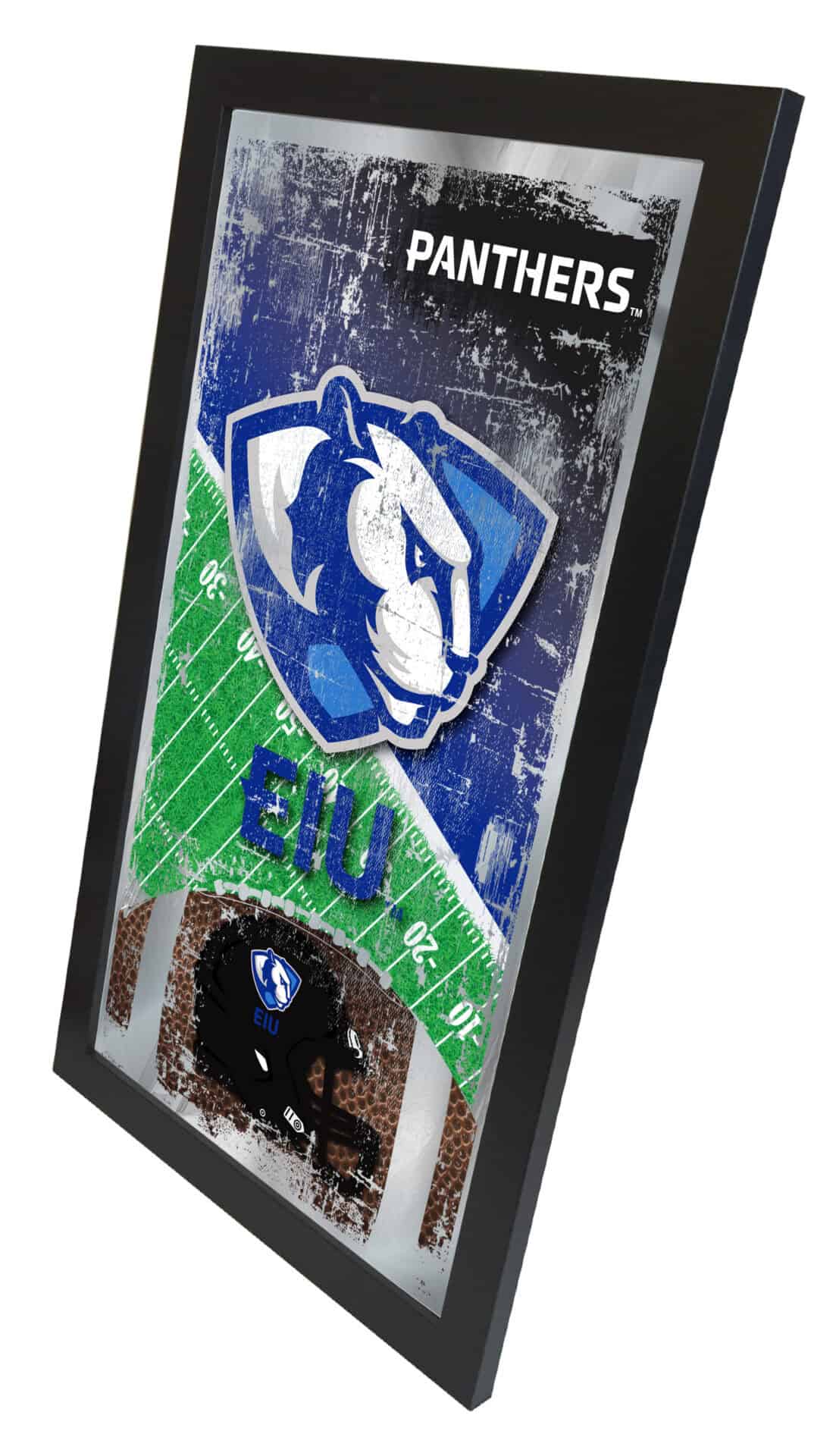 Show your school pride with this officially licensed Eastern Illinois University Football Wall Mirror. Featuring a simple yet elegant design, the vibrant colors are showcased through the 1/8″ thick glass, enhanced by mirrored accents. The mirror is framed in a sleek black, 1 1/4″ wrapped wood frame and comes equipped with dual saw-tooth hangers for easy installation. Measuring 15″ high by 26″ wide, this mirror is perfect for your office, garage, or any room in your home. Ideal as a gift for recent graduates or sports enthusiasts, you can take pride in knowing you are purchasing a mirror that is proudly made in the USA.