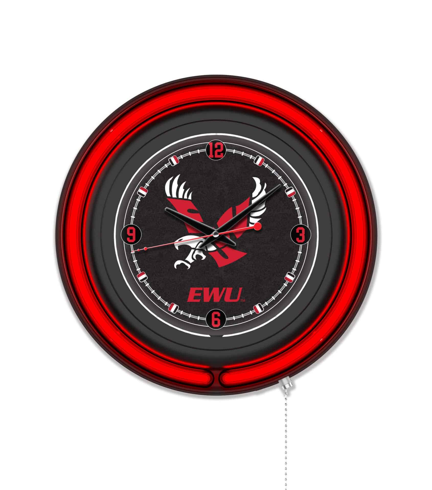 The Eastern Washington University 15-Inch Neon Logo Clock in Black is the ultimate addition to any fan’s space, bringing vibrant school spirit to your man cave. This striking clock features a black casing with a team color-specific neon outer ring that beautifully highlights the custom printed clock face, illuminated by a brilliant white inner neon ring. A convenient pull chain allows for easy on/off operation, while the UL listed power transformer ensures it runs smoothly on a standard 120V outlet. With accurate quartz movement, this clock keeps perfect time powered by a single AA battery (not included). It’s a perfect gift for recent graduates, sports enthusiasts, or a treat for yourself.