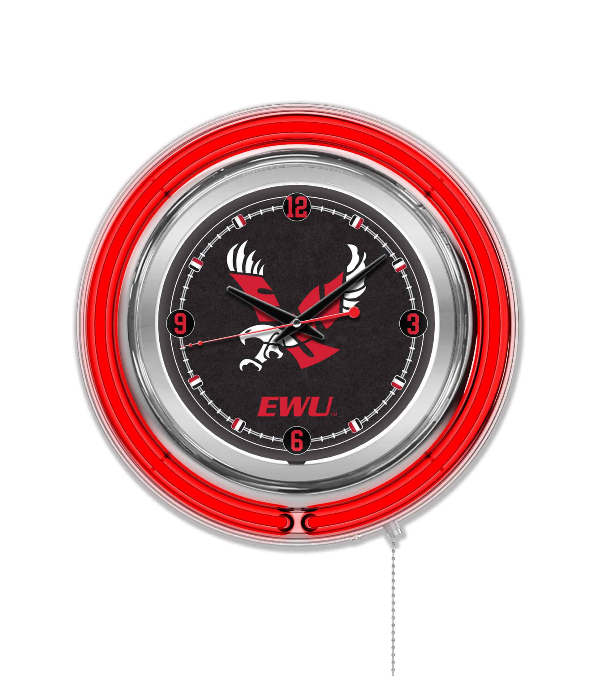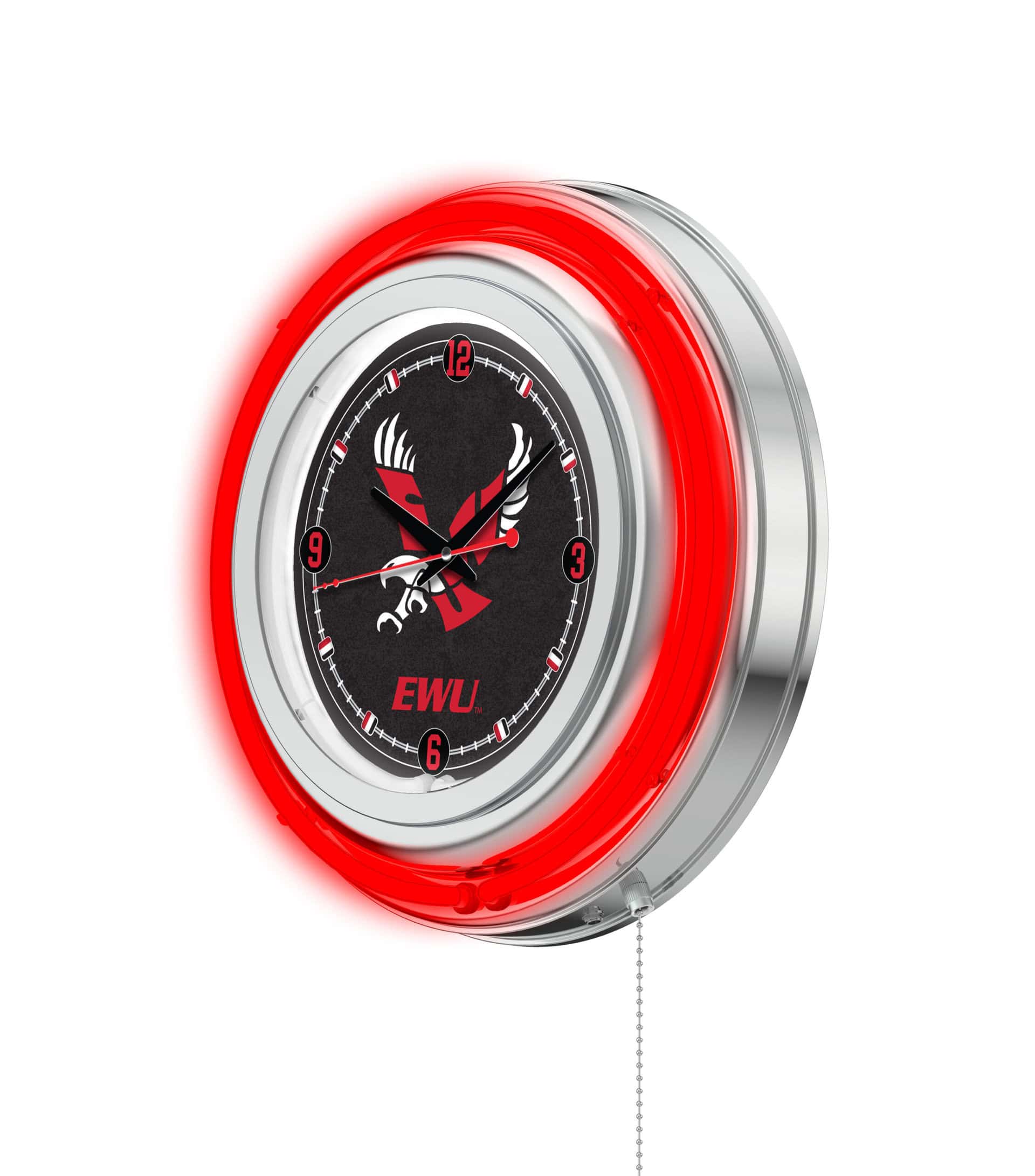 The Eastern Washington University 15-Inch Neon Logo Clock in Chrome is a stunning addition to any man cave, showcasing your school pride with vibrant, full-color artwork. This eye-catching clock features a chrome casing and a neon outer ring in team colors, beautifully illuminating the custom printed clock face with a brilliant white inner neon ring. The neon rings can easily be turned on and off with a convenient pull chain located at the bottom of the clock. Designed for accuracy, this clock operates on a single AA battery (not included), ensuring you always know the time while enjoying the glow of neon.