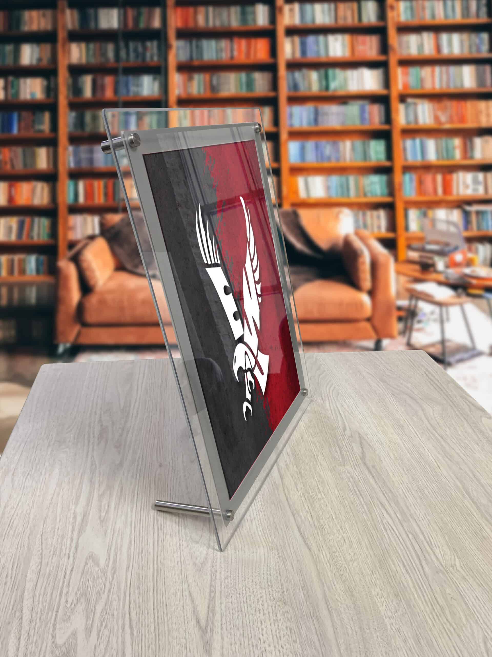 - Mounting: Includes hardware for wall mounting (1″ Stand-offs) or desktop display (3 3/4″ foot).