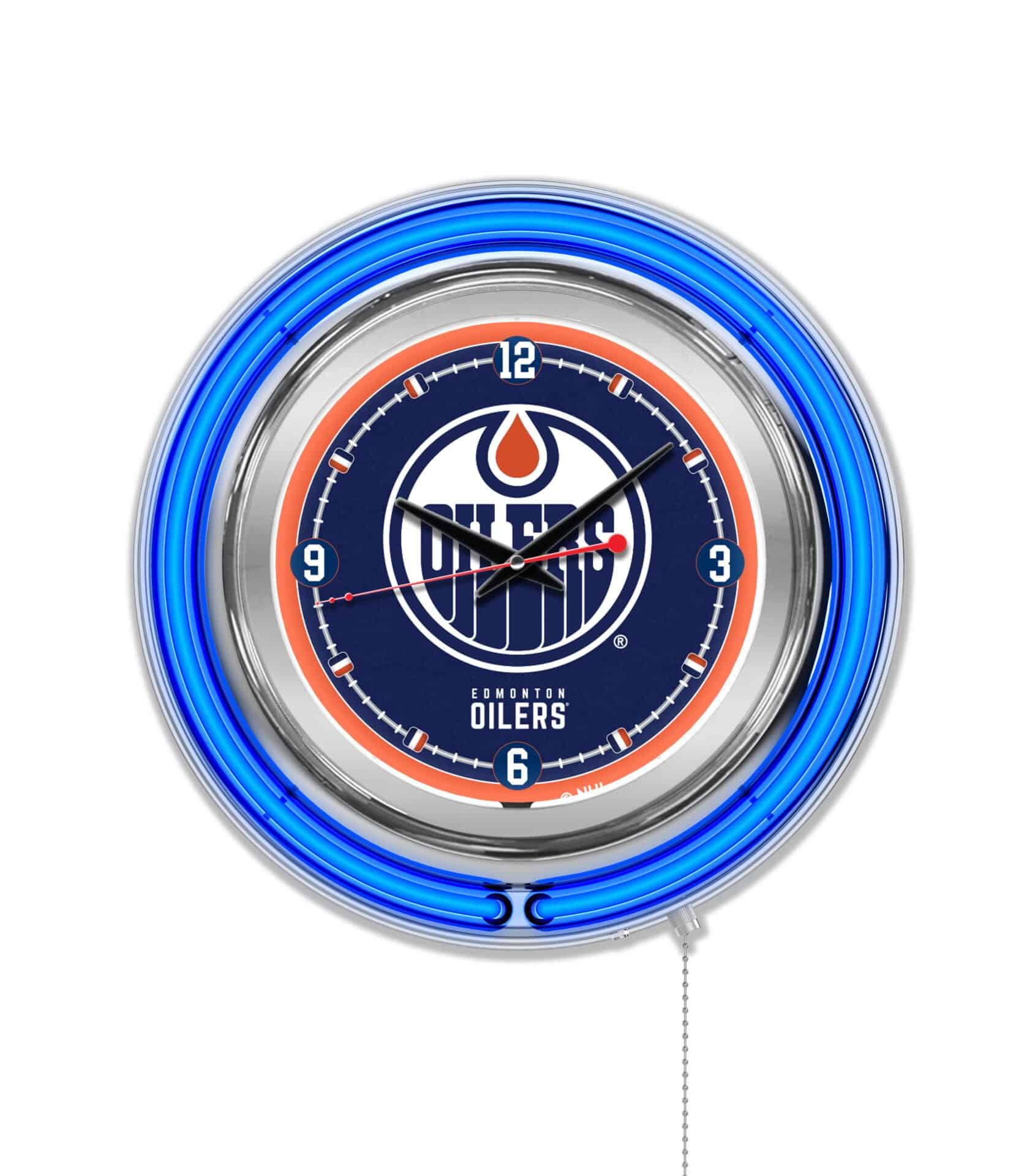 The Edmonton Oilers 15-Inch Neon Logo Clock in Chrome is the ultimate addition to your man cave, allowing you to showcase your team pride while keeping perfect time. Featuring a sleek chrome casing and a vibrant neon outer ring that highlights the custom printed clock face, this timepiece is illuminated by a brilliant white inner neon ring. With an easy-to-use pull chain for turning the neon on and off, and accurate quartz movement powered by a single AA battery, this clock is both functional and stylish. Perfect as a gift for the sports super fan in your life or for personal enjoyment, this clock combines aesthetics with practicality.