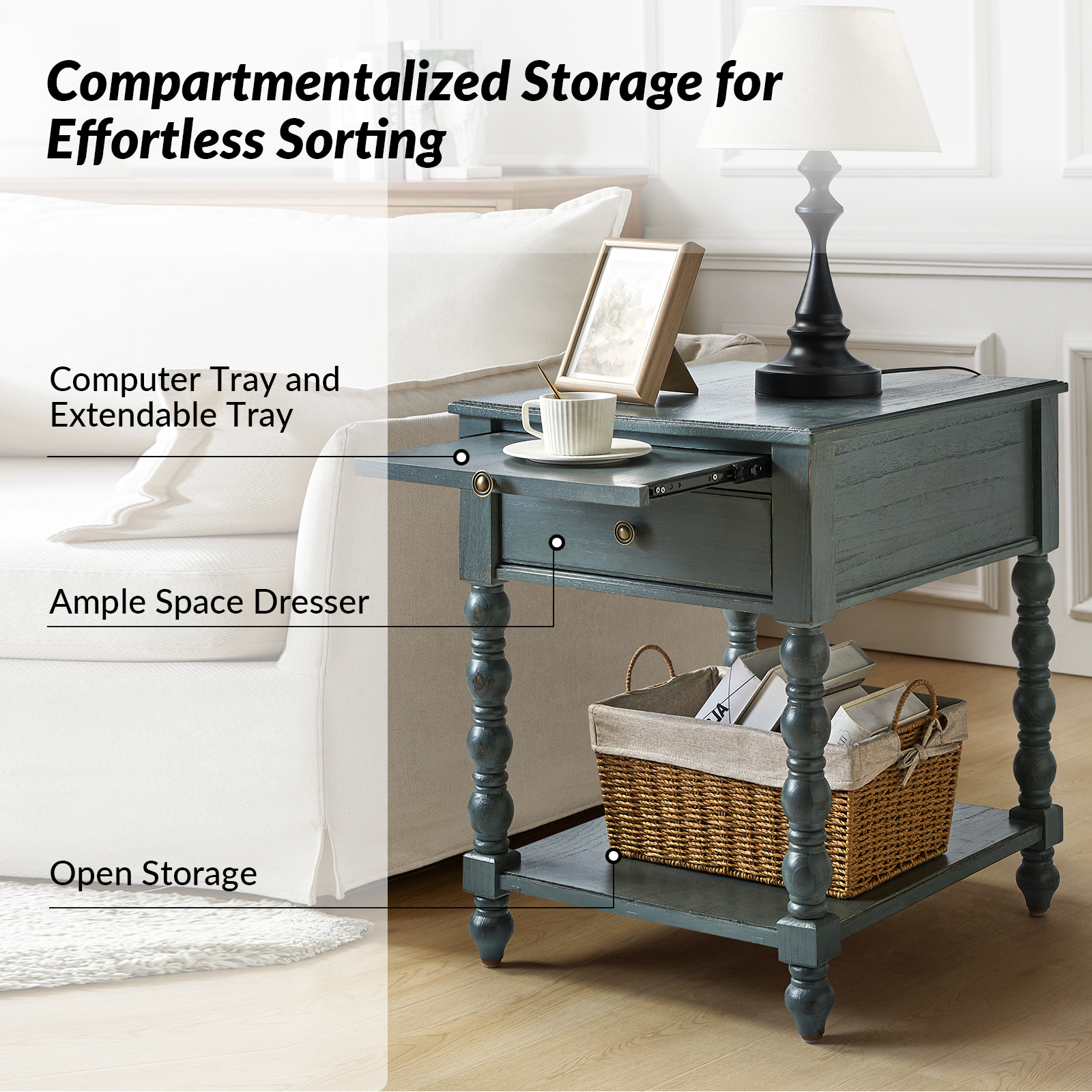 Eric Blue Farmhouse Solid Wood End Table with Charging