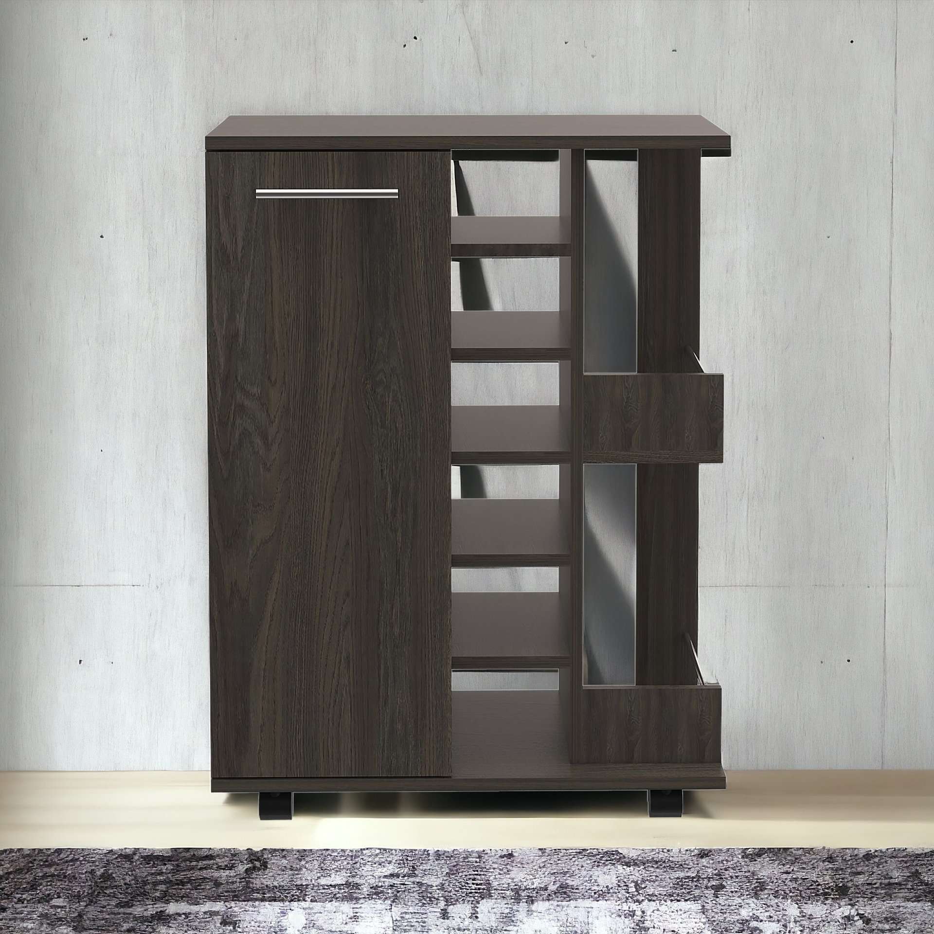 The Espresso Rolling Bar Cart With Wheels and Wine Storage combines functionality and style, making it a perfect addition to any man cave, living room, or entertaining space. This freestanding cart features a sleek espresso finish and a contemporary design that complements modern interiors. It is crafted from durable particle board and manufactured wood, offering long-lasting quality. With a built-in wine storage capacity of up to 6 bottles, multiple shelves, and cabinets for organized storage, this bar cart is ideal for hosting gatherings or enjoying a quiet evening at home. Equipped with smooth-rolling wheels, it provides easy mobility for effortless use wherever needed.